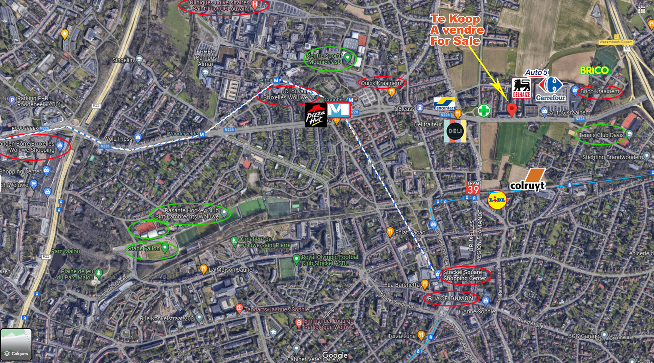 – Juste à côté du centre commercial de Kraainem avec Delhaize & Auto 5, Carrefour, Brico et autres, proche d’écoles, de crèches, du centre sportif du Mounier, du tram 39, du ring, à 700 m. du métro Kraainem, de Saint-Luc/UCL, près de Stockel, de restaurants… etc.