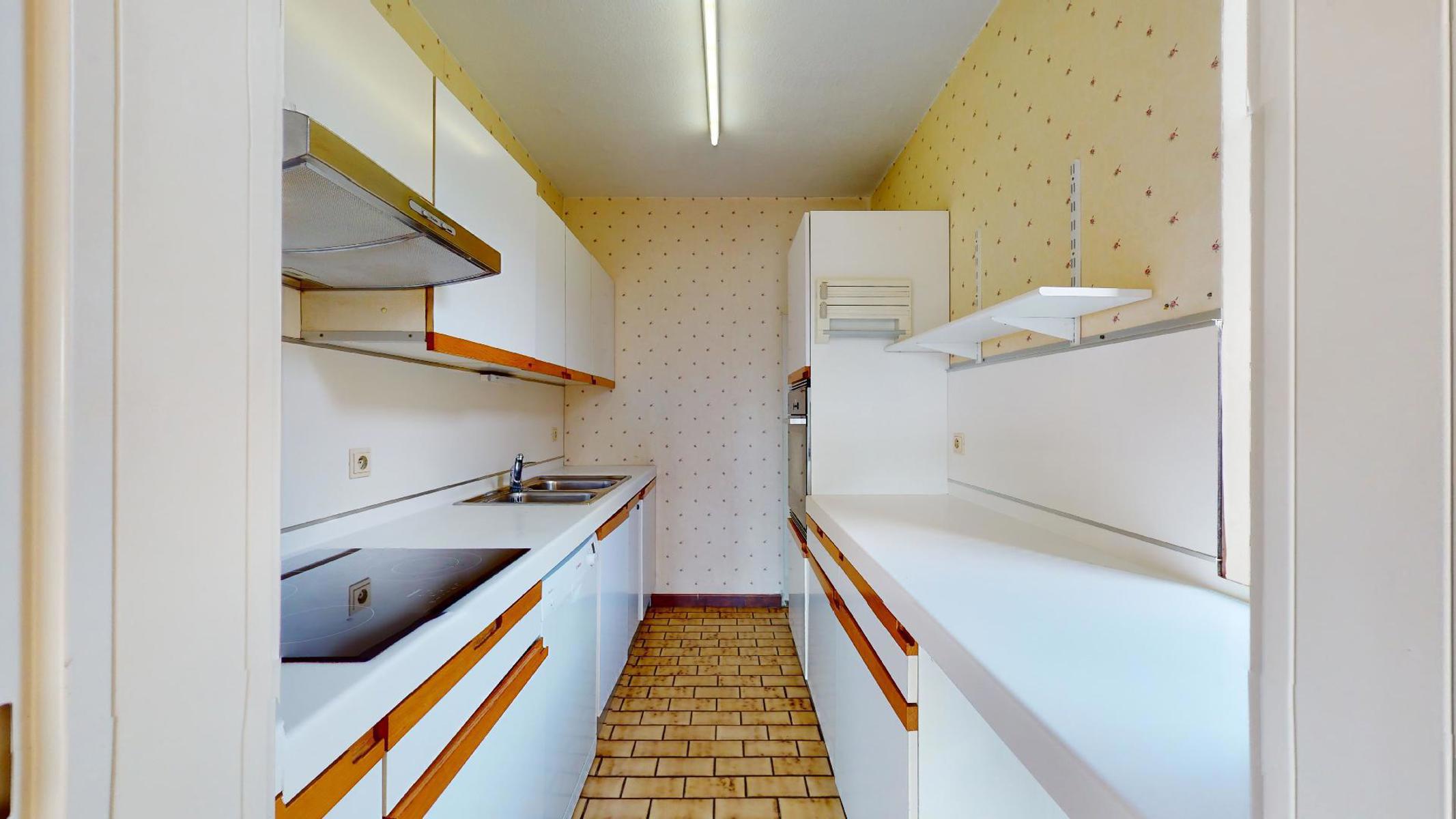 hall d’entrée de 5 m² – spacieux living de 42 m² avec 4 grandes baies vitrées dont 2 coulissantes donnant sur la belle terrasse de +-10 m² (orientée E-S-E) – Cuisine à rénover mais super-équipée avec électros récents.