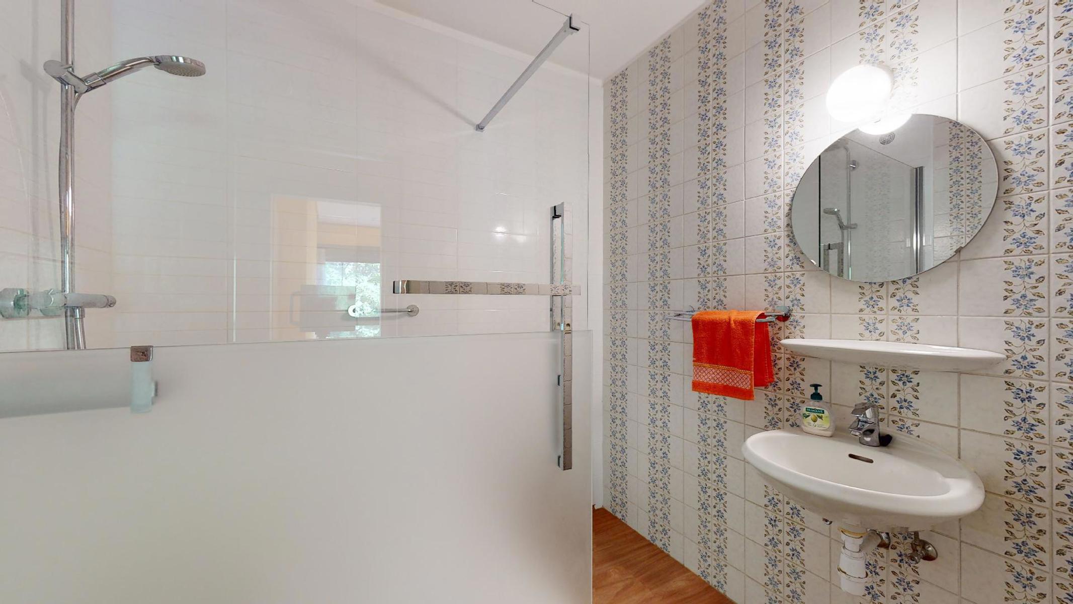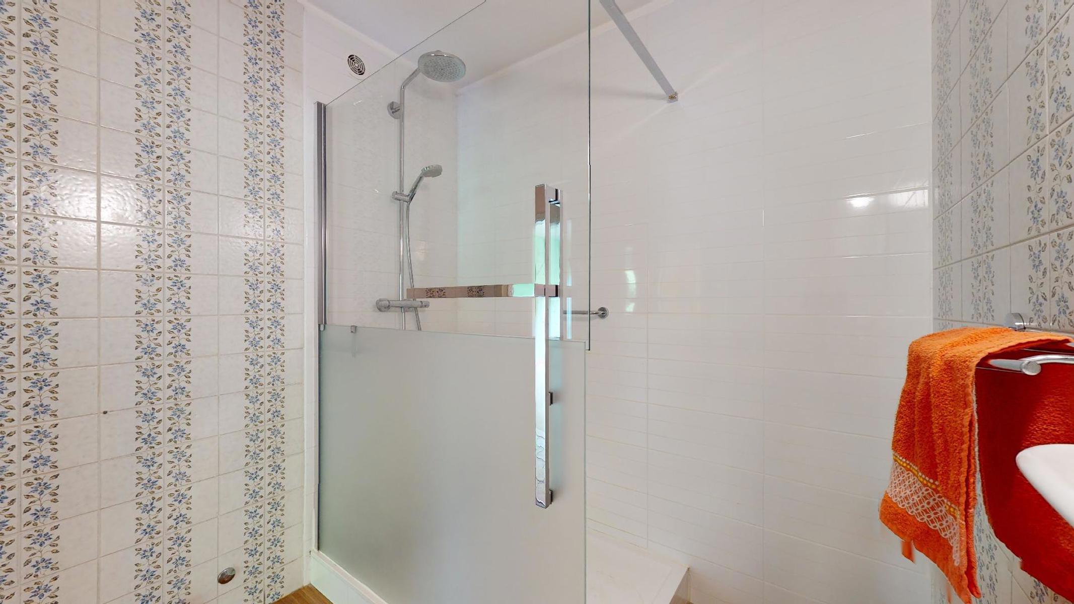 La salle de bain offre en fait une grande douche. WC séparé.