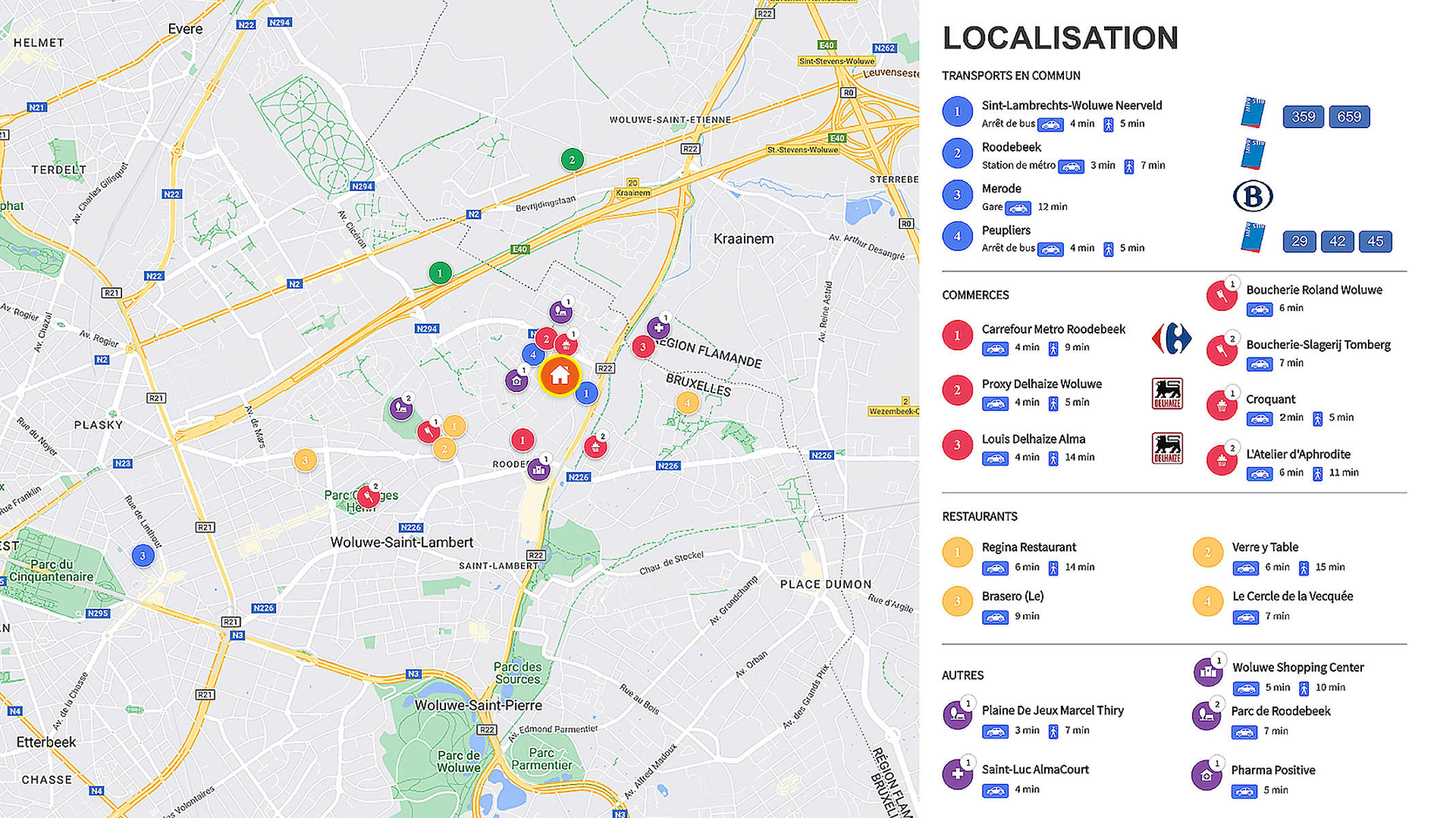 Très bien situé à – de 500 m. de tous les transports (métro-tram-bus), de multiples commerces dont le Woluwe Shopping, d’écoles, UCL-St-Luc et de l’école européenne, au calme dans un parc boisé privé de 3 Ha doté d’une venelle sans voiture et avec terrain de tennis privé où il fait bon vivre …