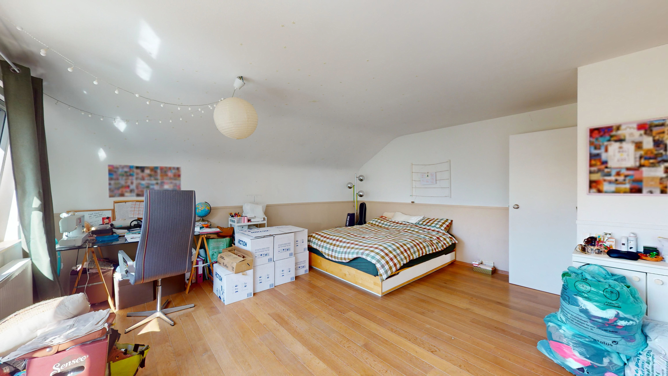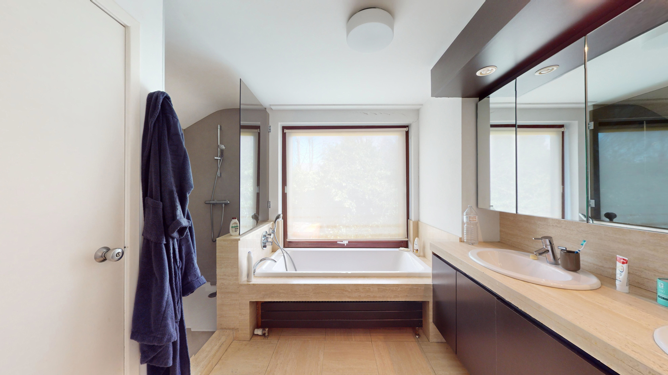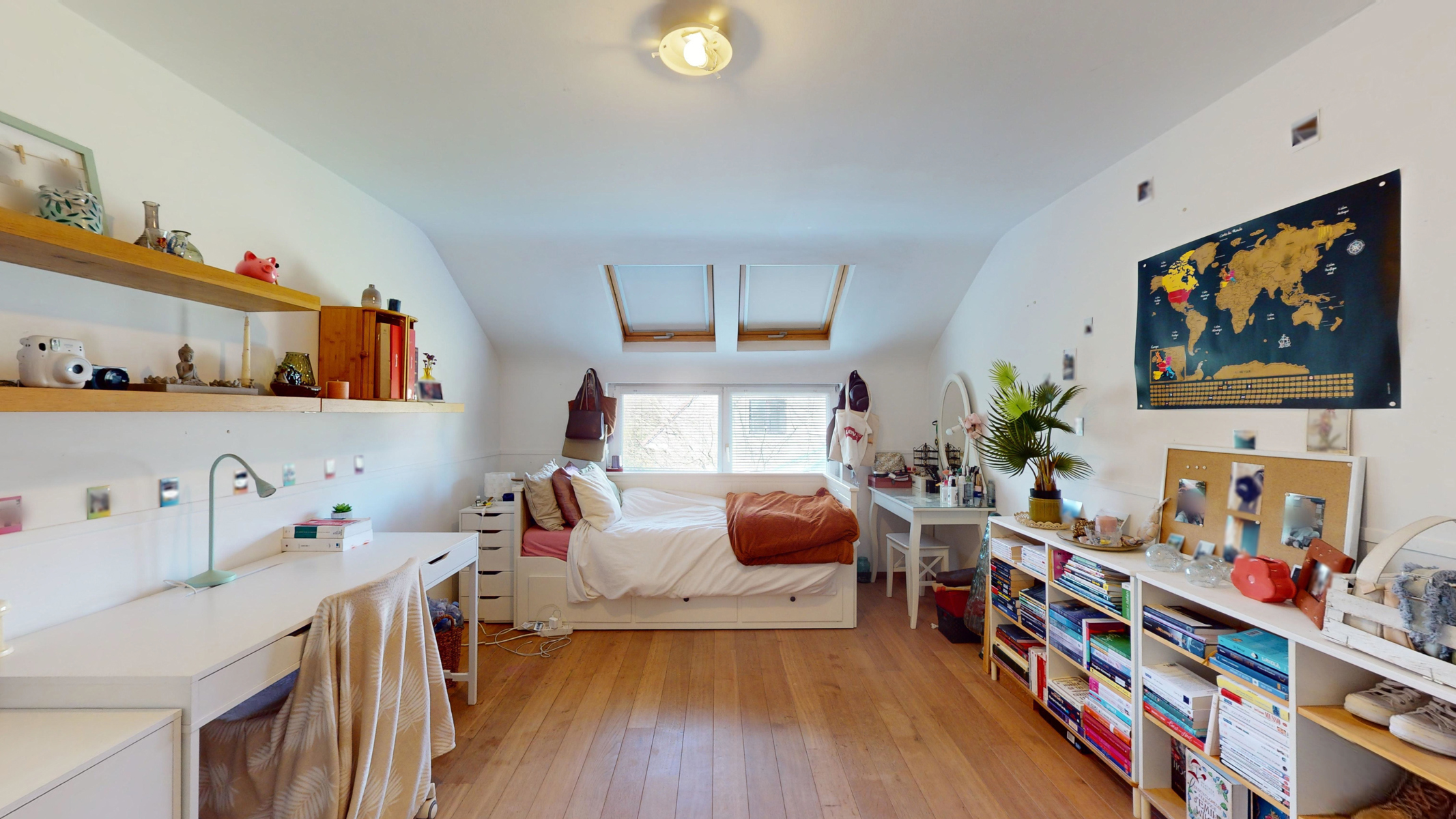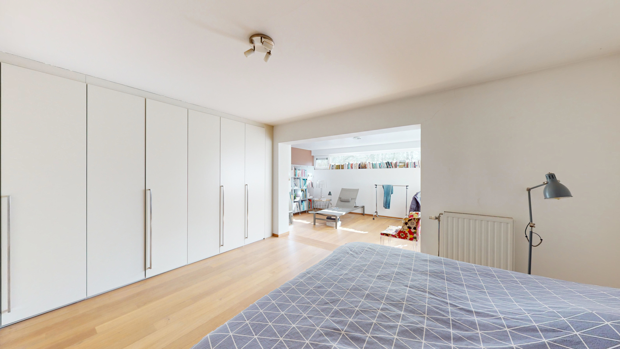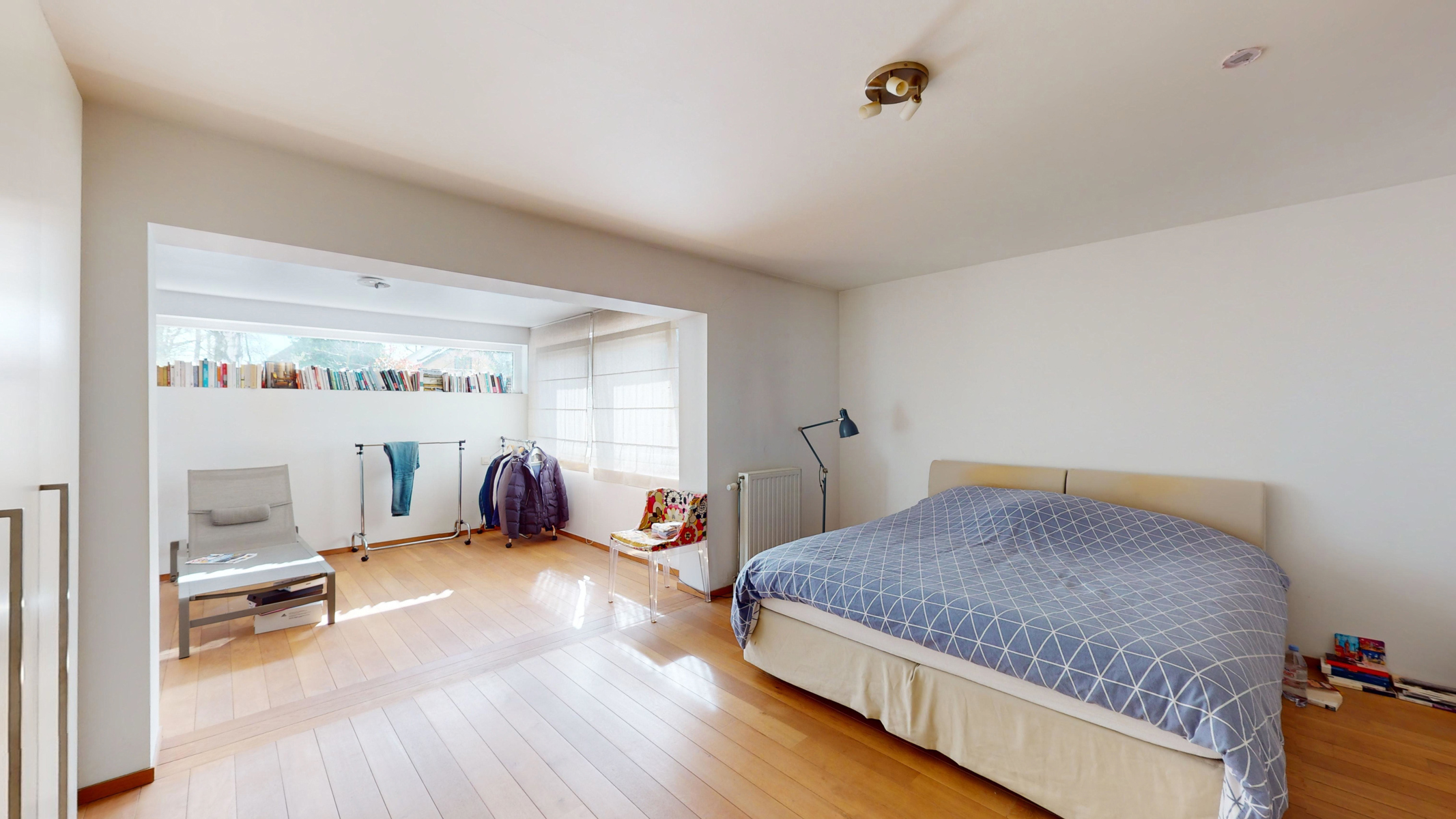 À l’étage, le hall de nuit dessert quatre chambres, dont une splendide suite parentale de +/- 30m2 comprenant sa propre salle de bain et douche, rangement et WC séparés. Sur le pallier, espace bureau cosy (possibilité d’en faire une 5e chambre). Une salle d’eau et un WC séparé sont également présents à cet étage .