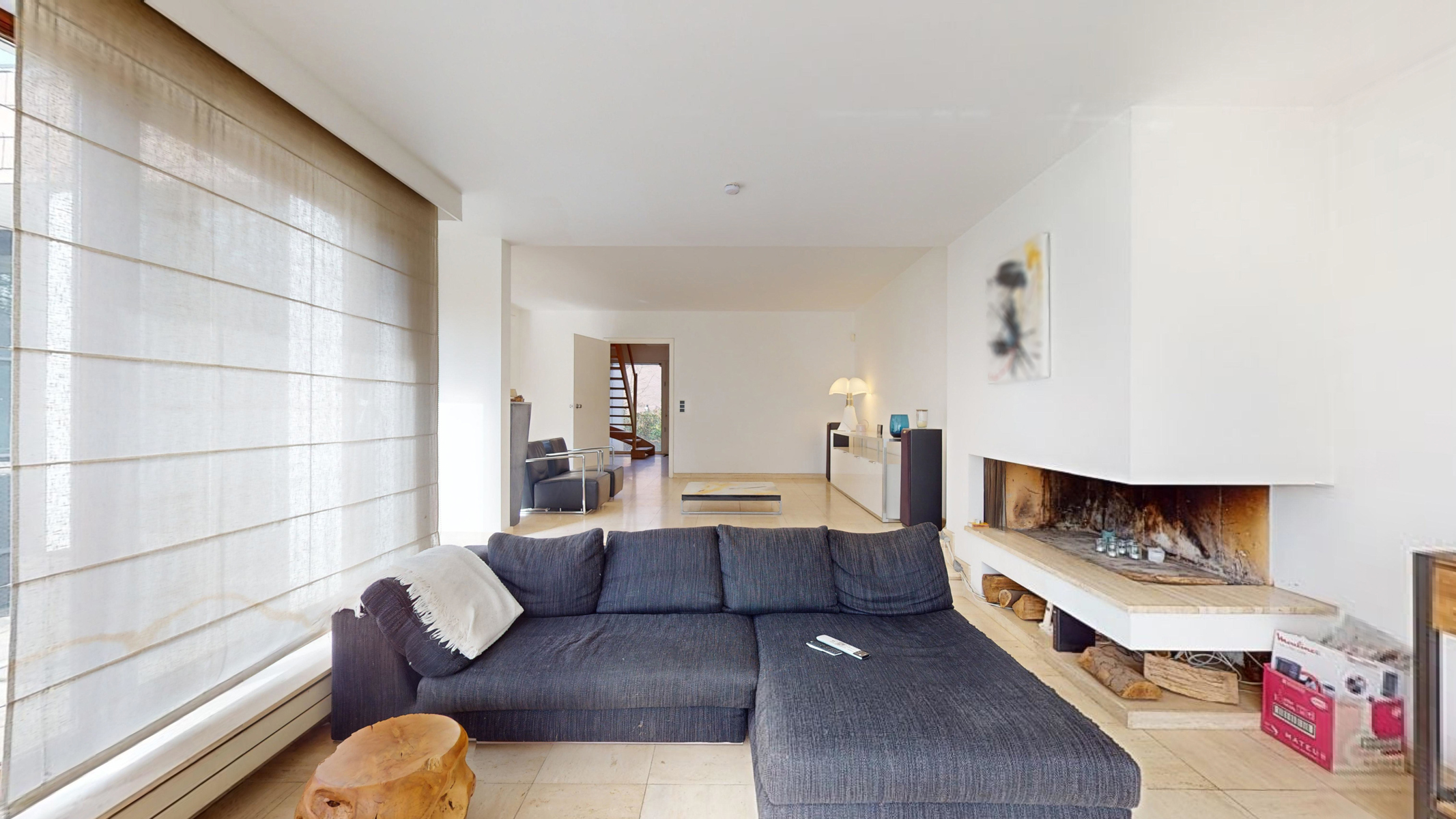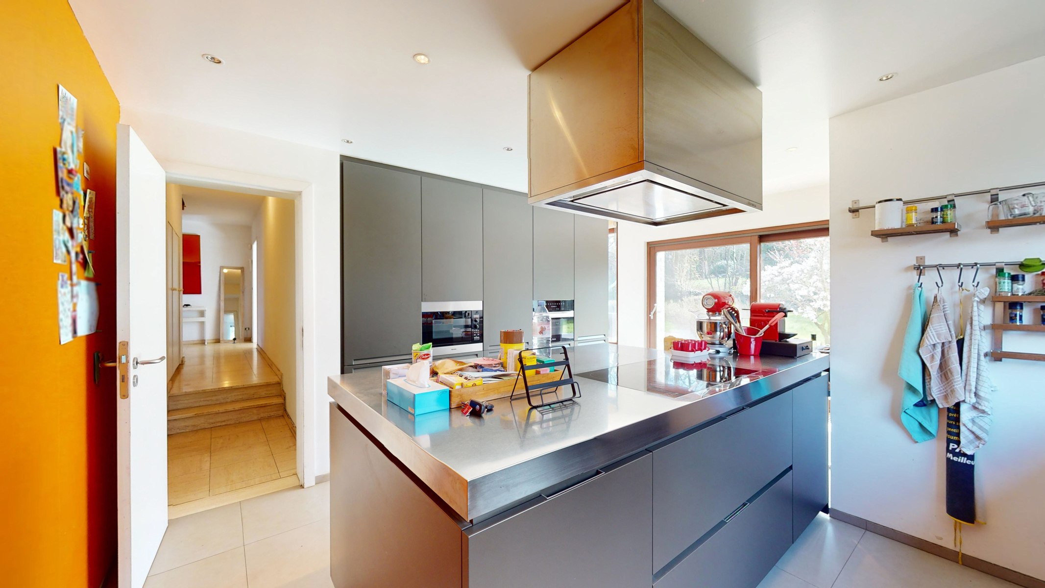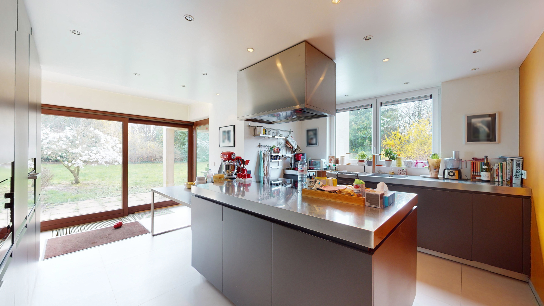 Au rez-de-chaussée, le hall d’entrée avec vestiaire et WC invités s’ouvre sur le vaste séjour lumineux agrémenté d’un feu ouvert. La cuisine avec ilot central est spacieuse et entièrement équipée VARENNA & FOSTER. Un bureau/buanderie et le garage complètent ce niveau.