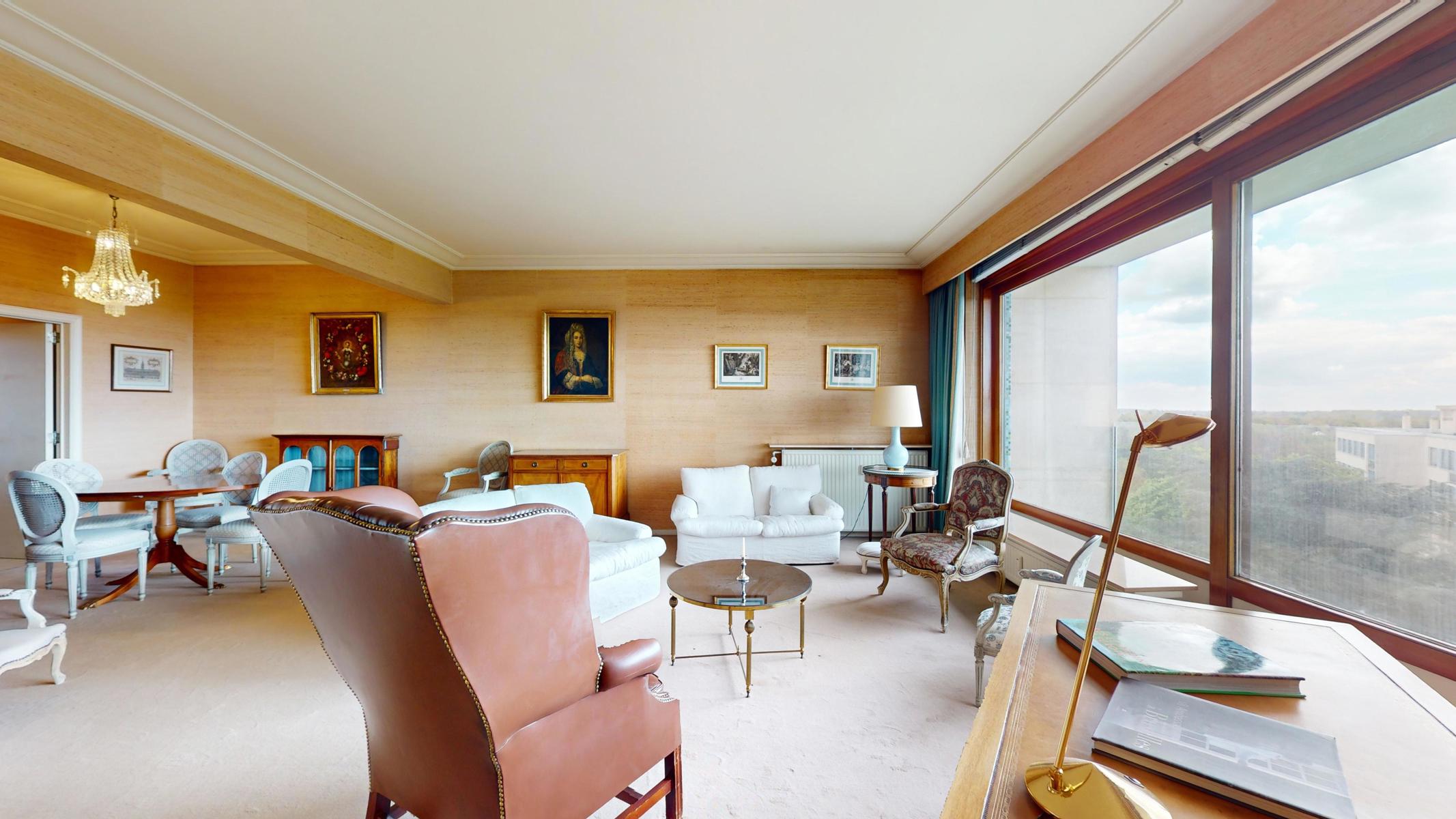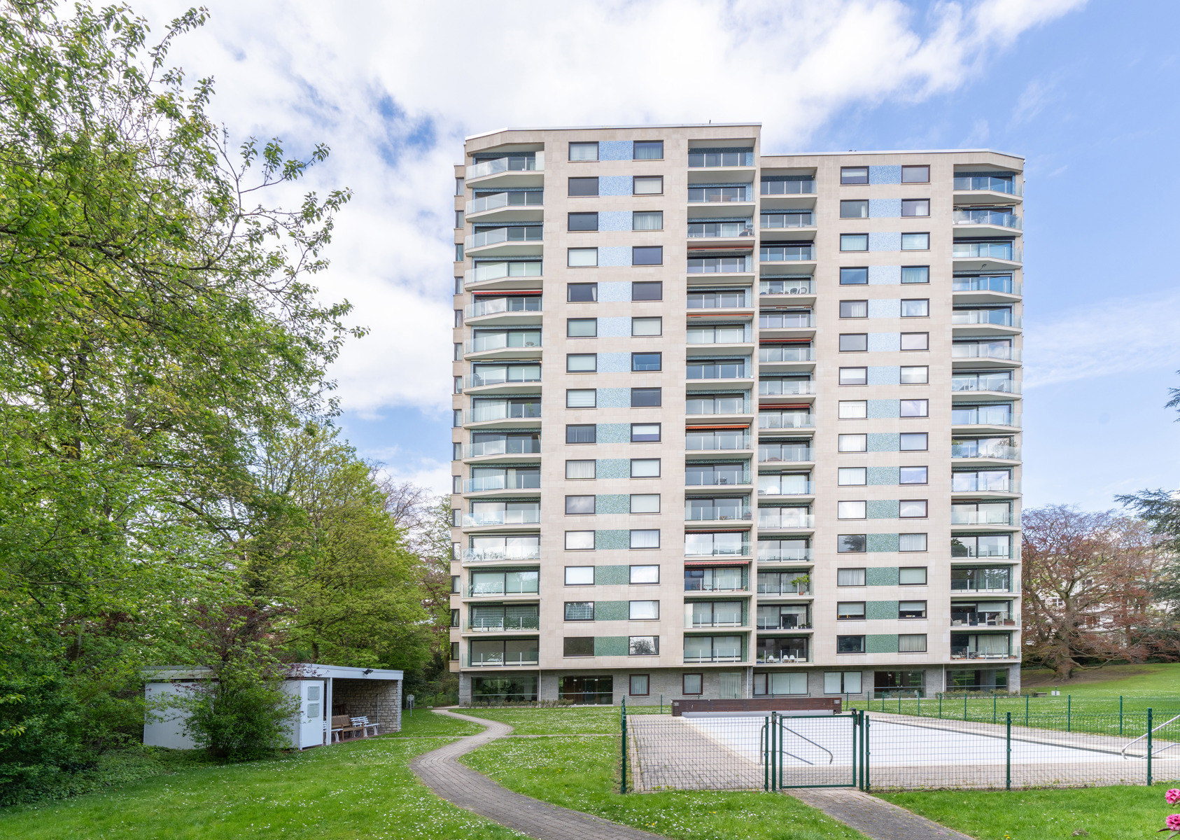 Au cœur du quartier Churchill à Uccle, à proximité du Bois de la Cambre et de la Bascule, By The Way vous présente ce lumineux appartement de +/- 112 m2 (bruts). Il se situe en intérieur d’îlot, dans un vaste parc privatif de haut standing. Sa situation au 8 ème étage permet d’avoir de belles vues sur la nature et sur Bruxelles. Les habitants de la résidence bénéficie d’un cadre privilégié, avec une piscine (extérieure), des jardins communs, un service de conciergerie, des places de parking pour visiteurs, et bien d’autre. Il se compose comme suit : Hall d’entrée; spacieux & lumineux séjour (+/- 42 m2) muni de grandes baies vitrées, terrasse (Sud-Ouest, avec local de rangement), accessible via le séjour; cuisine équipée (+ balcon couvert attenant);. hall (avec espaces de rangement et coin bibliothèque); WC séparé; belle chambre (+/- 22m2), pourvue d’une grande fenêtre (avec une belle vue sur Bruxelles) et salle de bain attenante. Cave INCLUSE. Un garage fermé est disponible EN SUPPLEMENT (+35.000 €). Châssis double vitrage. Chaudière collective au gaz. PEB : C-. Electricité non conforme. Libre d’occupation. Transports communs et commerces à proximité immédiate. Cet appartement bénéficie d’un emplacement privilégié est à découvrir sans tarder !