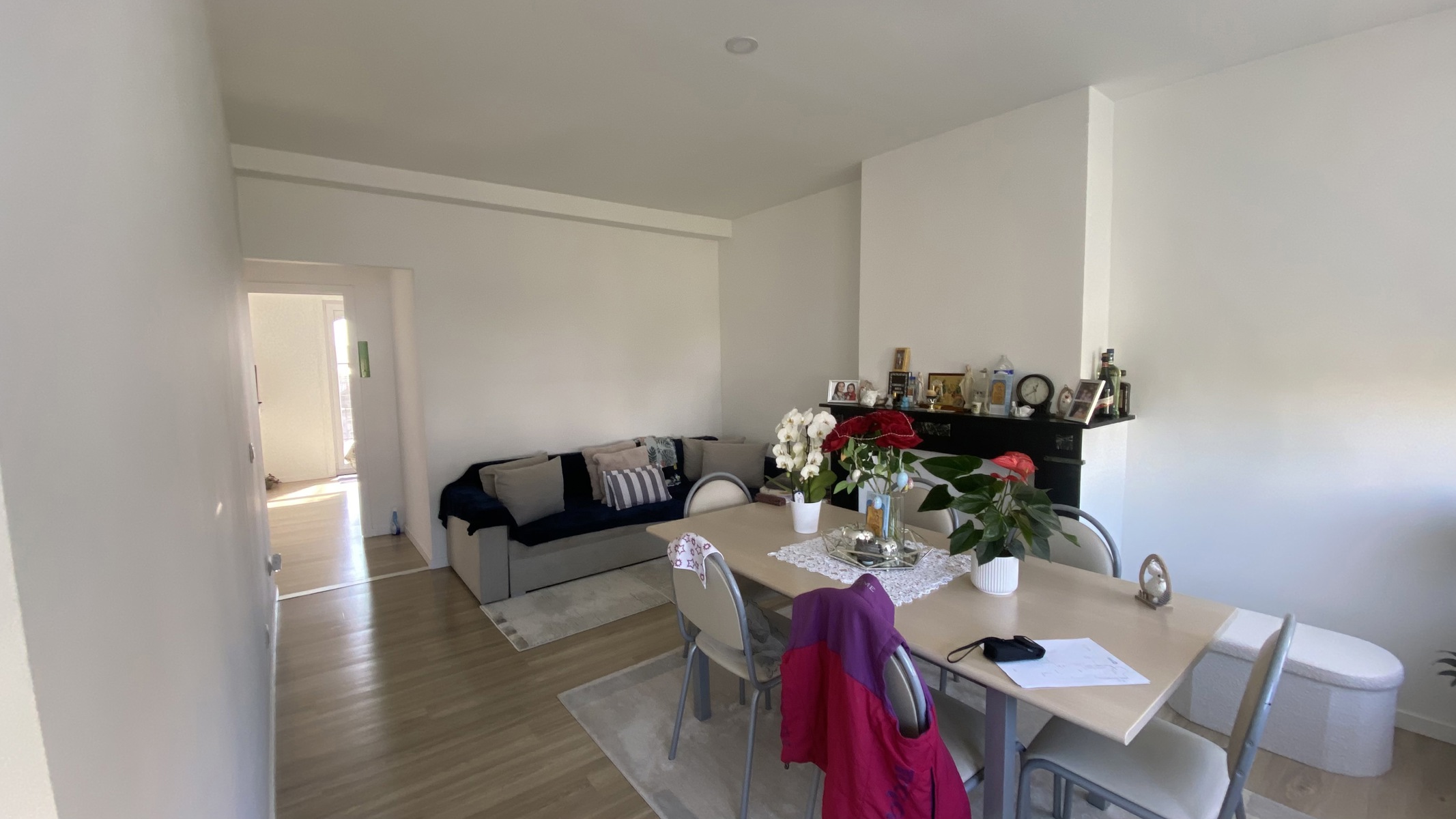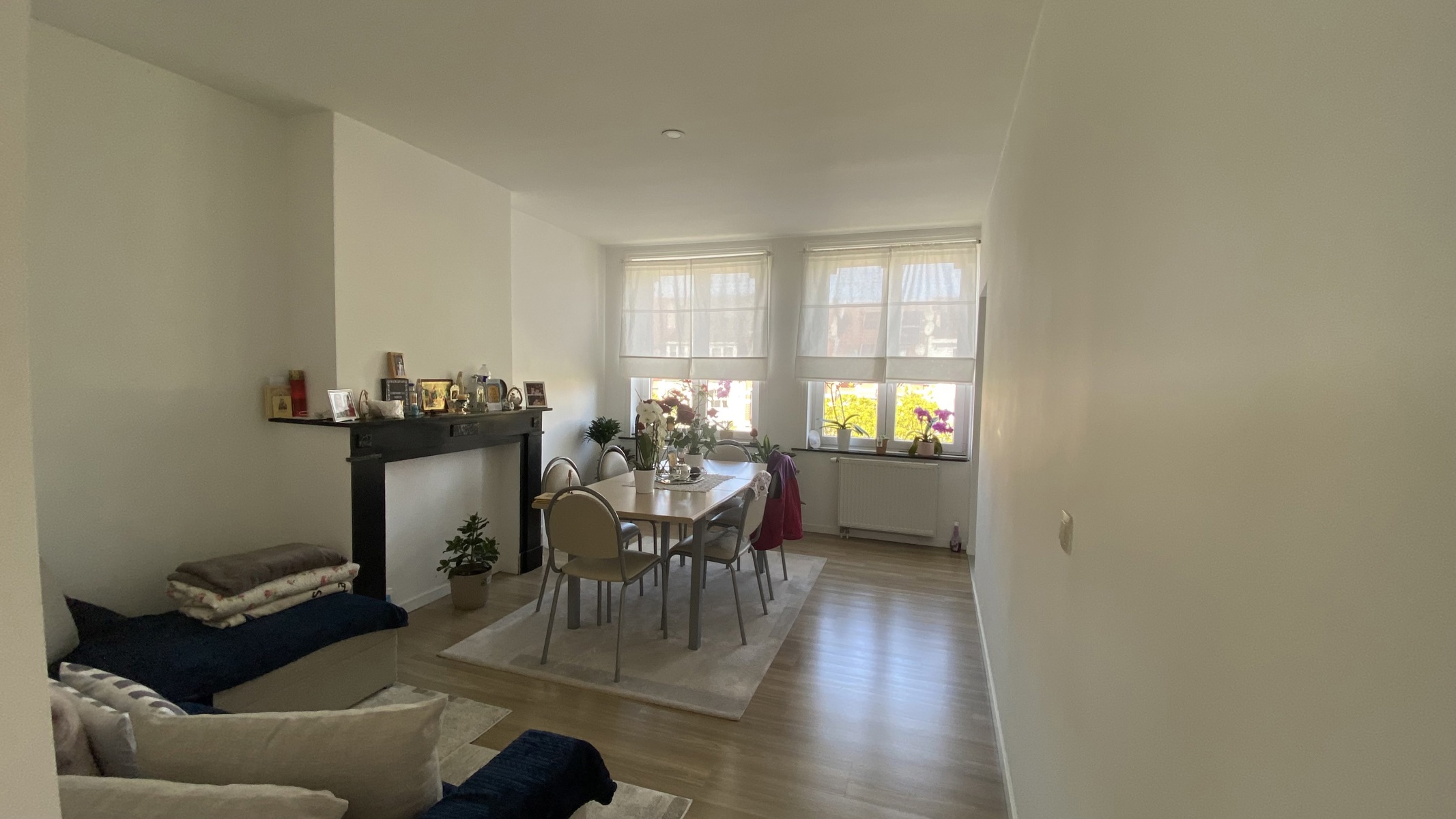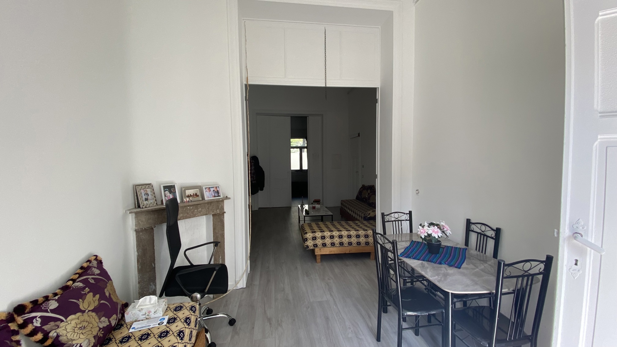 1er étage : appartement 83m² 2 chambres, balcon, salon, salle à manger, cuisine équipée, salle de douche, loyer 825€, PEB = E+.