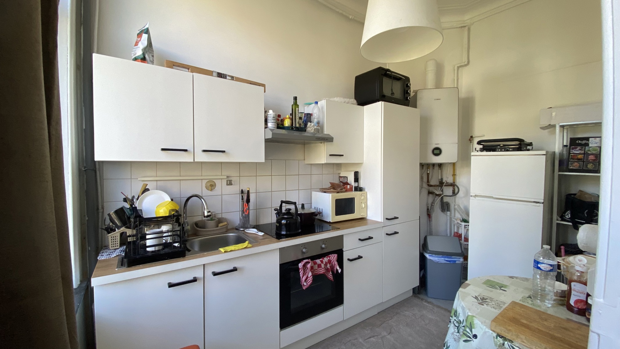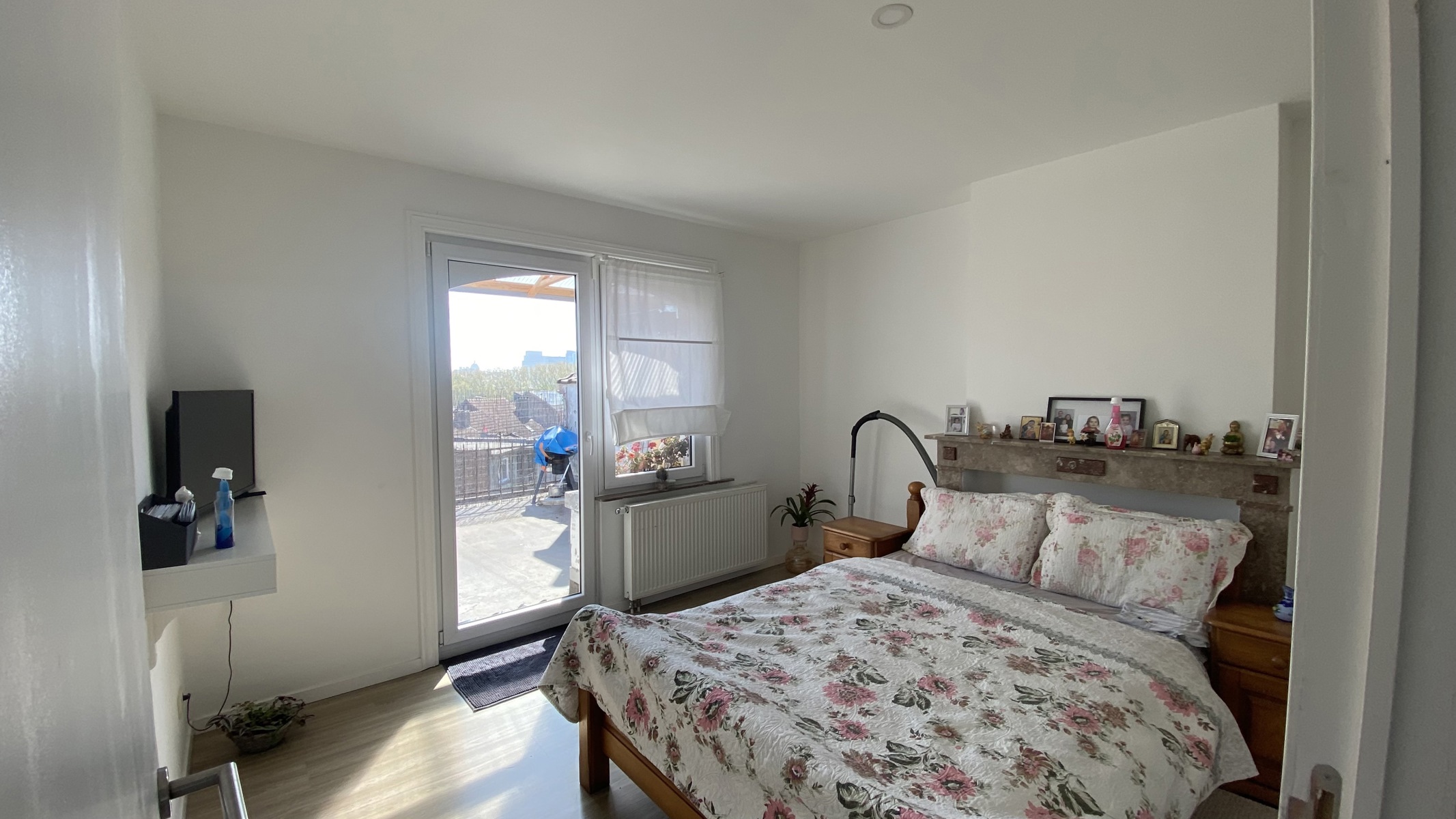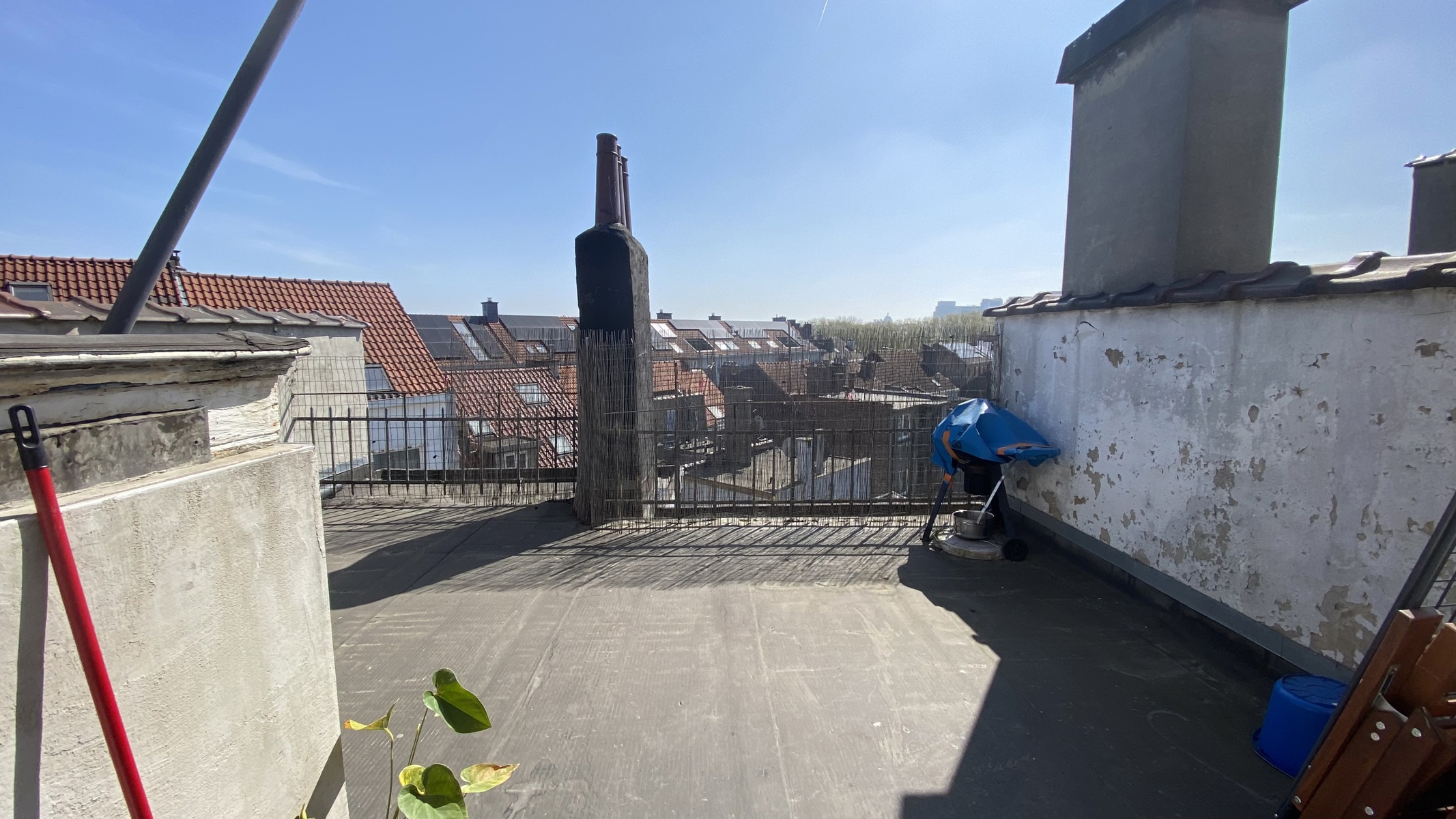 3ème étage : appartement 59m² 1 chambre, salon, cuisine équipée, salle de douche, terrasse 15m², loyer 900€, PEB = G.