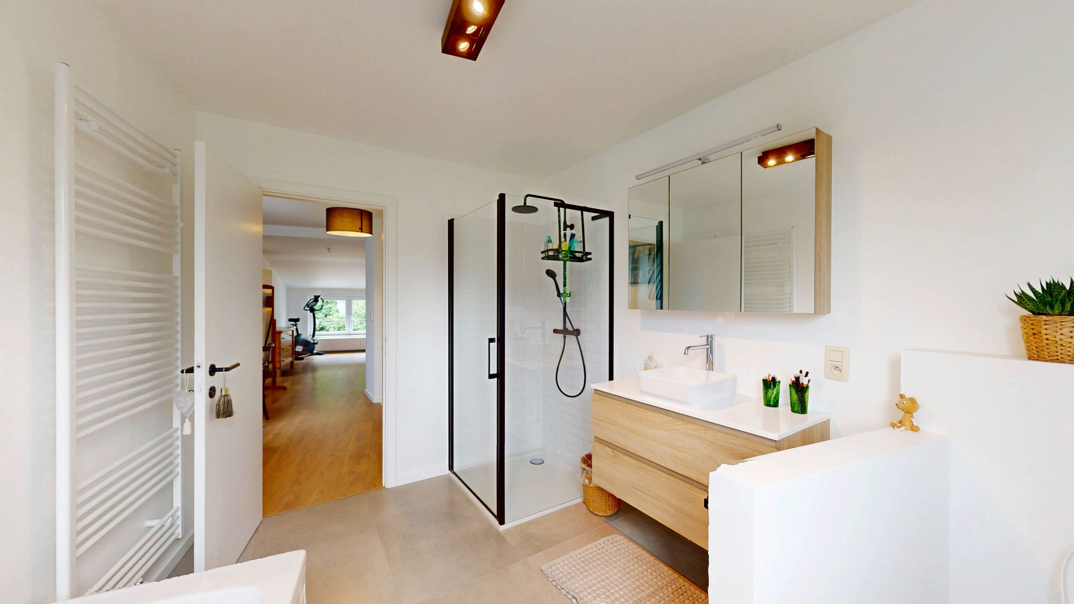 Récemment rénové, il se compose comme suit: le hall d’entrée avec son coin vestiaire donne accès à la buanderie/chaufferie munie d’une toilette séparée et accès au jardin 100% clôturé, grande terrasse orientée sud.