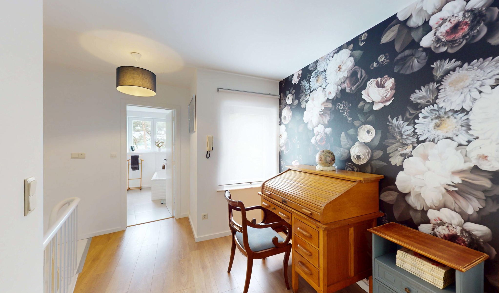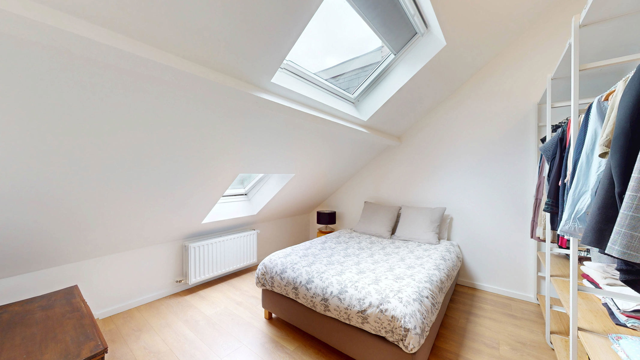 Au second étage nous retrouvons deux chambres et une salle de bain, douche à l’italienne et WC. L’espace bureau assez vaste permettrait l’aménagement d’une troisième chambre.