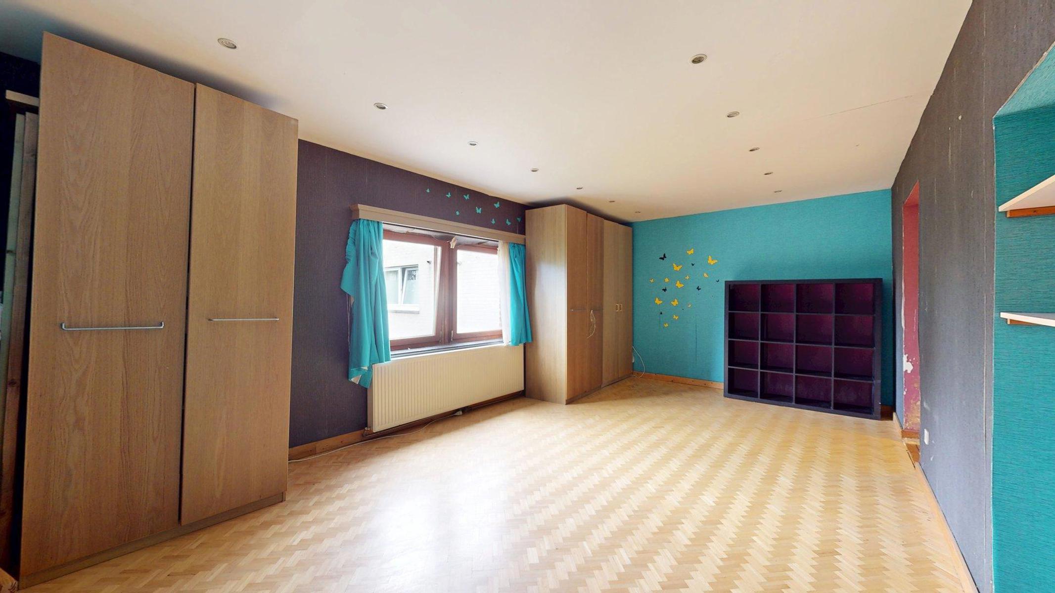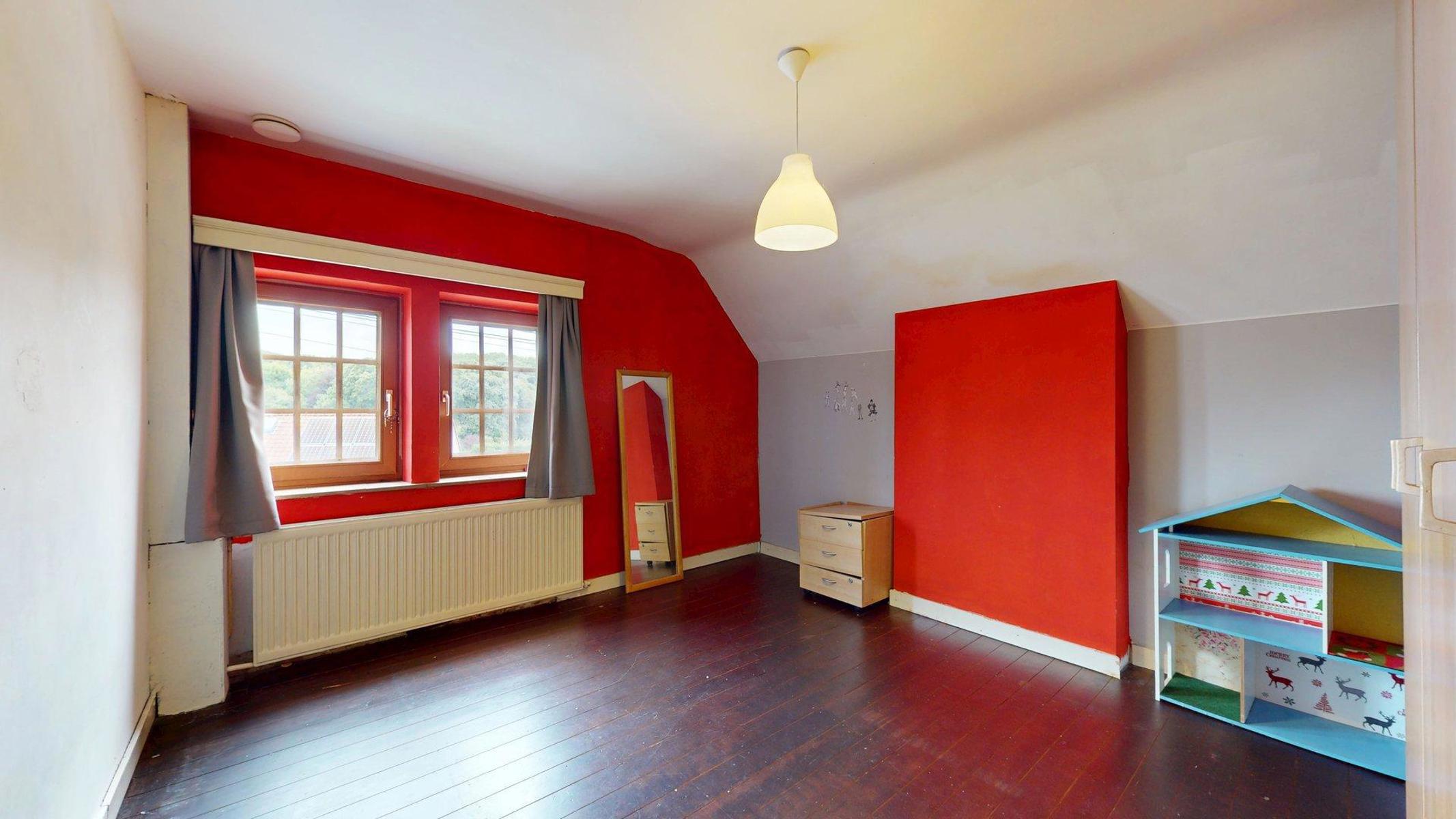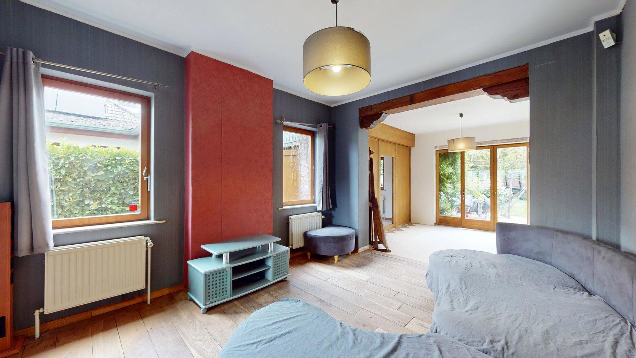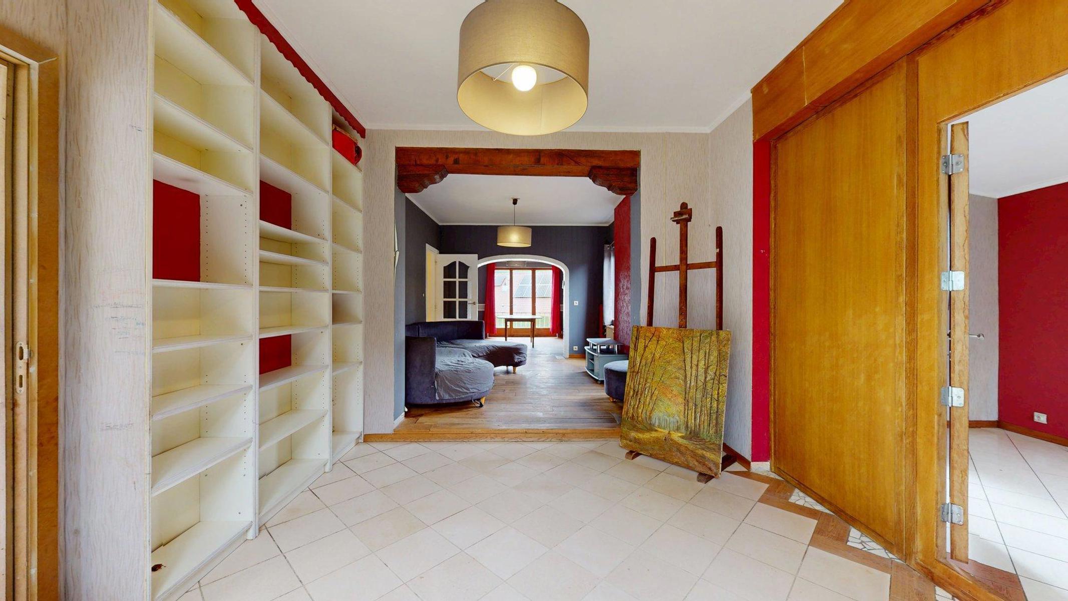 Composée de quatre chambres et de deux salles d’eau, elle est aménagée comme suit: le hall d’entrée avec son accès aux caves et sa toilette séparée mène directement à la vaste cuisine équipée (évier, taque…, hotte,…). Une troisième porte au niveau du hall permet l’accès au séjour traversant composé de son côté salle à manger et de son grand salon avec un accès direct au jardin. Une partie du salon est séparée d’une cloison permettant une profession libérale avec une entrée indépendante.