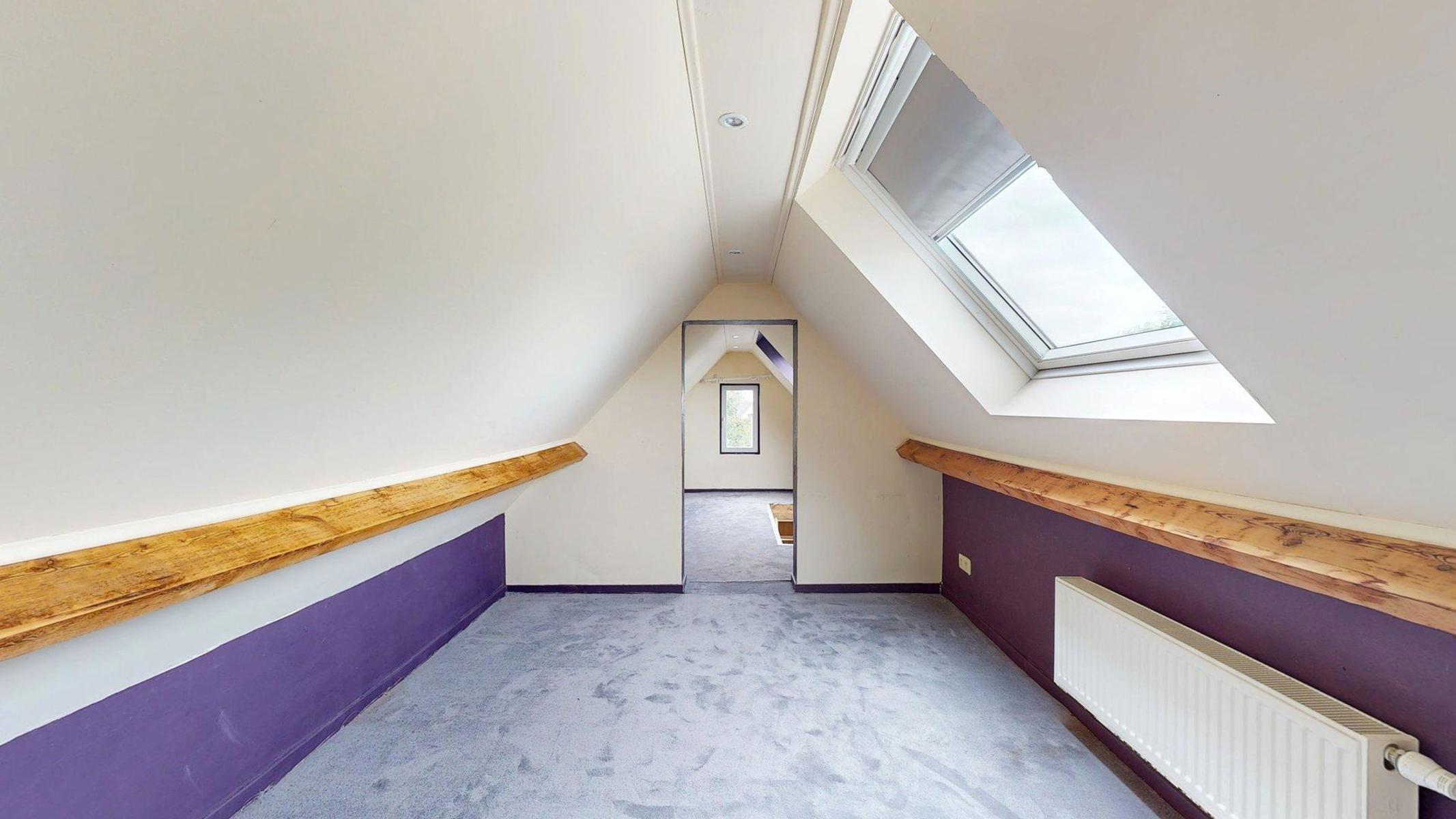 Un escalier en bois mène aux combles qui sont aménagés en quatrième pièce de nuit.