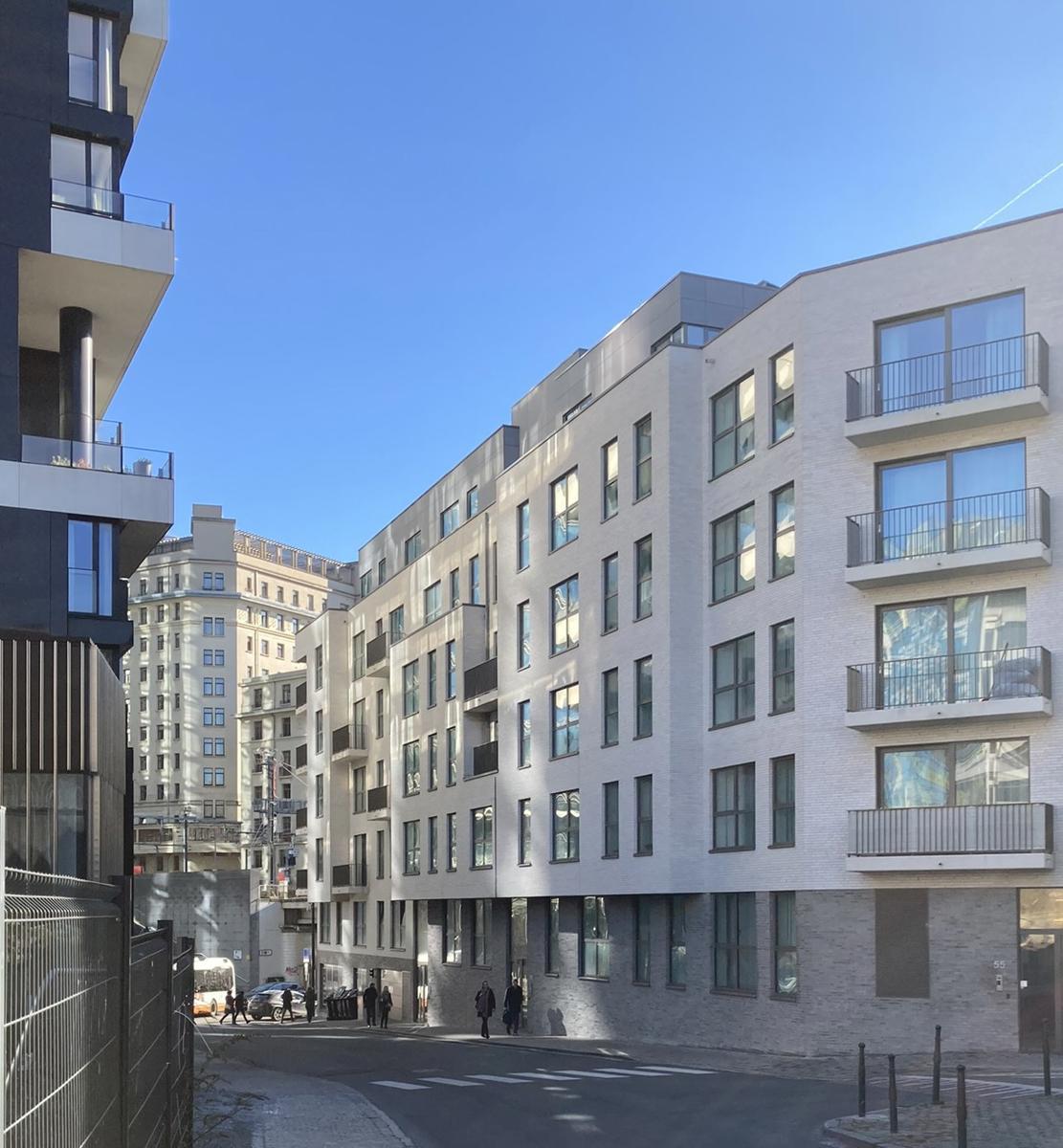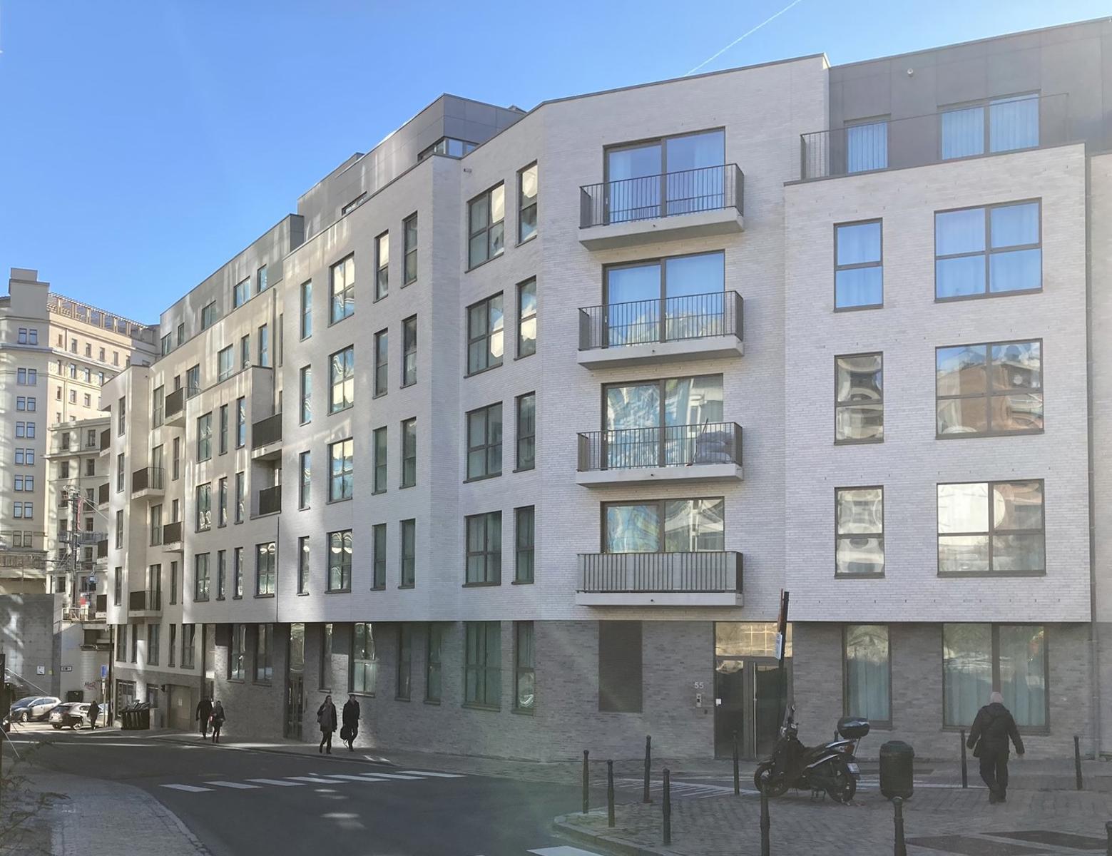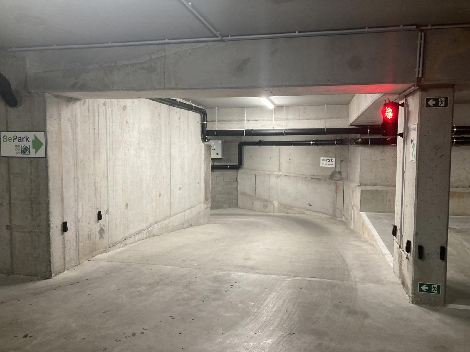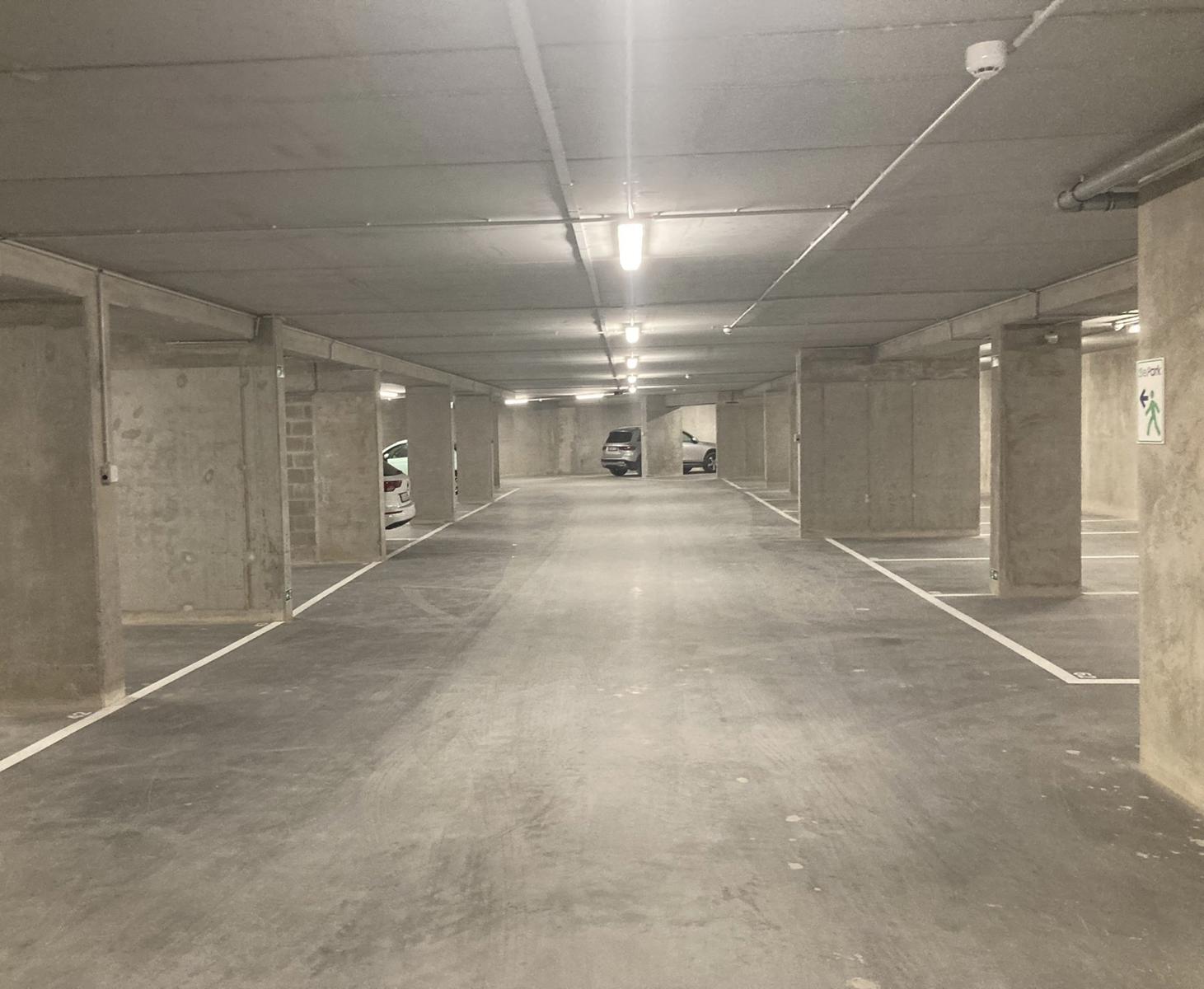 La partie parking, les couloirs et les locaux techniques du sous-sol sont éclairés au moyen de lampes TL dans un luminaire. L’éclairage dans la partie parking est commandé par des détecteurs de mouvement. Dans les locaux techniques, il est commandé par des interrupteurs unipolaires ou bipolaires en saillie. L’éclairage du hall d’entrée, de la cage d’escalier et des paliers est commandé par des détecteurs de mouvement. Le parking en sous-sol est ventilé au moyen d’une ventilation naturelle ou mécanique. L’amenée d’air s’effectue via des ouvertures au sous-sol, et est distribuée dans les parties communes et privatives. La distribution est couplée à un système de détection de CO qui évacue l’air vicié. La finition des sols du parking est réalisée en béton poli semi-industriel. Les emplacements de stationnement sont délimités par des lignes au sol. À chaque niveau de l’immeuble, les paliers d’ascenseur et les cages d’escalier sont équipés d’un éclairage de secours qui, en cas de coupure d’électricité, assure l’éclairage pendant un certain temps. L’immeuble à appartements est équipé de 4 ascenseurs de personnes conformes aux normes belges ainsi qu’aux directives européennes 95/16/CE et EN81-01/1998.