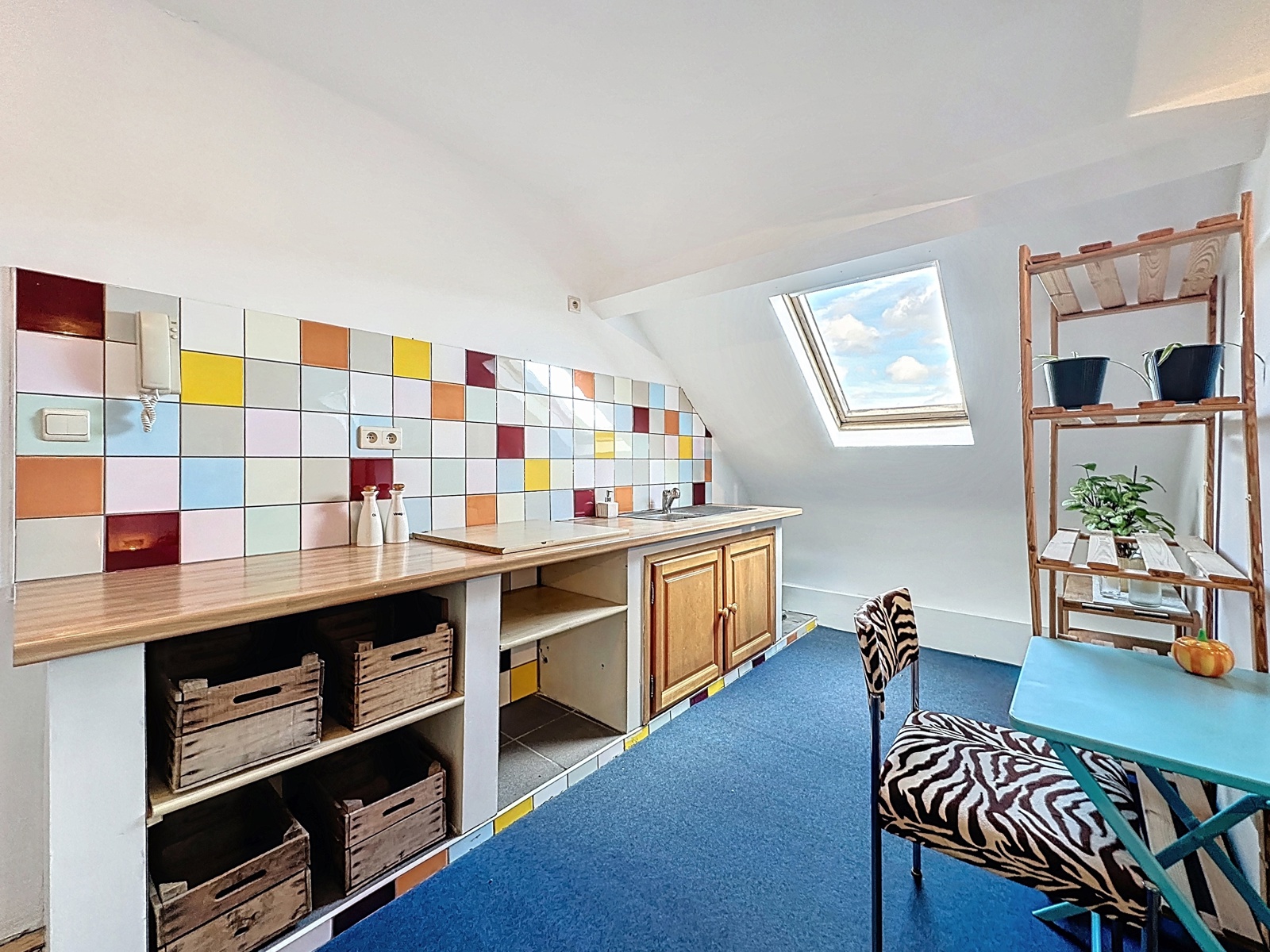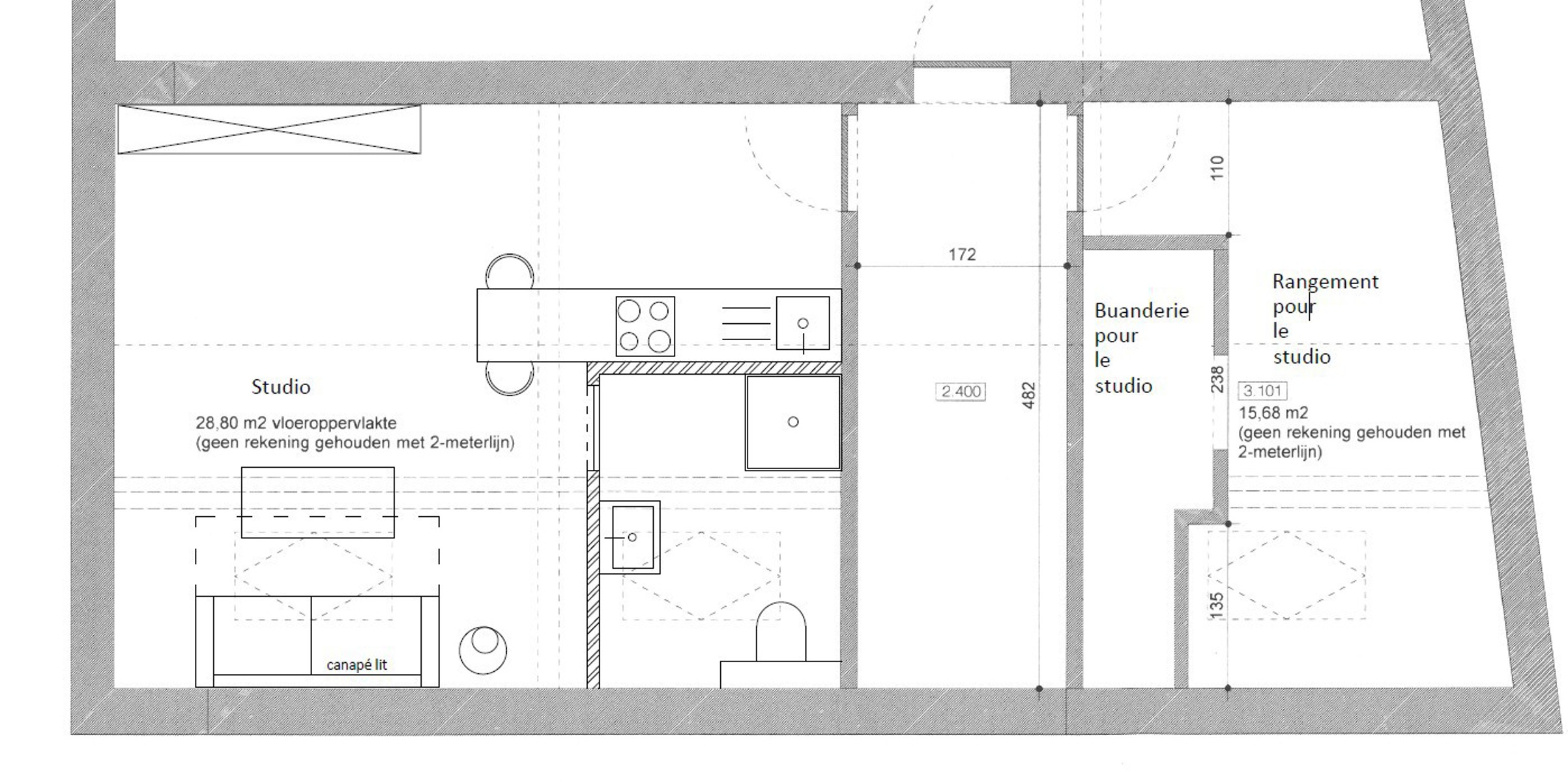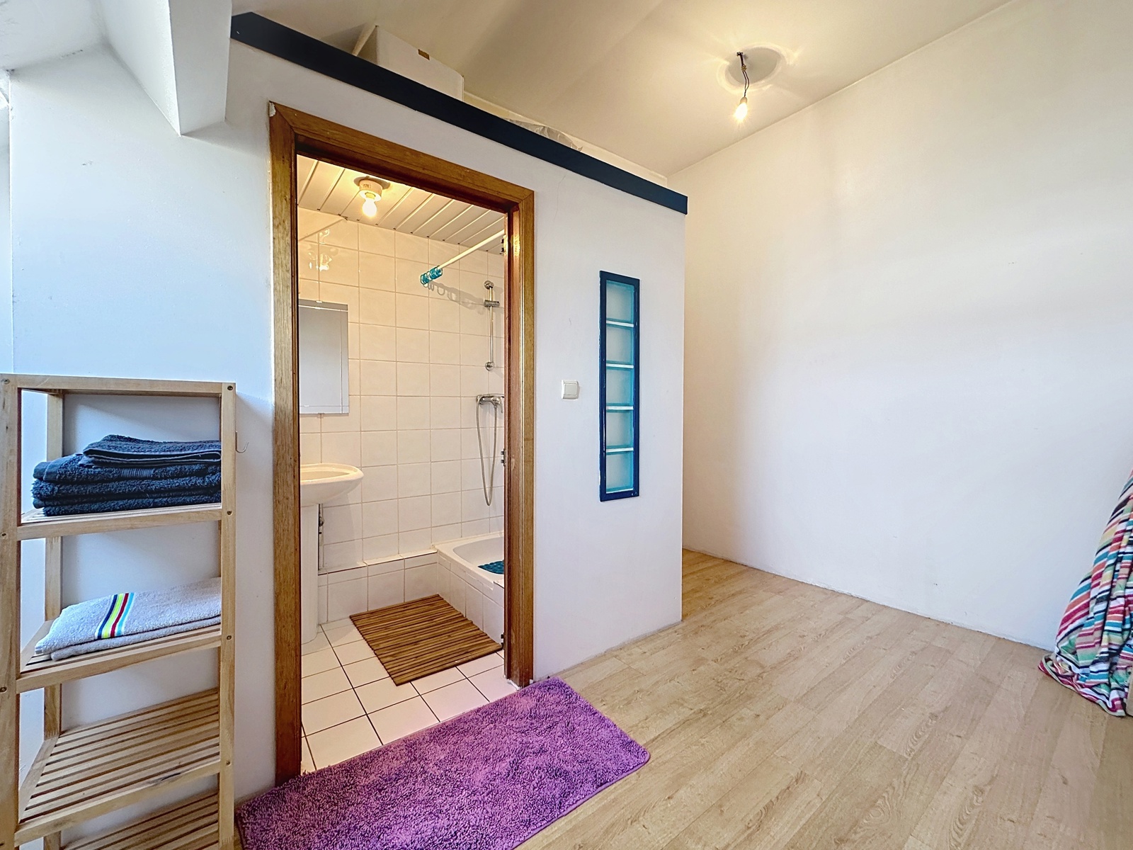 Salle de bains actuellement aménagée dans le débarras adjacent (vendu avec le studio) – doit encore être intégrée au studio conformément aux prescriptions urbanistiques.