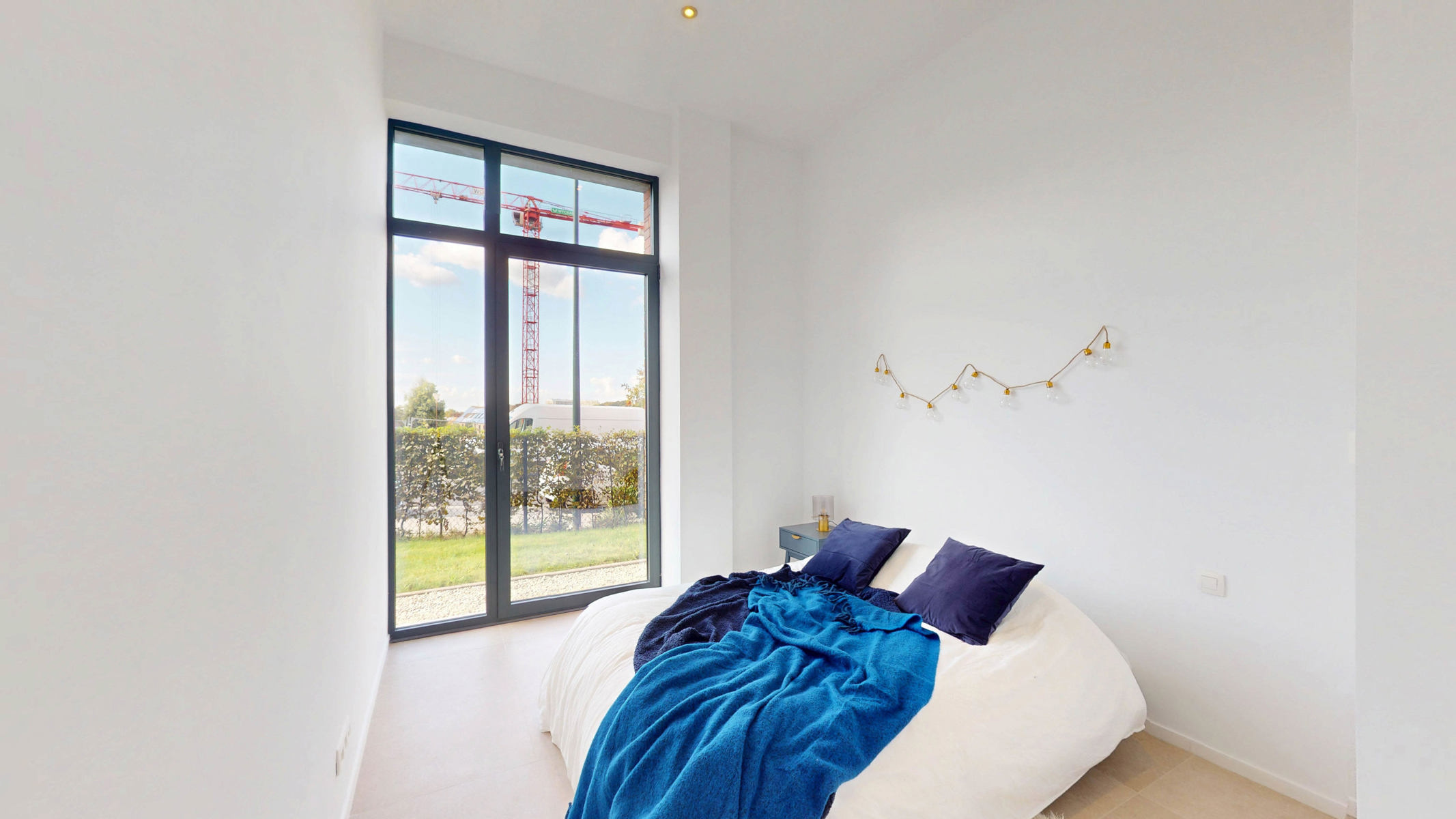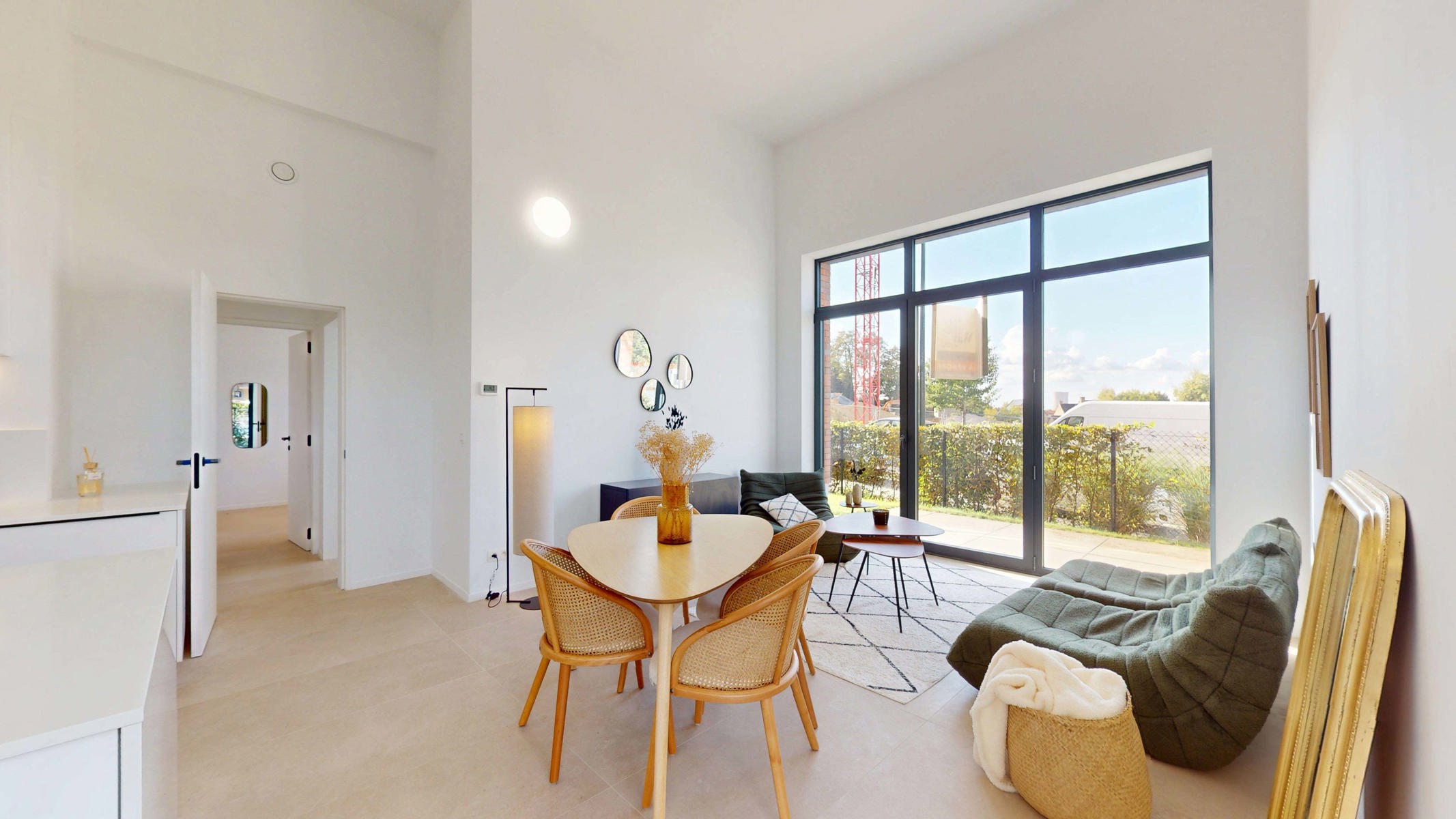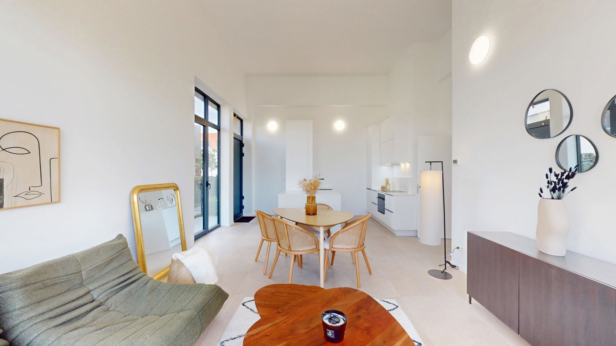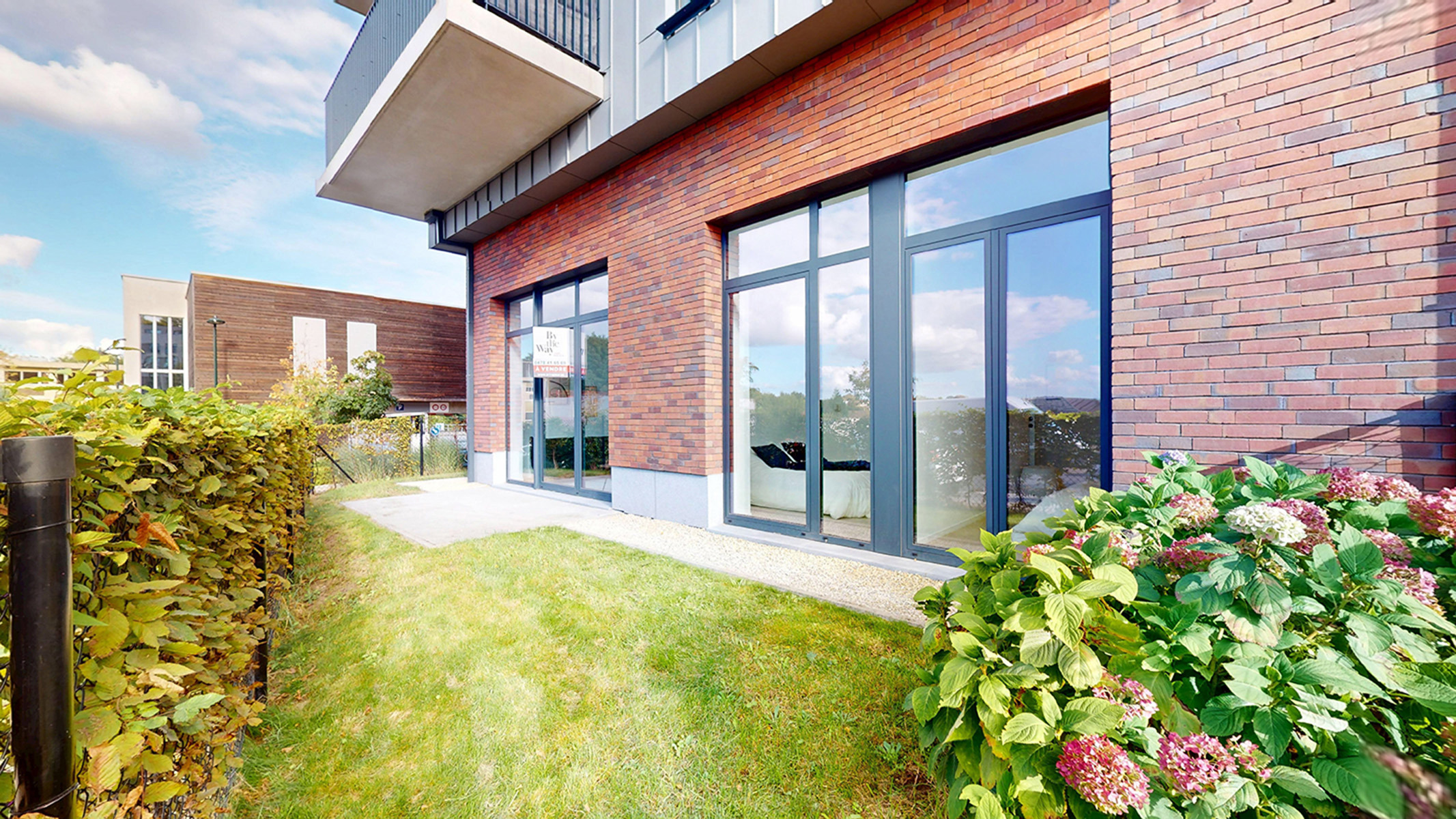Situé à proximité de la gare de Calvoet à Uccle, de ses transports et de ses commerces, By The Way vous propose ce lumineux appartement NEUF d’environ 90 m2 bruts (selon PEB), dans un nouveau quartier verdoyant en plein essor. Accessible depuis la venelle, par son entrée privative, ce RDC aux finitions haut de gamme est entouré d’un espace jardin + terrasse privatif de +/- 64m² et est composé comme suit: un séjour de +/- 33m² comprenant une cuisine ouverte hyper-équipée, bénéficiant d’une hauteur sous plafond exceptionnelle de 4,4m, un hall de nuit menant à une chambre parentale de 15m² avec salle de bain attenante, une seconde chambre de +/- 10m², une salle de douche, une buanderie et un WC séparé. Cet appartement possède également un grenier de +/- 8m² et l’immeuble dispose d’un local vélo sécurisé. Emplacement de parking intérieur obligatoire et en supplément (25.000€). Spécificités techniques et équipements: PEB B, électricité conforme, VMC double flux, chaudière au gaz individuelle. Compteurs eau/électricité individuels, châssis en aluminium avec isolation thermique et phonique. Charges communes (assurances, entretien, syndic, fond de réserve) d’environ 170 €/mois. Vente sous régime TVA.