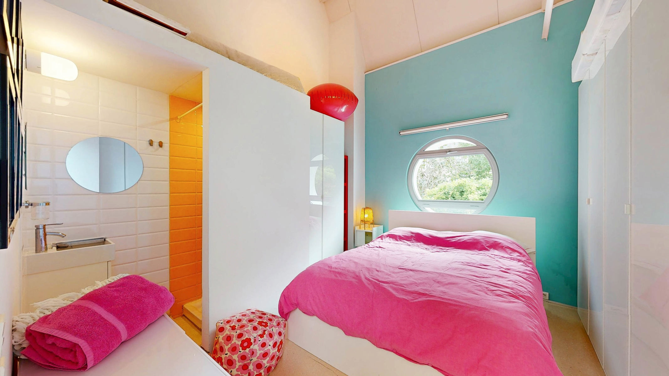 La petite maison indépendante se compose d’un salon avec cuisine ouverte, vestiaire, WC séparé, chambre à coucher avec dressing, salle de bains avec bain, douche et WC.