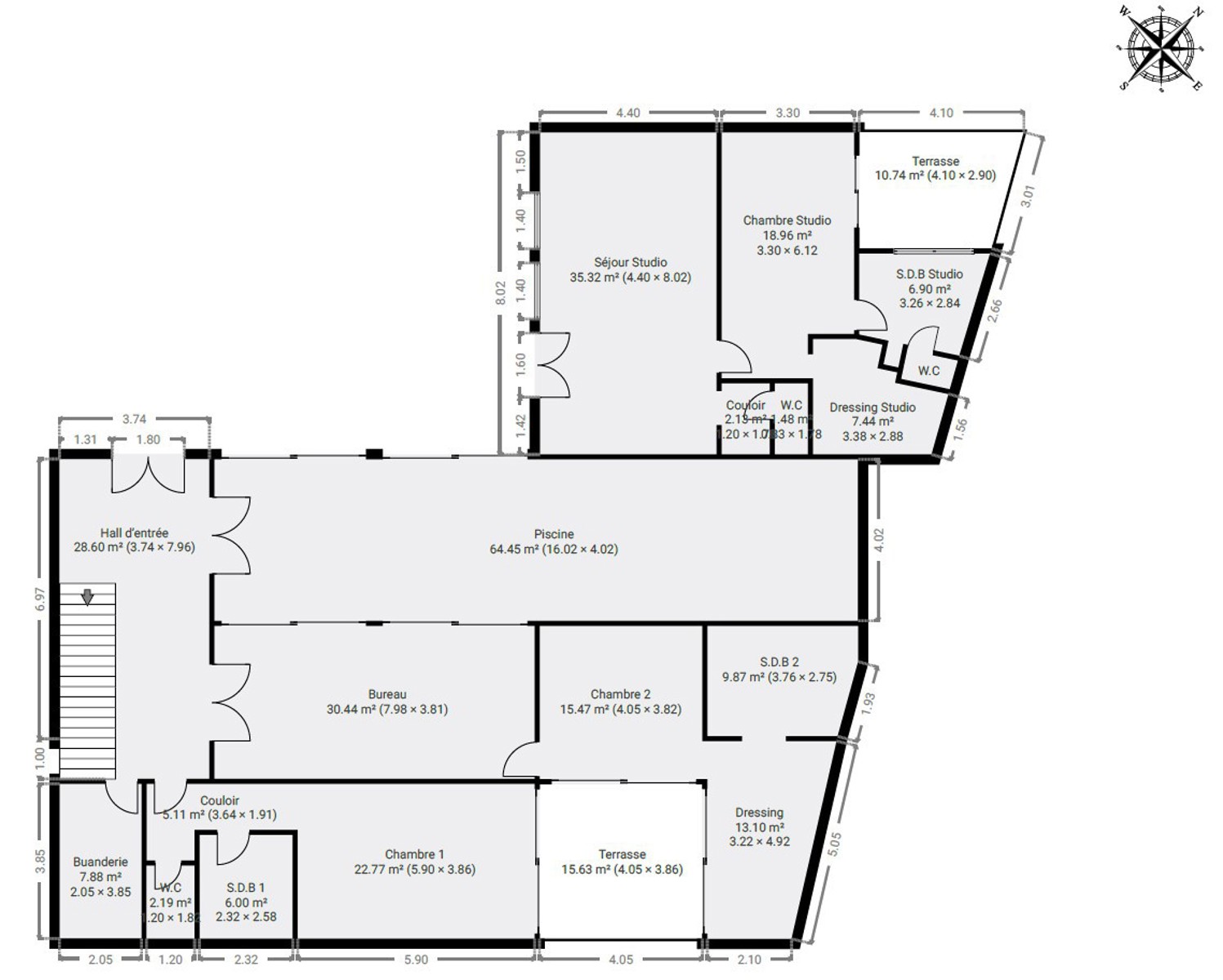 RDC: hall d’entrée, piscine intérieure donnant sur le jardin, une vaste buanderie, 2 chambres en suites, deux salles de bains avec bains, douches et toilettes.