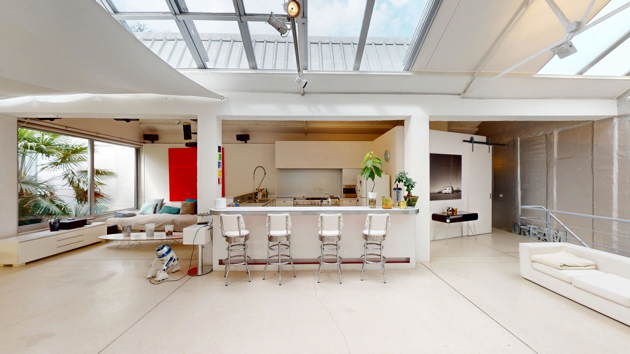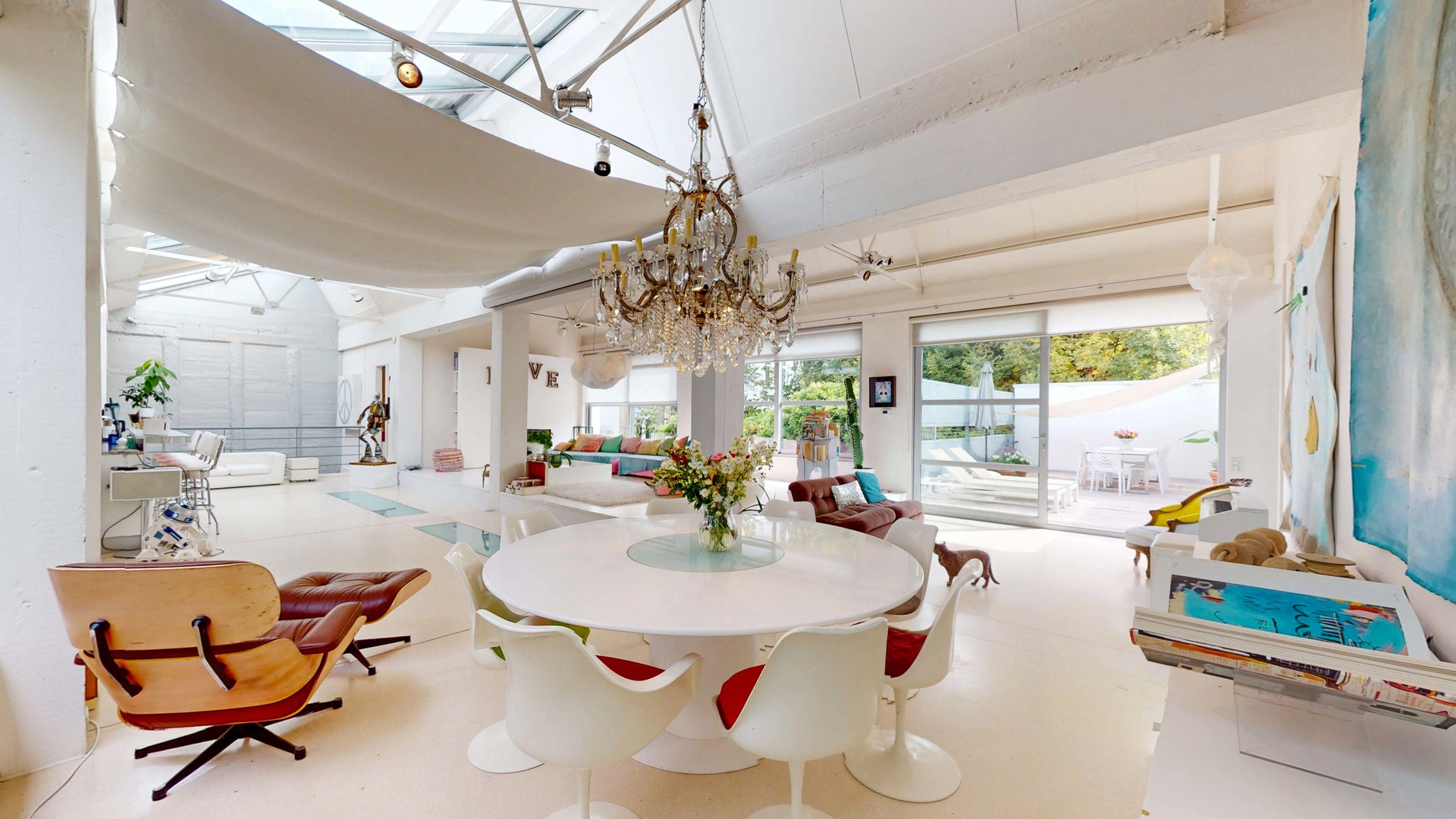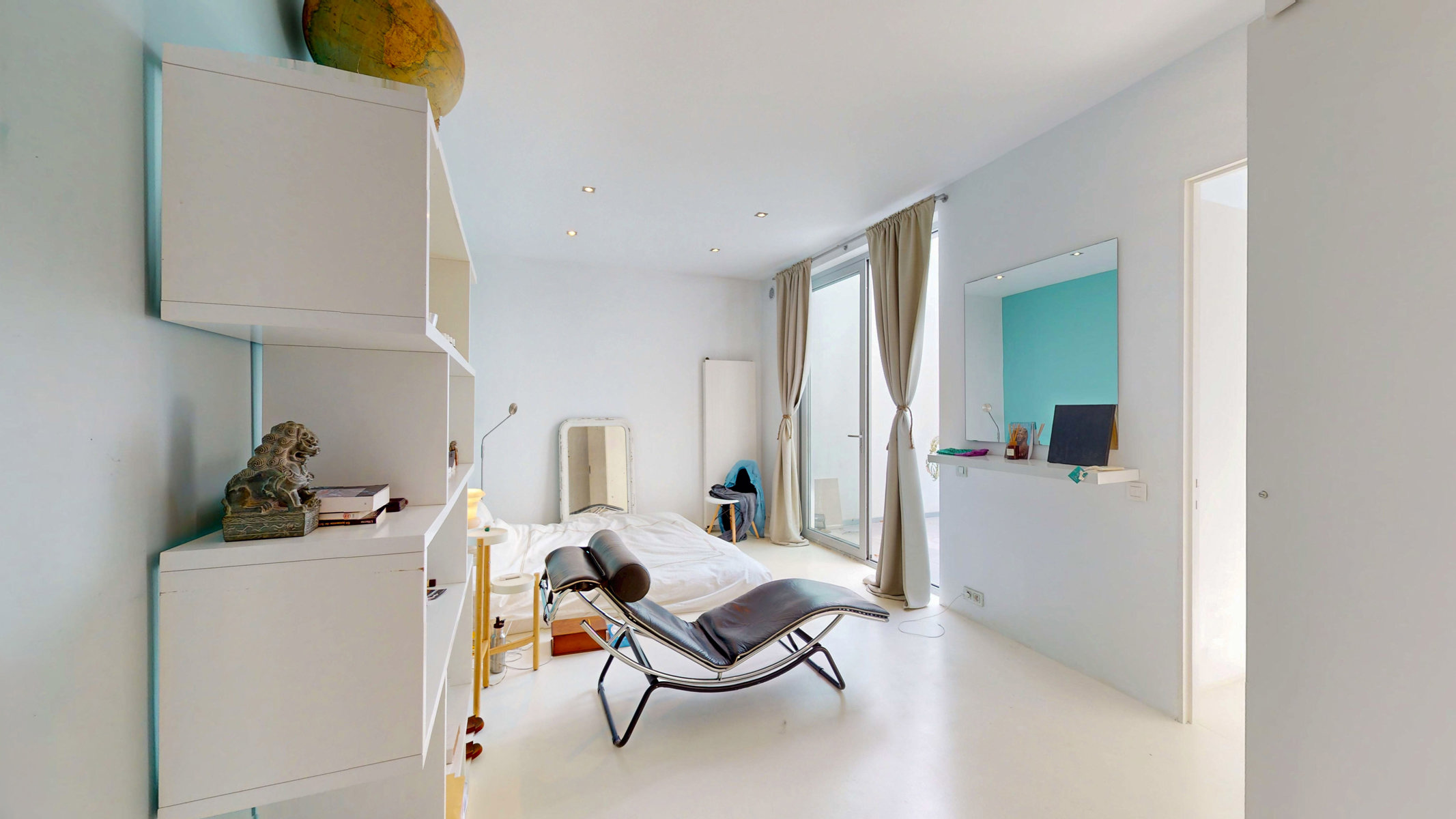 Au 1er étage, une vaste superficie séjour, divisé en différentes parties: salon, salle à manger, coin cinema, cuisine ouverte, arrière-cuisine, 3 chambres et deux salle de bains en-suite avec bains, douches, toilette séparée, terrasse (+/- 36m² – orientation Ouest). Une verrière qui s’ouvre par motorisation.