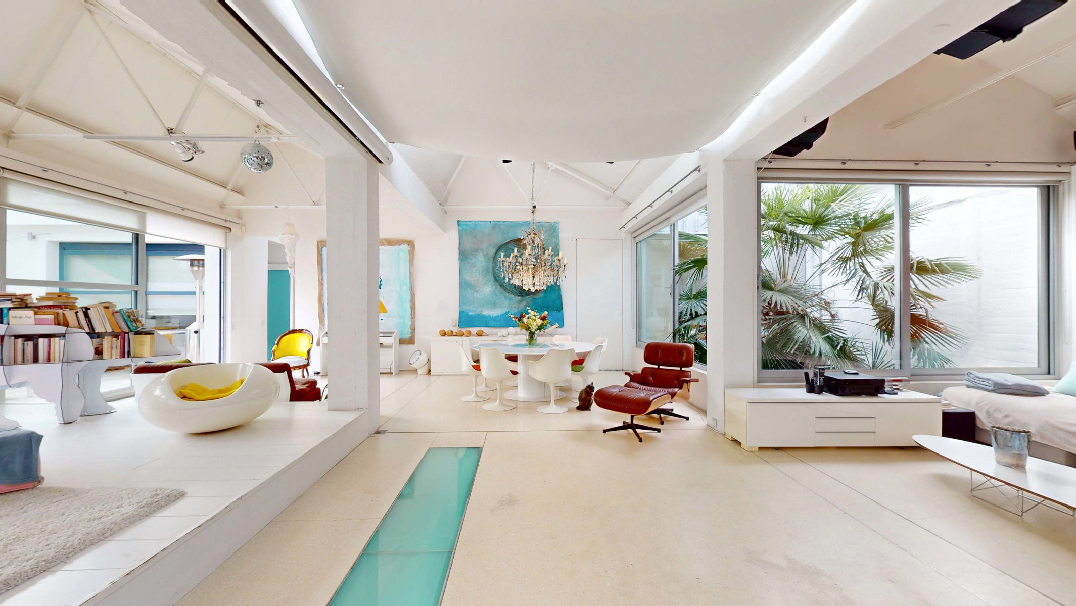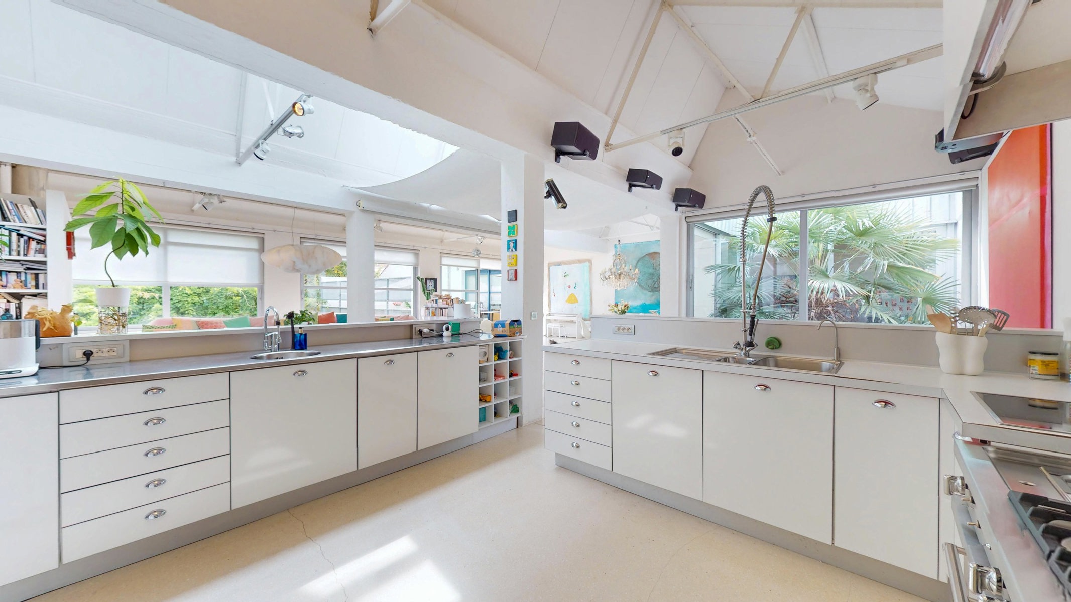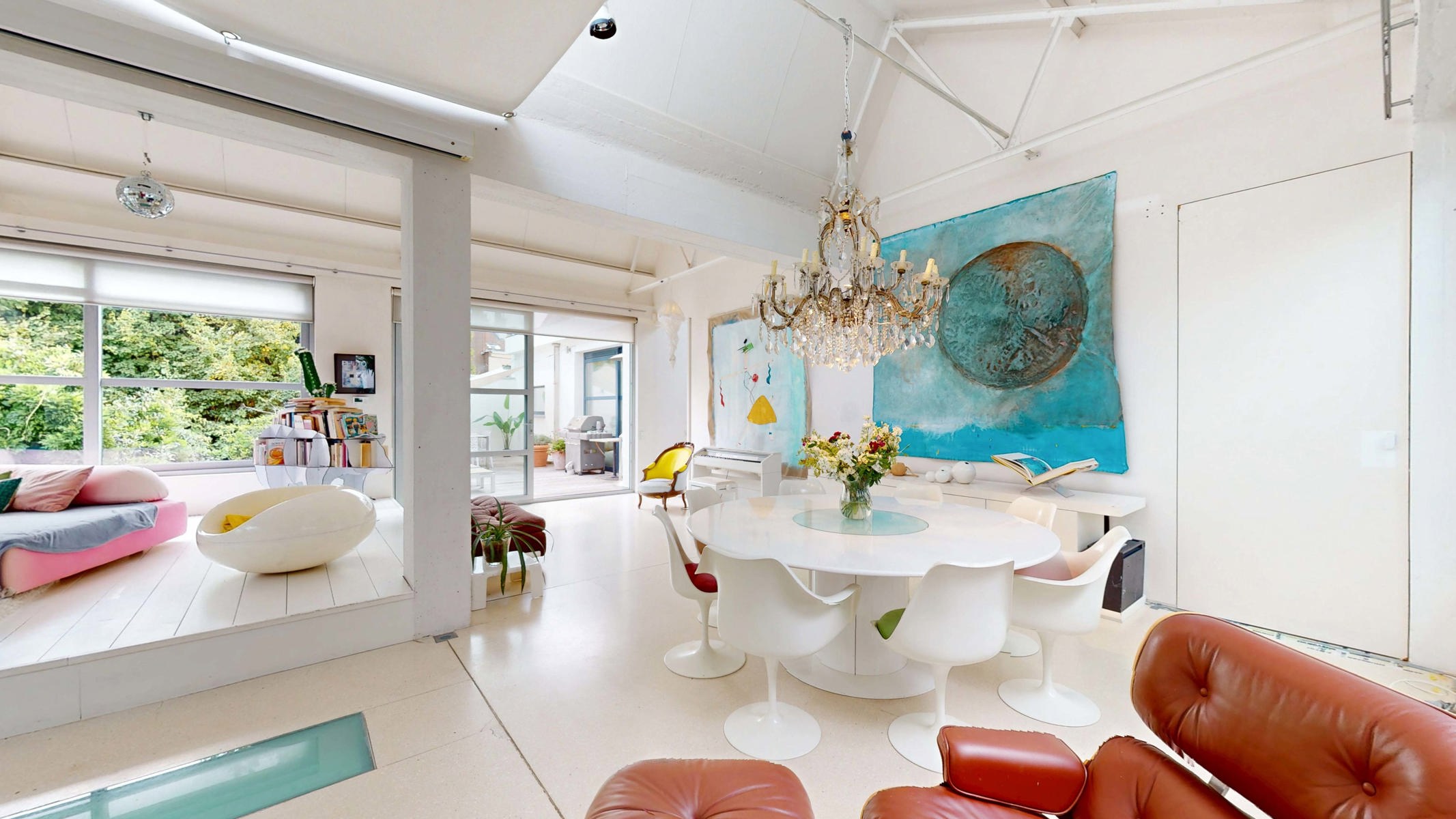 Au 1er étage, une vaste superficie séjour, divisé en différentes parties: salon, salle à manger, coin cinema, cuisine ouverte, arrière-cuisine, 3 chambres et deux salle de bains en-suite avec bains, douches, toilette séparée, terrasse (+/- 36m² – orientation Ouest). Une verrière qui s’ouvre par motorisation.