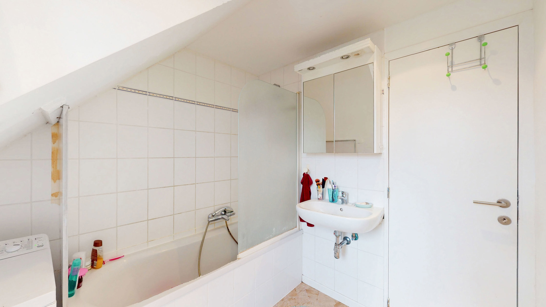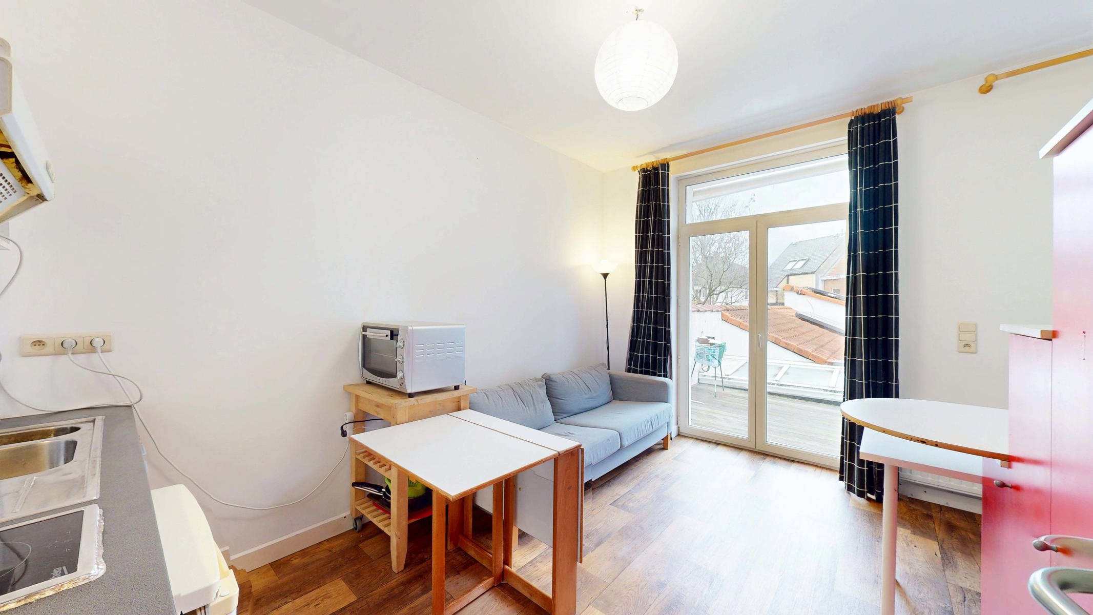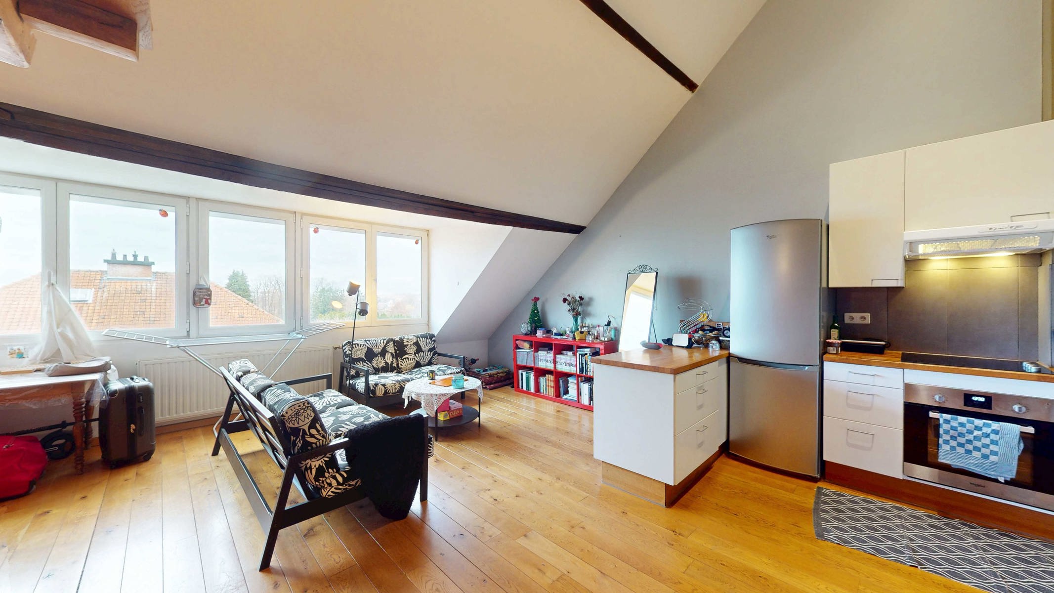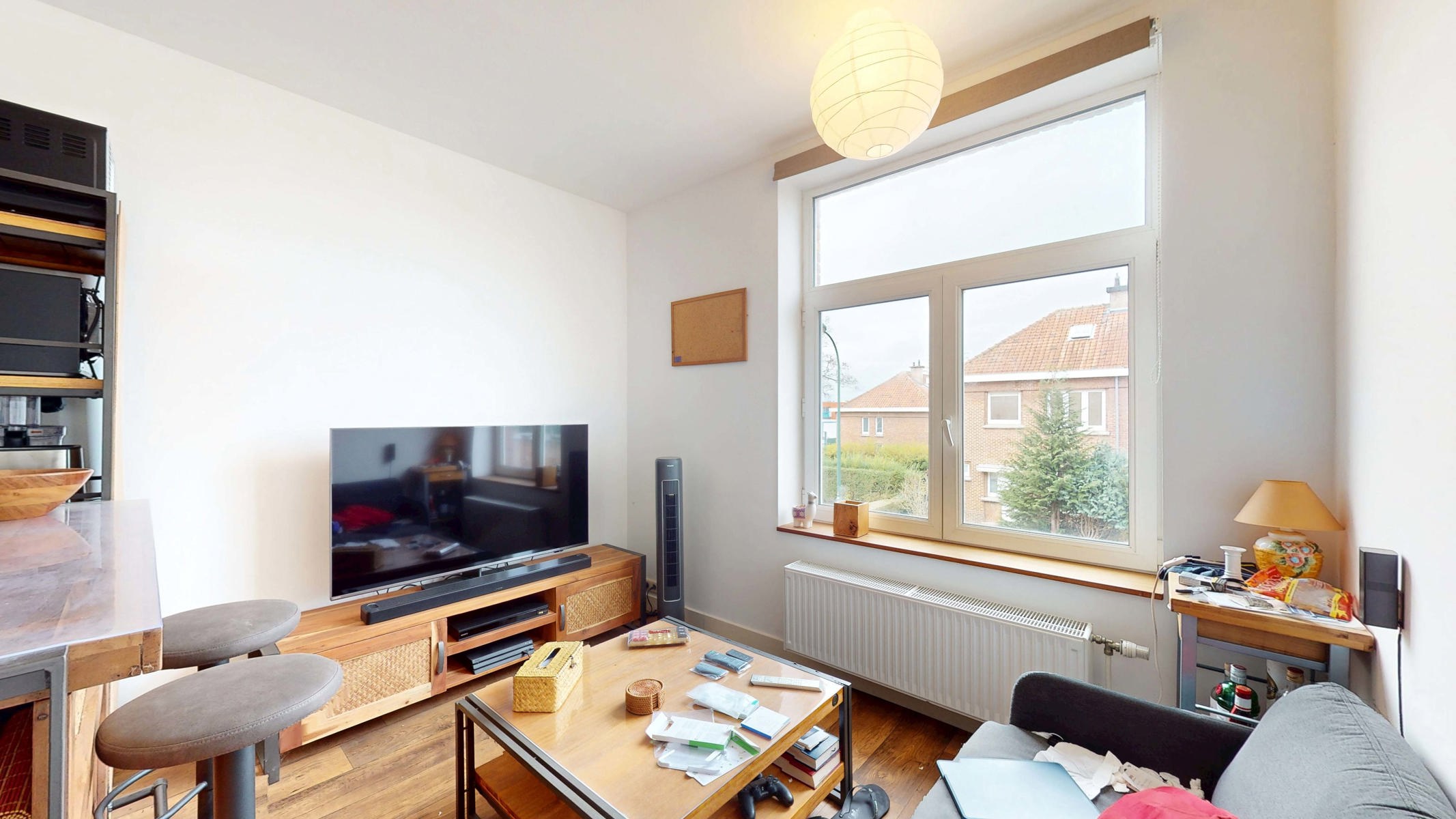 👉 Au 1er étage, un appartement d’env. 73 m² à rénover, avec un permis d’urbanisme déjà obtenu (coûts déjà inclus dans le calcul du rendement): séjour avec cuisine ouverte, grande terrasse de 9 m² au calme, 2 chambres, salle de douche et WC séparé. Un potentiel de revalorisation évident.