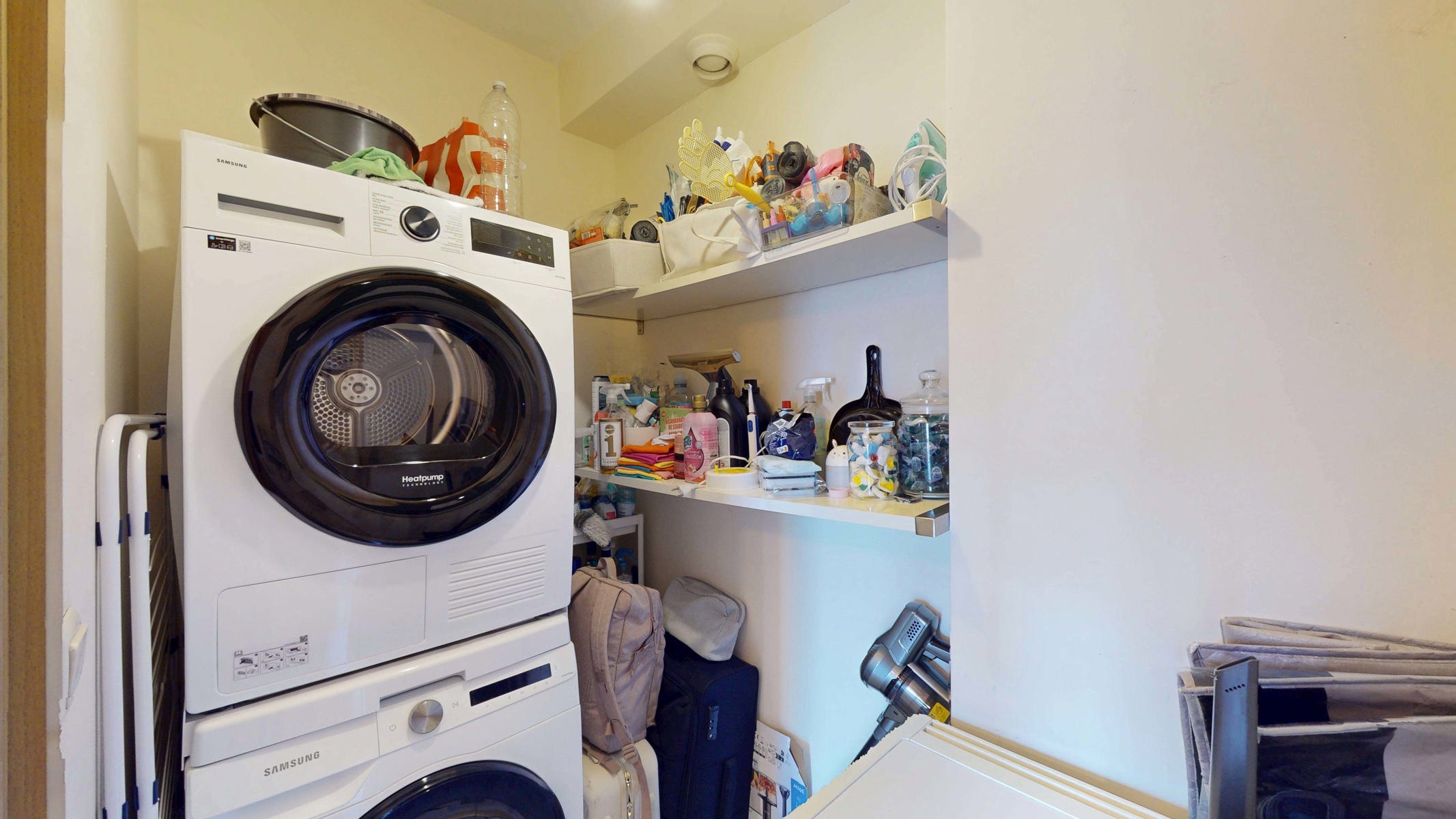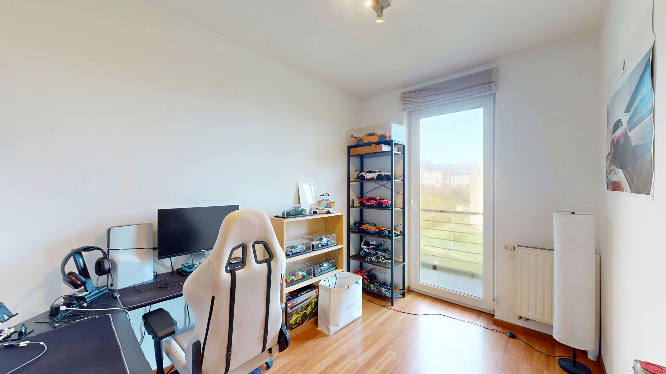 La partie nuit se compose d’une chambre confortable de 13 m² et d’un bureau/dressing de 7 m², idéal pour le télétravail ou un espace de rangement sur mesure. Une salle de bain avec baignoire, une buanderie, un WC séparé et un hall d’entrée complètent l’ensemble.