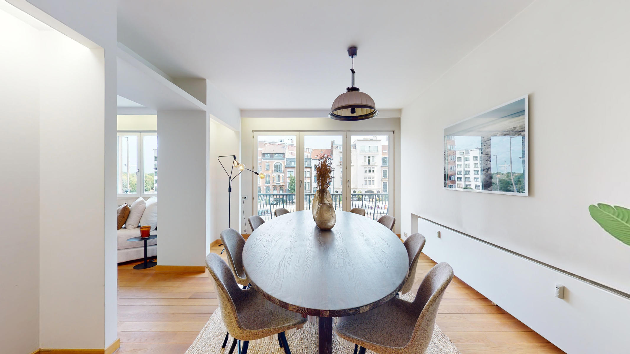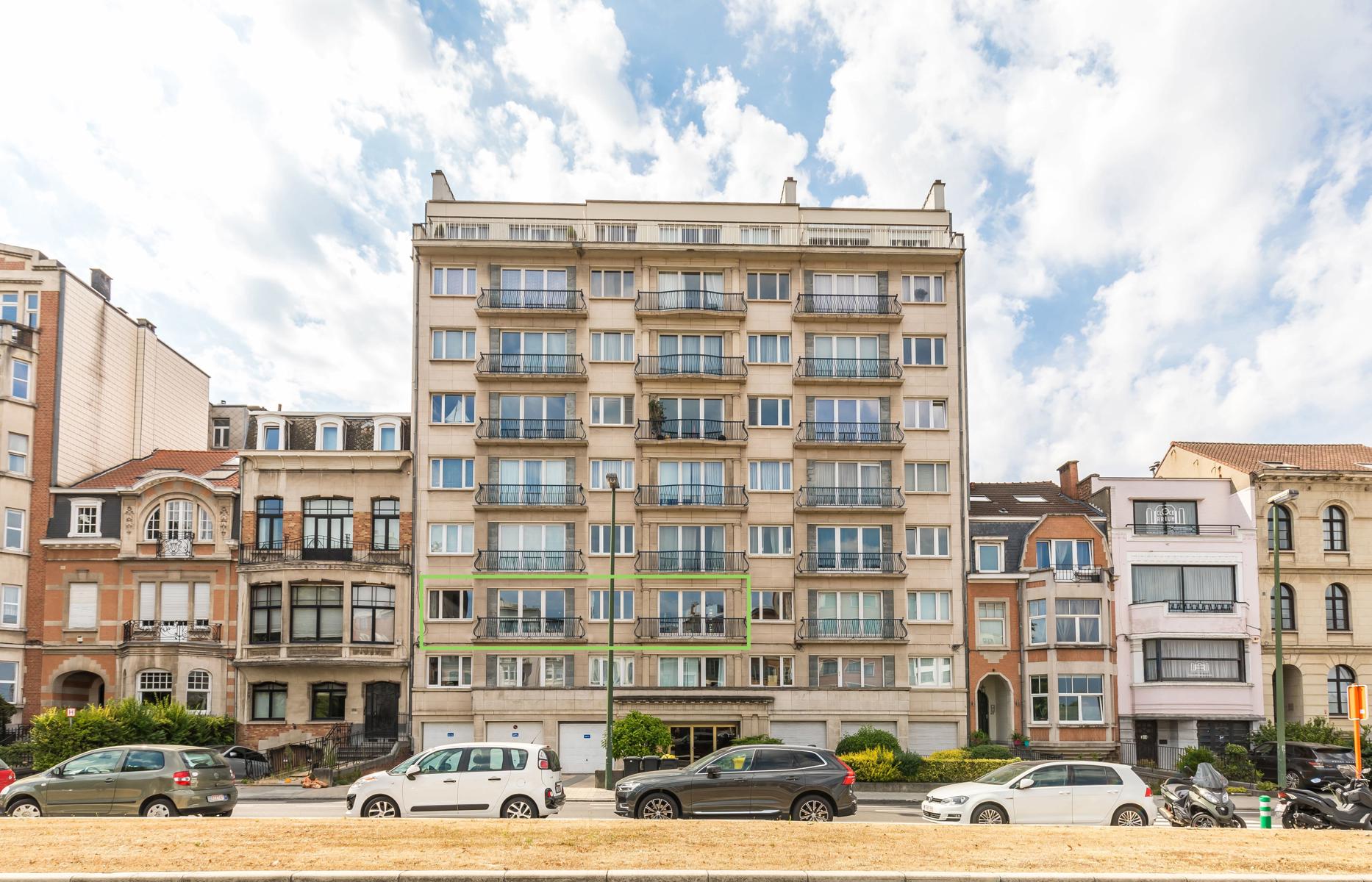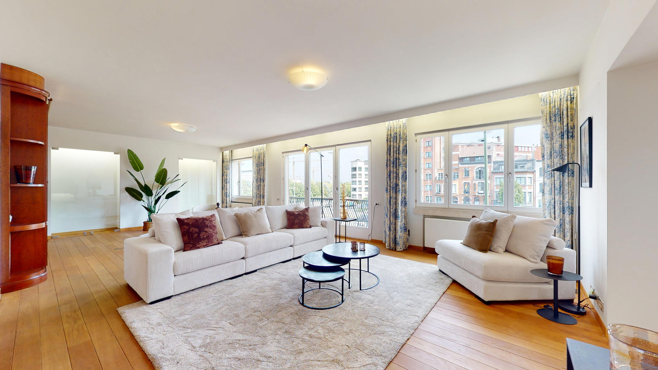 In the very famous Diamant district, known for having seen Jacques Brel born, By the Way presents you this superb 3 bedroom flat of +- 220 m2 BRUT, in very good condition and its two private cellars. On the 2nd floor, with lift, of a well maintained building. The flat is composed as follows: A large entrance hall leading to a cloakroom with guest WC, a spacious living room of +- 50 m2 with solid wood parquet flooring, a fully equipped kitchen of +- 20 m2, a library, a master suite of +- 15 m2 and its adjoining bathroom with WC, 2 bedrooms of respectively +- 17 m2 and +- 17 m2, 1 bathroom with WC and bidet, a fitted dressing room and a laundry room. Two terraces of respectively +- 10 m2 and +- 8 m2 . Garage box for 2 cars in option at 45.000 € (optional). EPC C. Electricity NOT compliant, common gas boiler with calorimeters. DV wood frame. Charges +- 541€/month including RESERVE FUND, lift fees, provision for PRIVATE hot water and heating, common (syndic, building insurance, electricity).