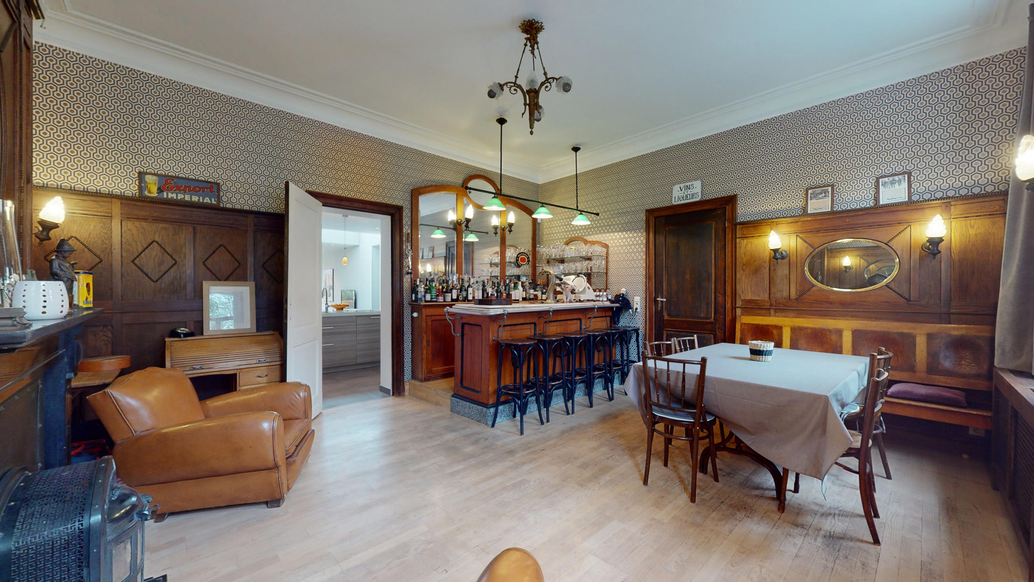 The entrance hall with period tiles gives directly access to the festive dining room with its wood/coal stove, to the kitchen opened on the living room and the bicycle room. The POGGENPOHL kitchen with central island is fully equipped with MIELE & SMEG (induction hob, hood, conventional and microwave ovens, XL dishwasher and … wine dispenser by the glass. The large and bright living room opens onto the flat garden and the pretty terrace facing south-west.