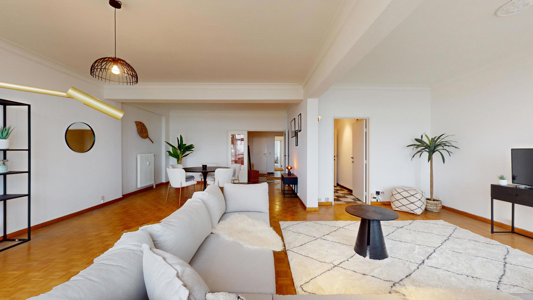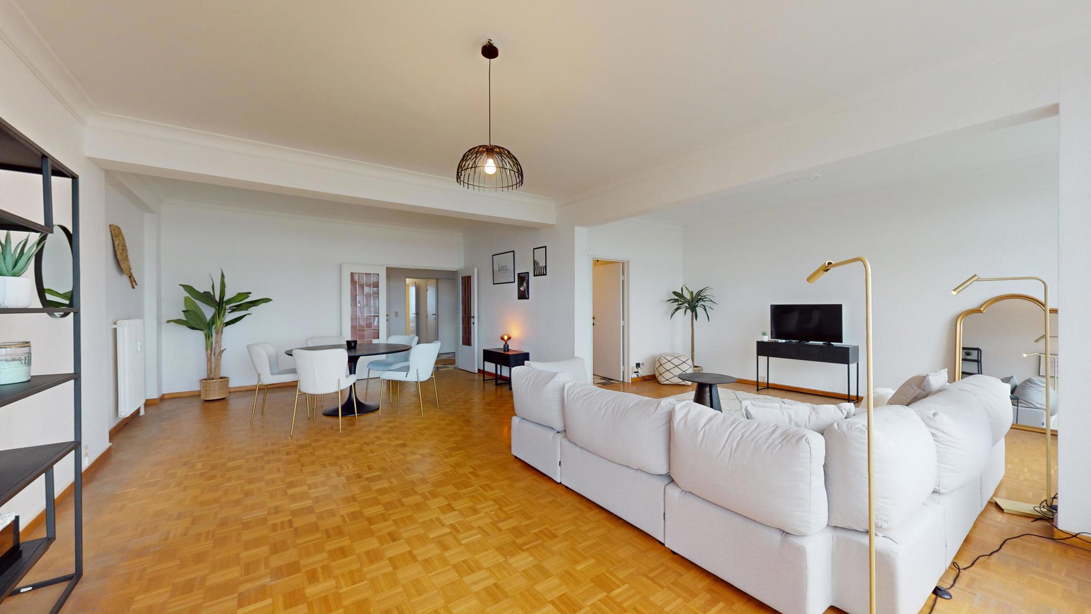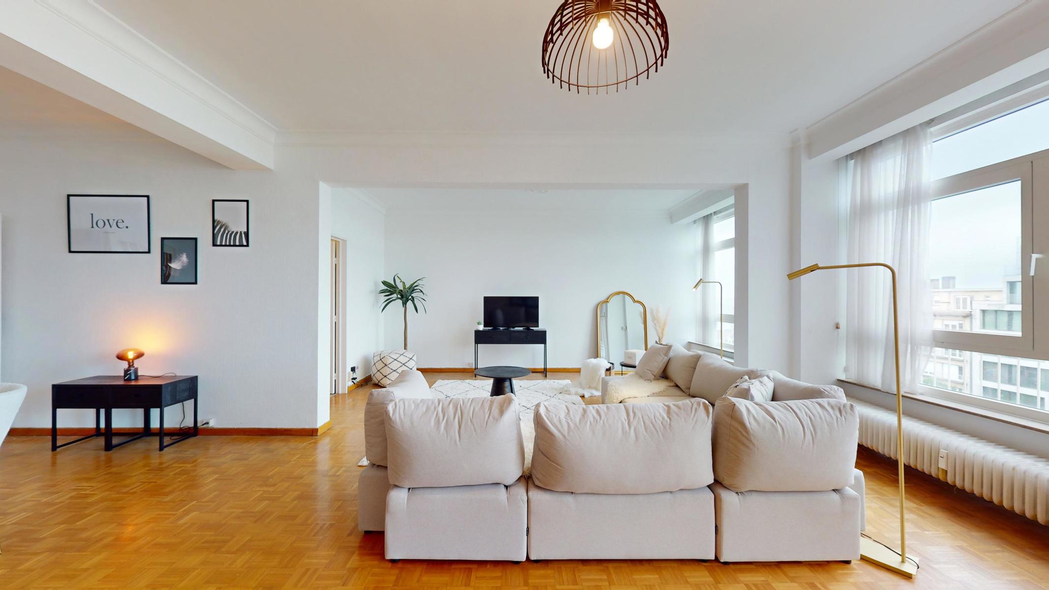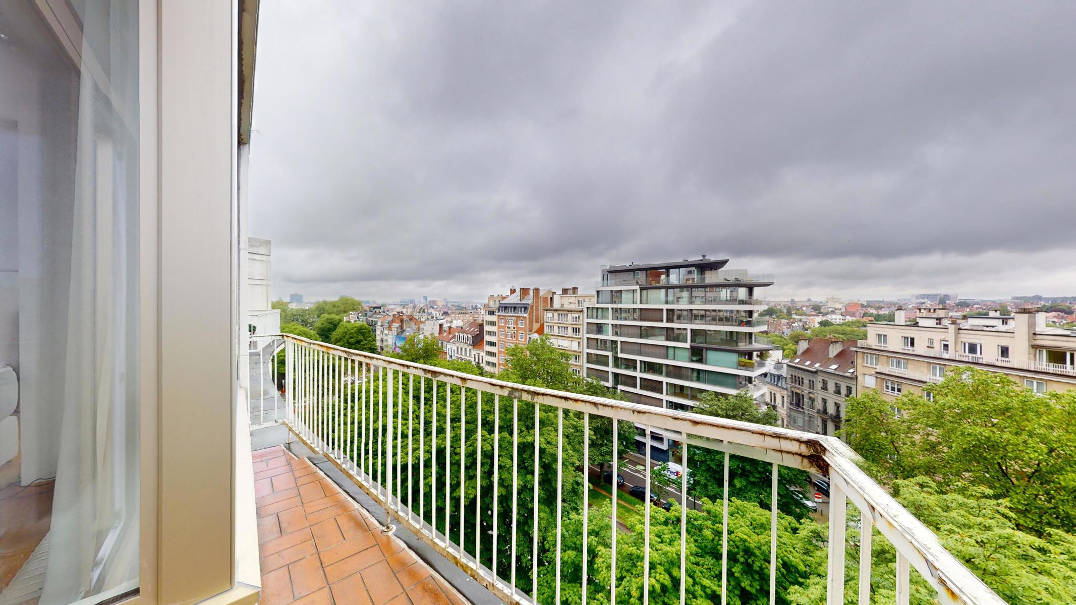 Located on the prestigious Avenue Louise, just a stone’s throw from the Abbey, the Bois de la Cambre and the Jardin du Roi, By The Way offers you this magnificent, light-filled walk-through flat of around 143m2 gross according to PEB. Ideally positioned on the 9th floor with lift, it benefits from beautiful unobstructed views and is composed as follows: an entrance hall/ cloakroom giving access to a spacious living room of +/- 55m2 with terrace, a kitchen, a night hall leading to a first bedroom of +/- 16m2, a separate WC, a second bedroom of +/- 11m² with terrace, a study of +/- 7m2 and a bathroom with WC. The flat has plenty of storage space and a private cellar. Concierge service, reinforced door, dustbin room, new communal gas boiler and new PVC double-glazed windows, EPB ‘D-’, electricity not compliant. CHARGES: +/- 543€/month including : Communal building charges, private heating and water provisions, administration, insurance, managing agent. Option to purchase 1 or 2 garage boxes in the building (€55,000/unit). For more information, click on the following link: https://biens.bytheway.immo/queen-b/