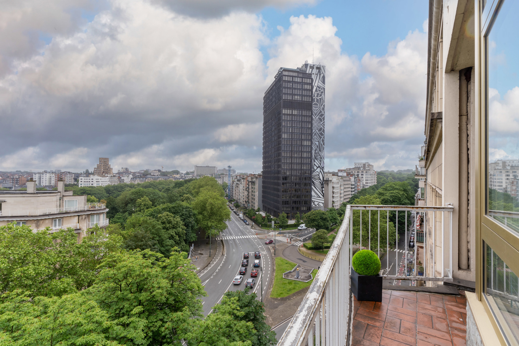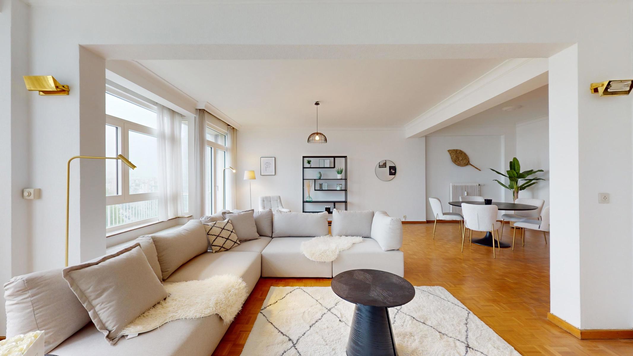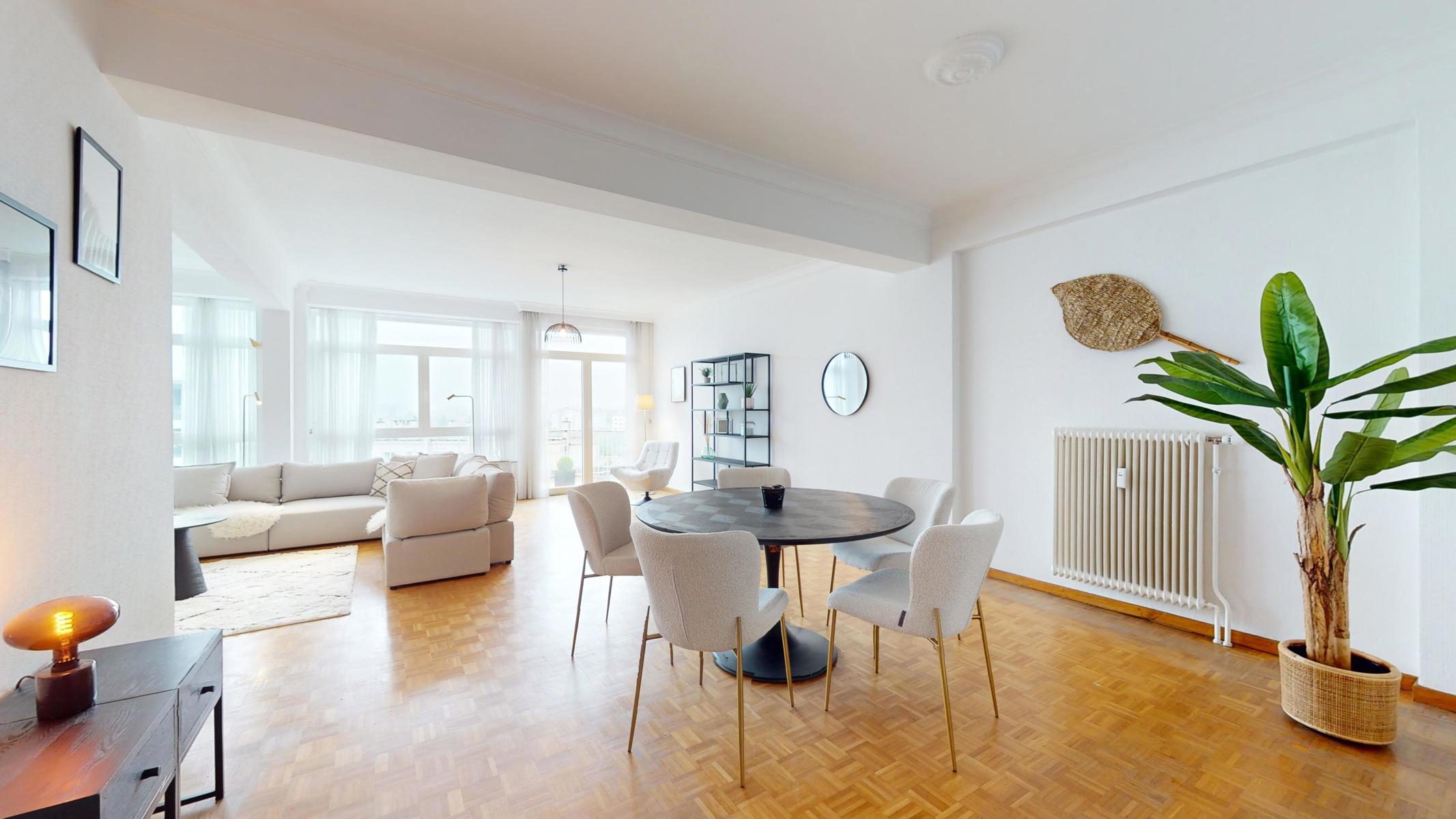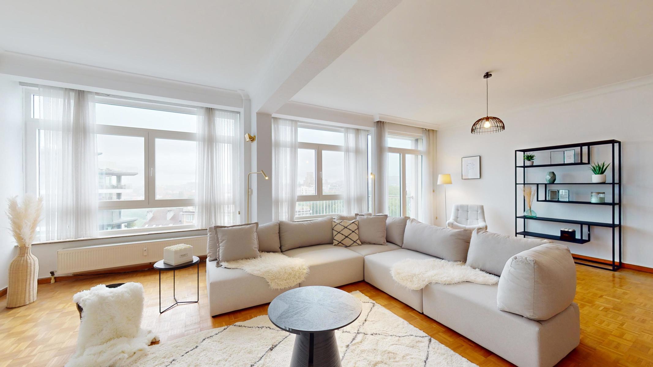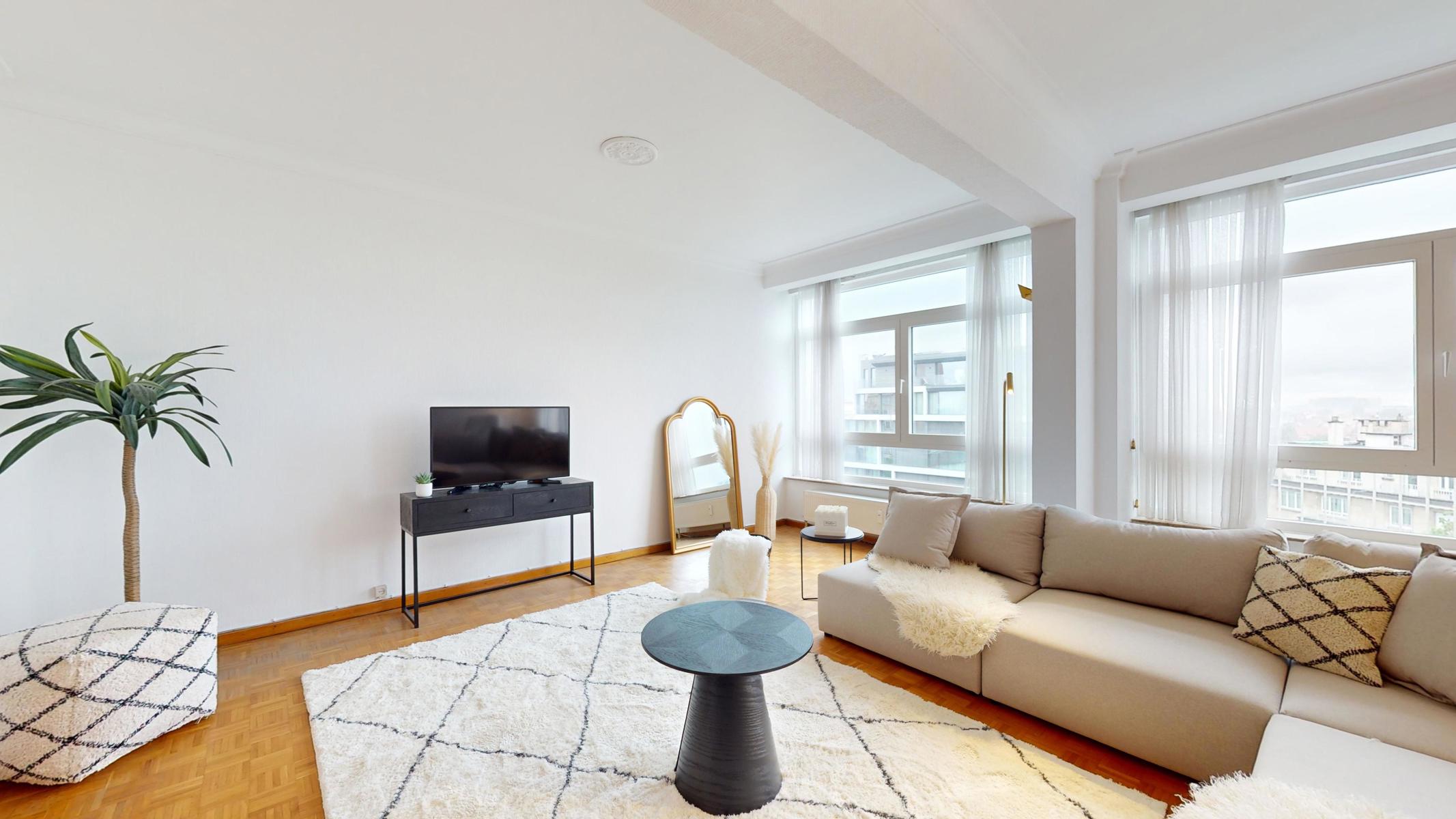 Located on the prestigious Avenue Louise, just a stone’s throw from the Abbey, the Bois de la Cambre and the Jardin du Roi, By The Way offers you this magnificent, light-filled walk-through flat of around 143m2 gross according to PEB. Ideally positioned on the 9th floor with lift, it benefits from beautiful unobstructed views and is composed as follows: an entrance hall/ cloakroom giving access to a spacious living room of +/- 55m2 with terrace, a kitchen, a night hall leading to a first bedroom of +/- 16m2, a separate WC, a second bedroom of +/- 11m² with terrace, a study of +/- 7m2 and a bathroom with WC. The flat has plenty of storage space and a private cellar. Concierge service, reinforced door, dustbin room, new communal gas boiler and new PVC double-glazed windows, EPB ‘D-’, electricity not compliant. CHARGES: +/- 543€/month including : Communal building charges, private heating and water provisions, administration, insurance, managing agent. Option to purchase 1 or 2 garage boxes in the building (€55,000/unit). For more information, click on the following link: https://biens.bytheway.immo/queen-b/