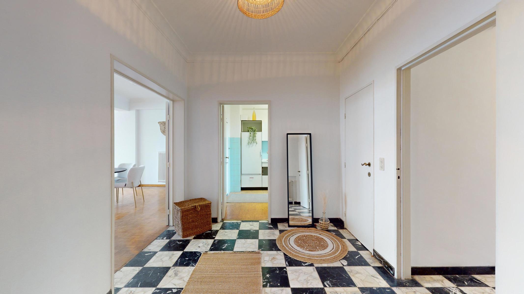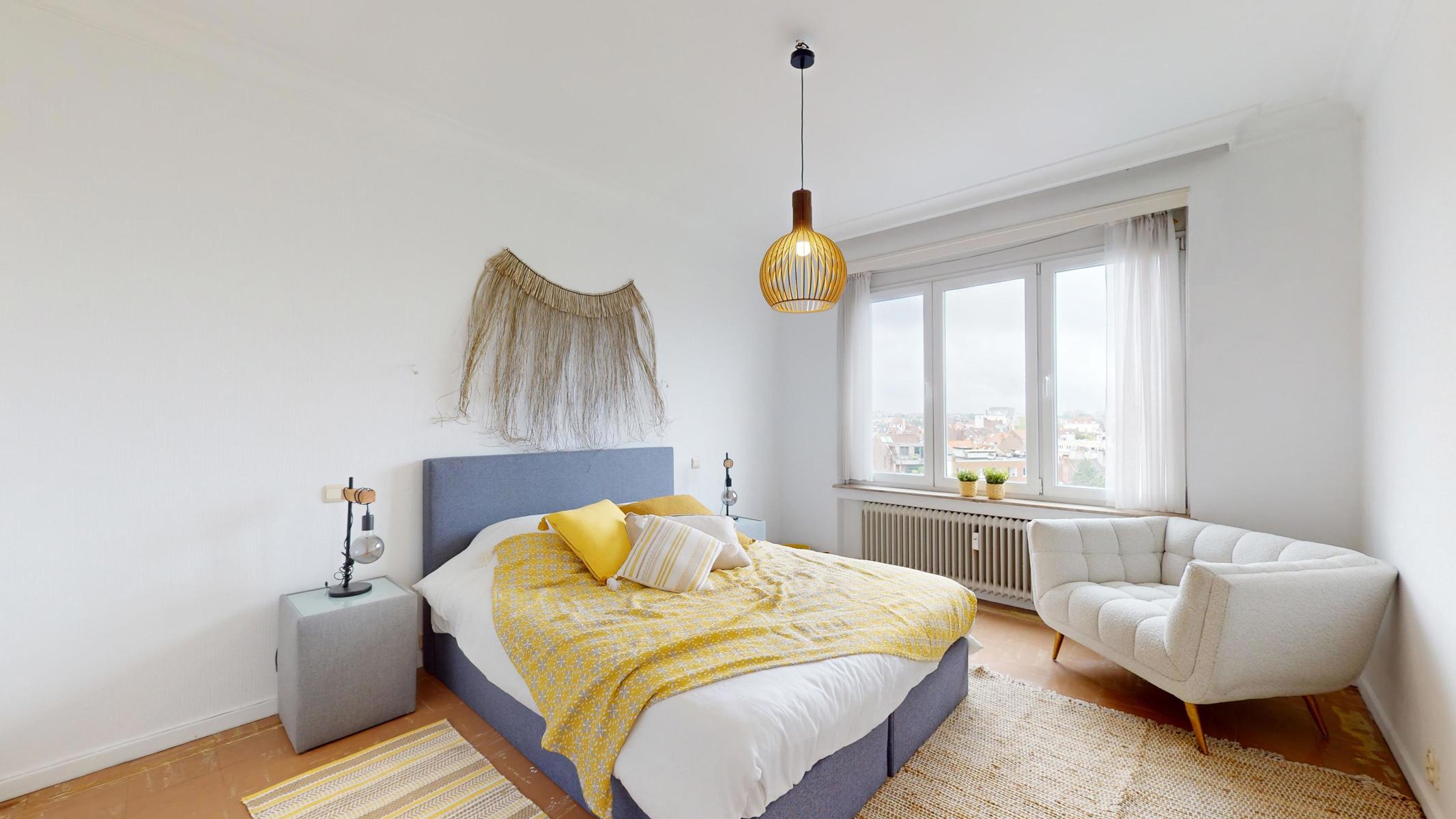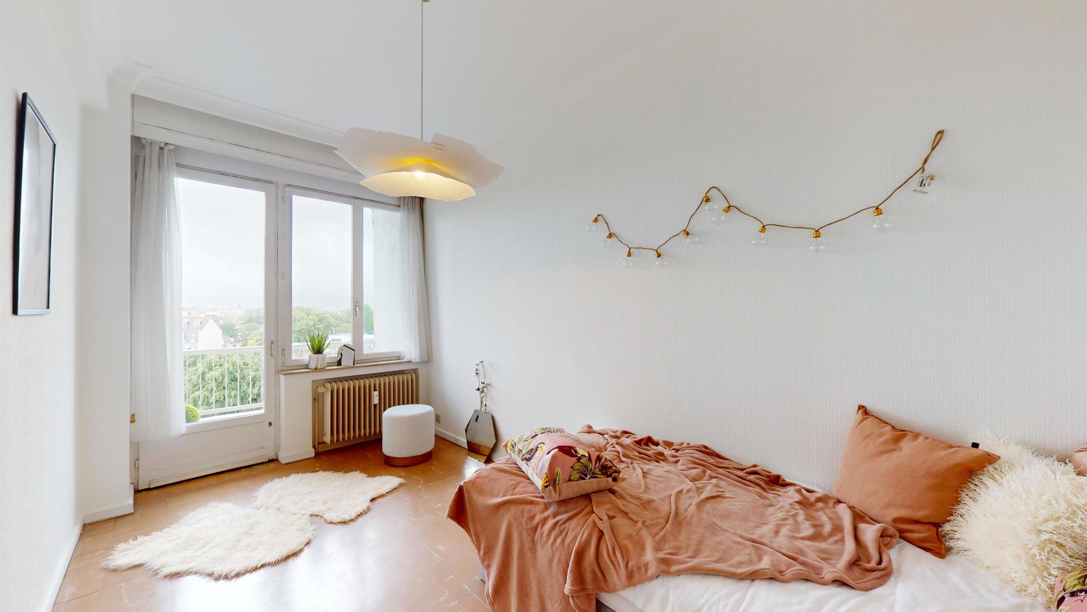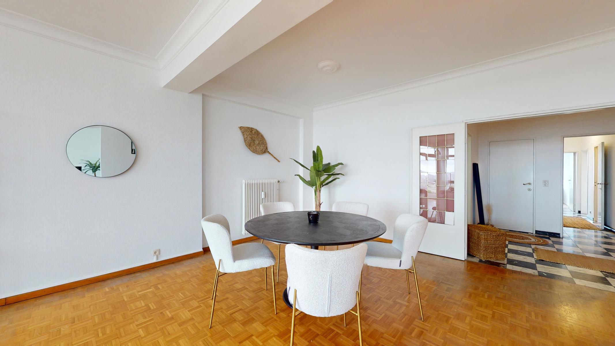 Located on the prestigious Avenue Louise, just a stone’s throw from the Abbey, the Bois de la Cambre and the Jardin du Roi, By The Way offers you this magnificent, light-filled walk-through flat of around 143m2 gross according to PEB. Ideally positioned on the 9th floor with lift, it benefits from beautiful unobstructed views and is composed as follows: an entrance hall/ cloakroom giving access to a spacious living room of +/- 55m2 with terrace, a kitchen, a night hall leading to a first bedroom of +/- 16m2, a separate WC, a second bedroom of +/- 11m² with terrace, a study of +/- 7m2 and a bathroom with WC. The flat has plenty of storage space and a private cellar. Concierge service, reinforced door, dustbin room, new communal gas boiler and new PVC double-glazed windows, EPB ‘D-’, electricity not compliant. CHARGES: +/- 543€/month including : Communal building charges, private heating and water provisions, administration, insurance, managing agent. Option to purchase 1 or 2 garage boxes in the building (€55,000/unit). For more information, click on the following link: https://biens.bytheway.immo/queen-b/