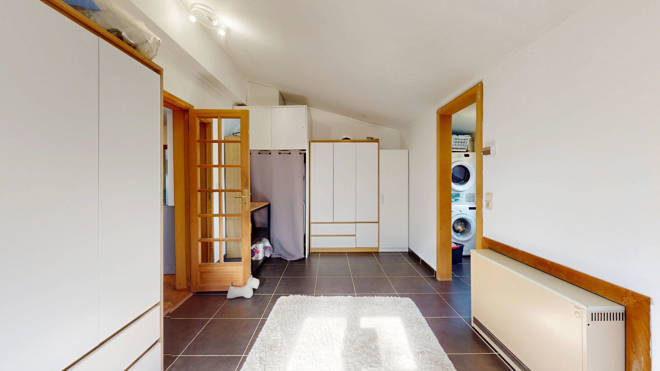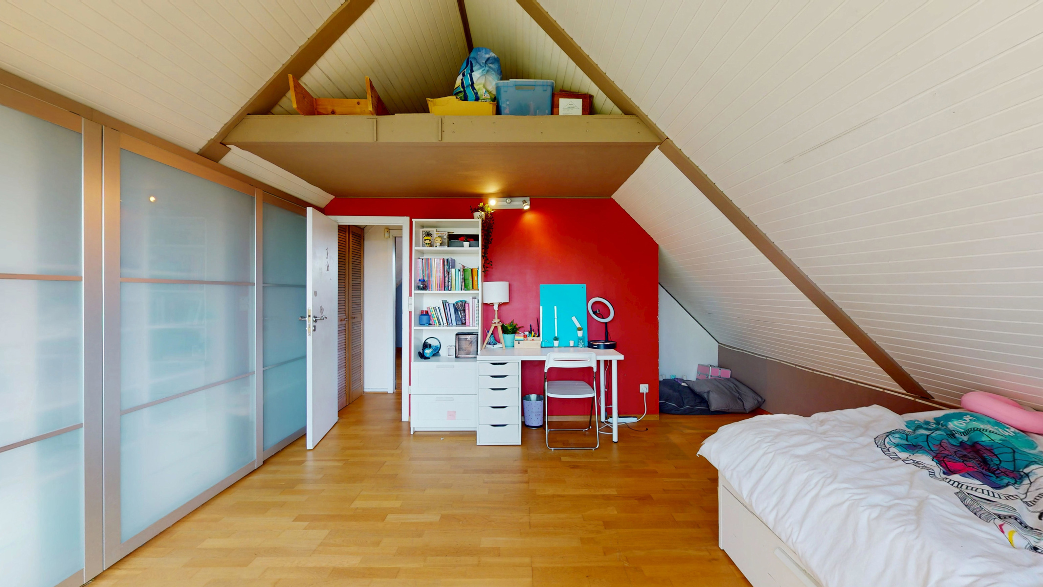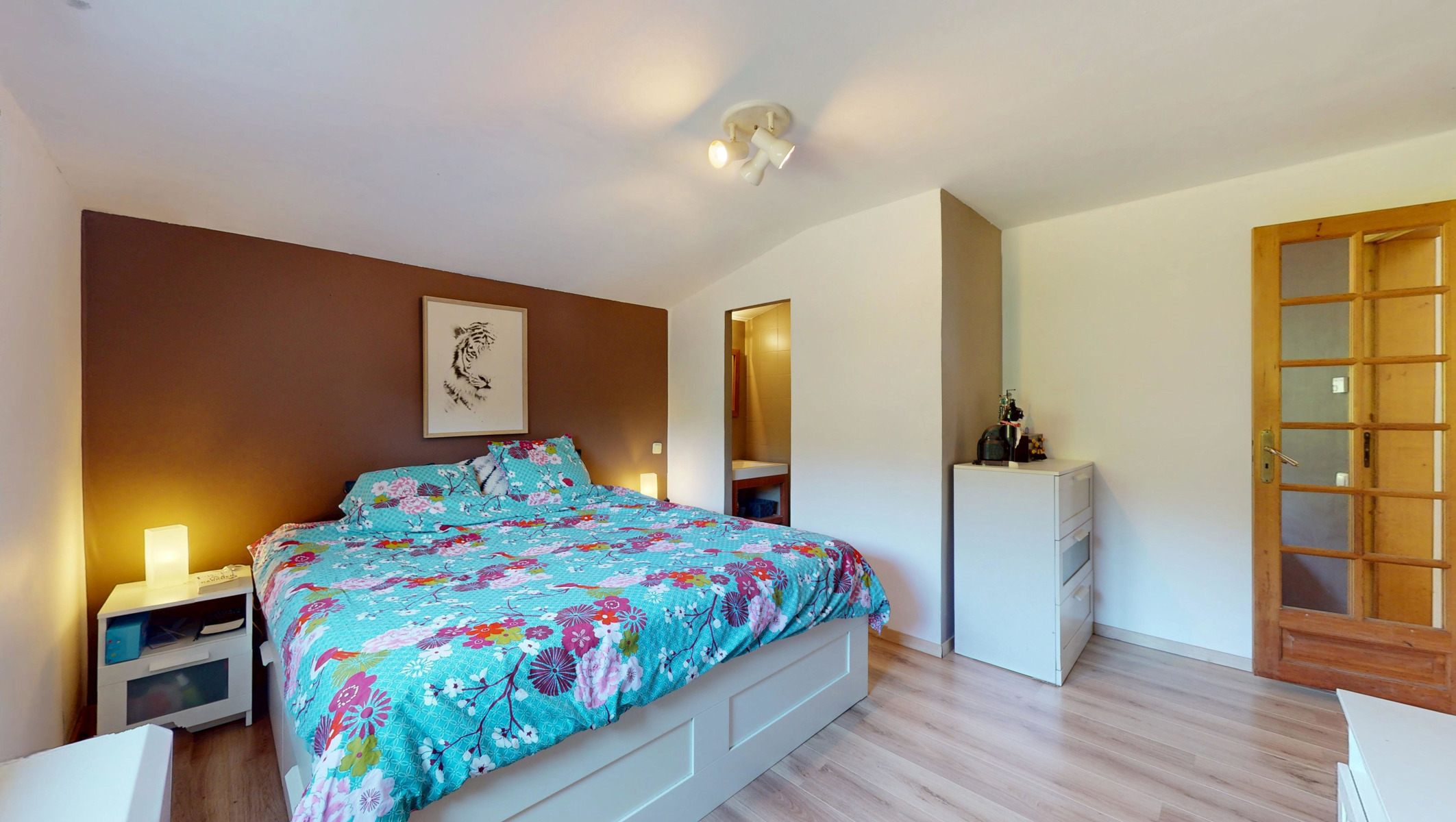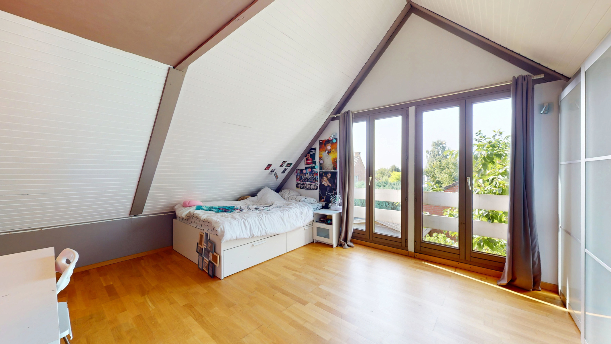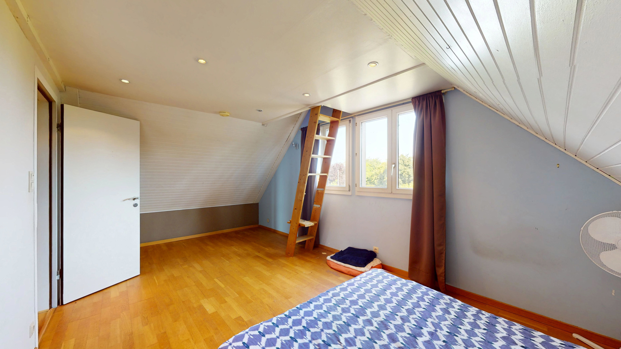 On the first floor, accessible via a staircase in the living room, there are two bedrooms on either side of the landing. The second bedroom (21m²) has built-in cupboards and a mezzanine. The third bedroom (19m²) also has a mezzanine.