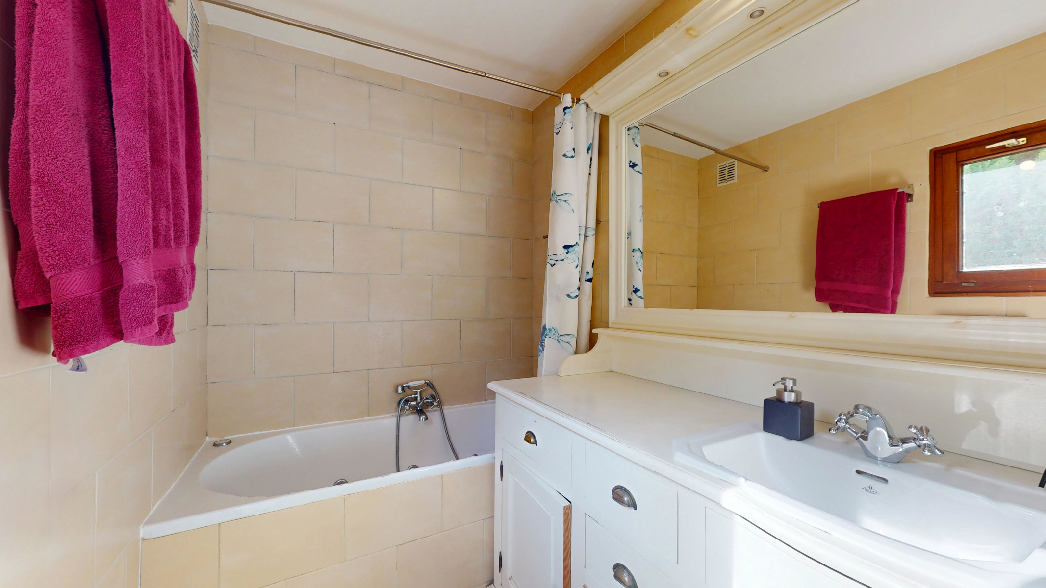 With the possibility of living on one level, it is laid out as follows: the entrance hall, with its cloakroom, leads to the bathroom with a sink and bathtub. A large living room comprising a lounge and dining room opens onto the large fitted kitchen (oven, hob, extractor hood, etc.). Adjacent to the living room, a study with a toilet and access to the outside is currently used as a laundry room. A first bedroom with a private shower room completes this level.