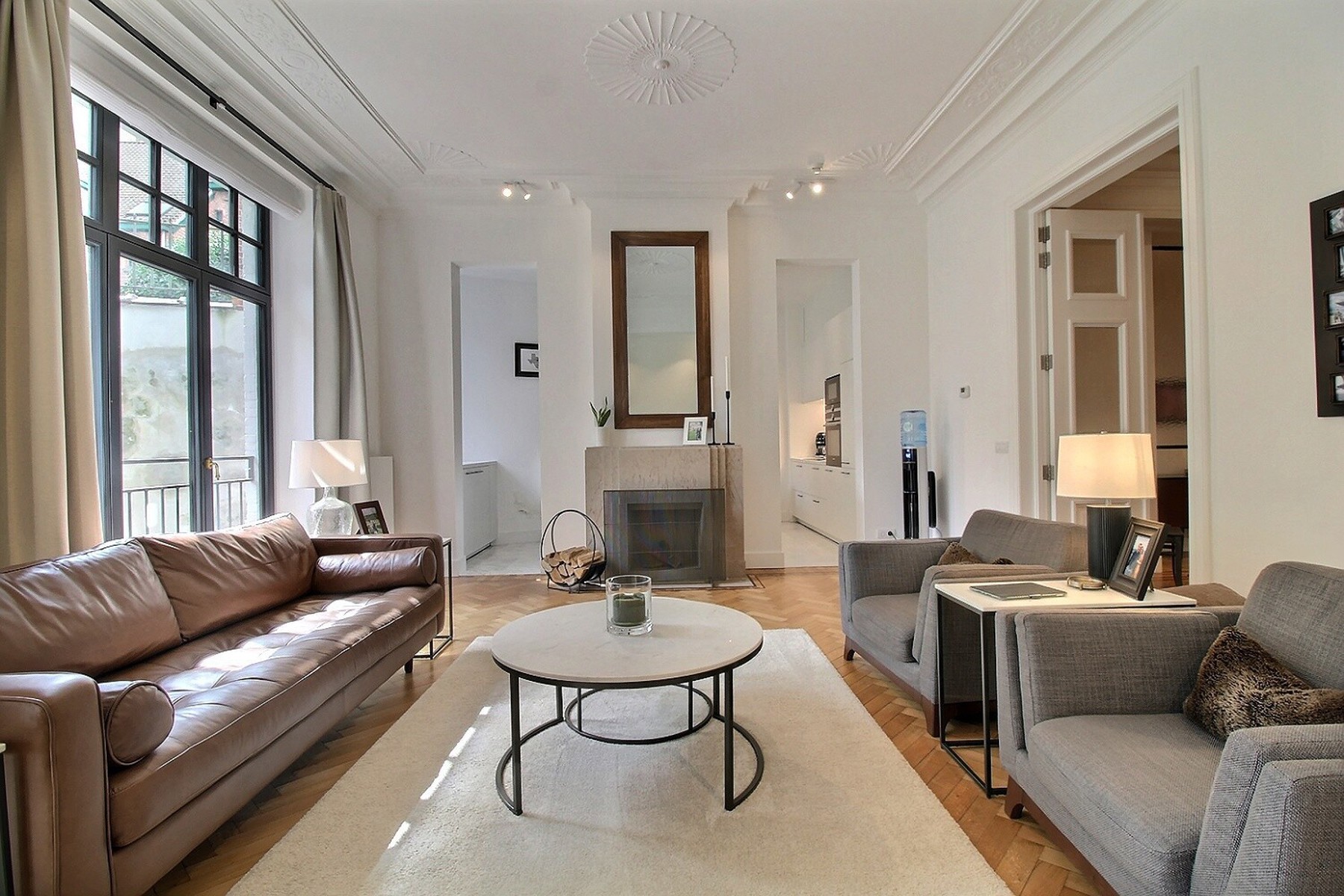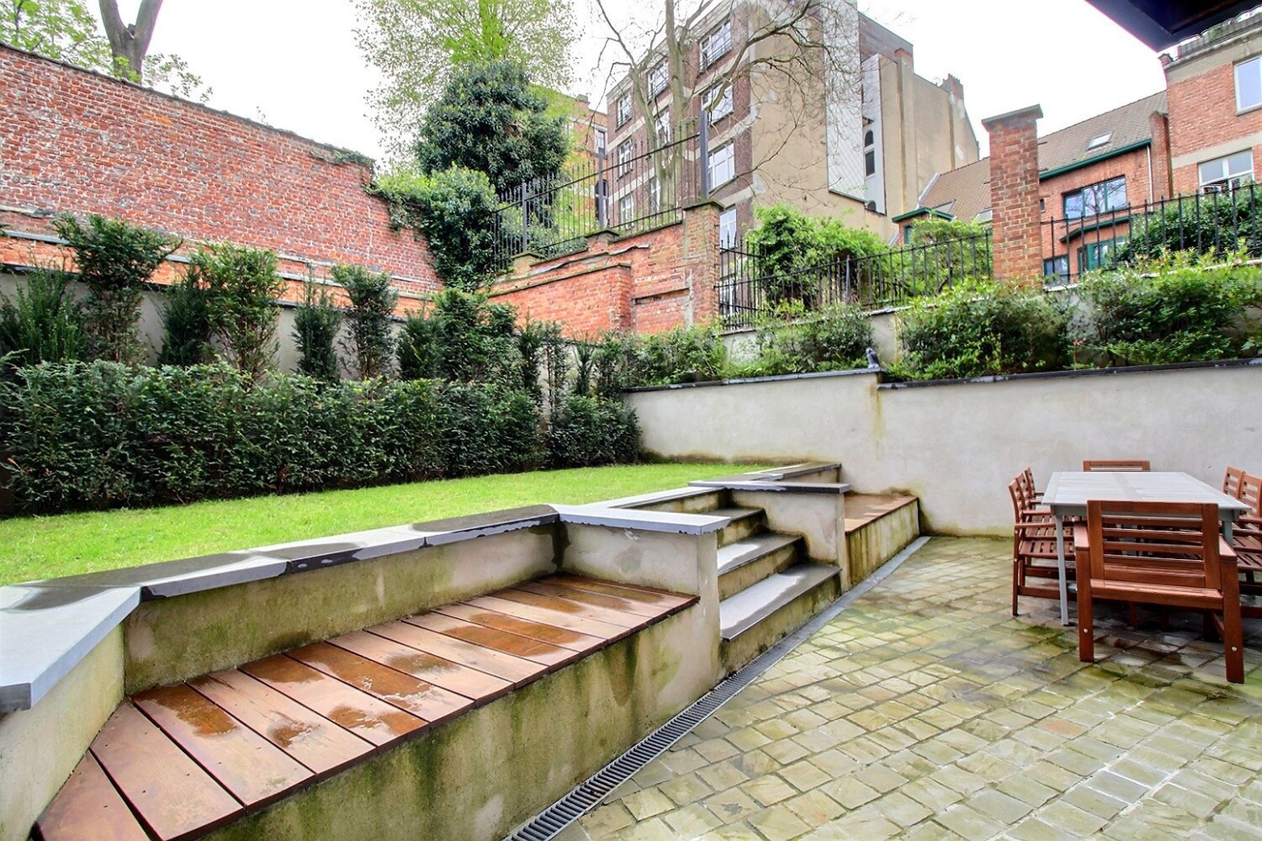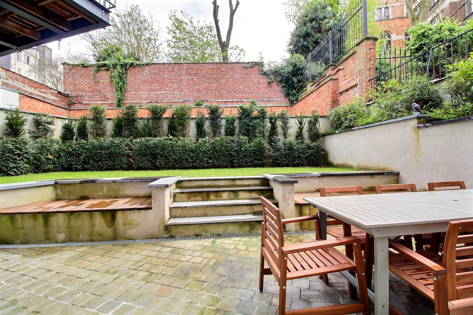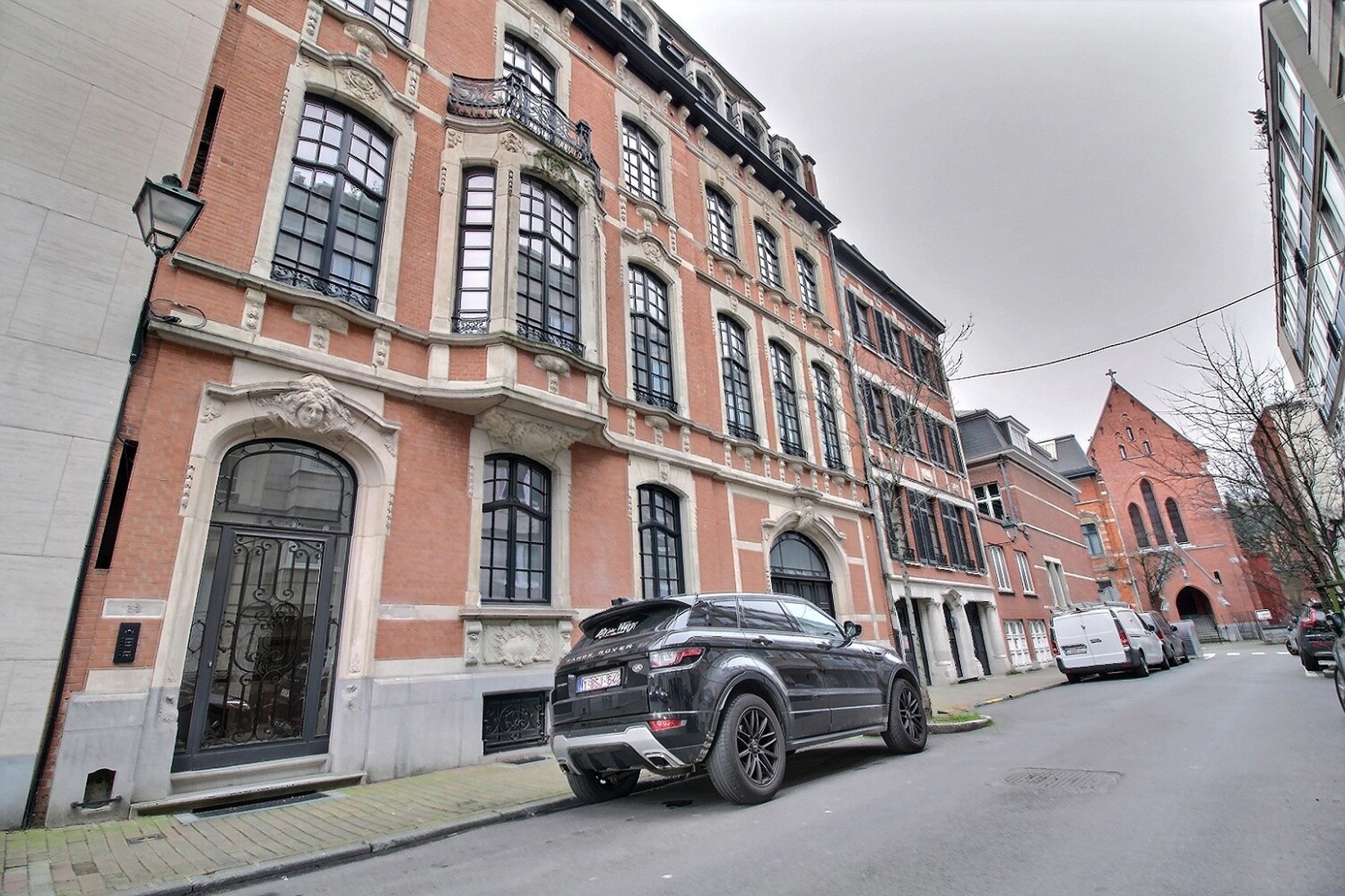 Located in a former mansion built in 1927 by architect Albert De Rudder, completely refurbished in 2021, close to Place Stéphanie, By the Way presents this splendid souplex apartment, completely renovated, of +/- 266m2 (according to EPC). It is located on the ground floor/-1 in a very well-maintained 4-floors building with elevator. Composition : ground floor : closet and separate guest WC, spacious living and dining room with access to the terrace and garden, fully equipped kitchen, two bedrooms, one with access to the garden, dressing room and private shower room, separate bathroom with WC. On the lower floor is the master bedroom with dressing room and en-suite shower room (bath, shower and WC). It gives access to a small outside courtyard. Large laundry room and cellar. Large garage with access from the apartment. Alarm system. EPC : E-. Charges : 250€/month (provision for common areas). Water, heating and electricity are individual charges. Available now.