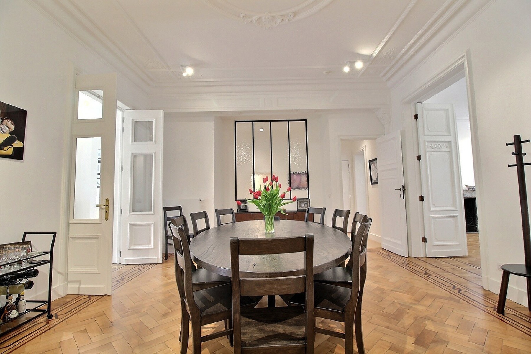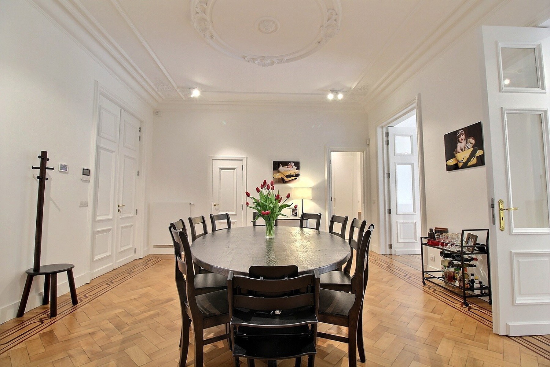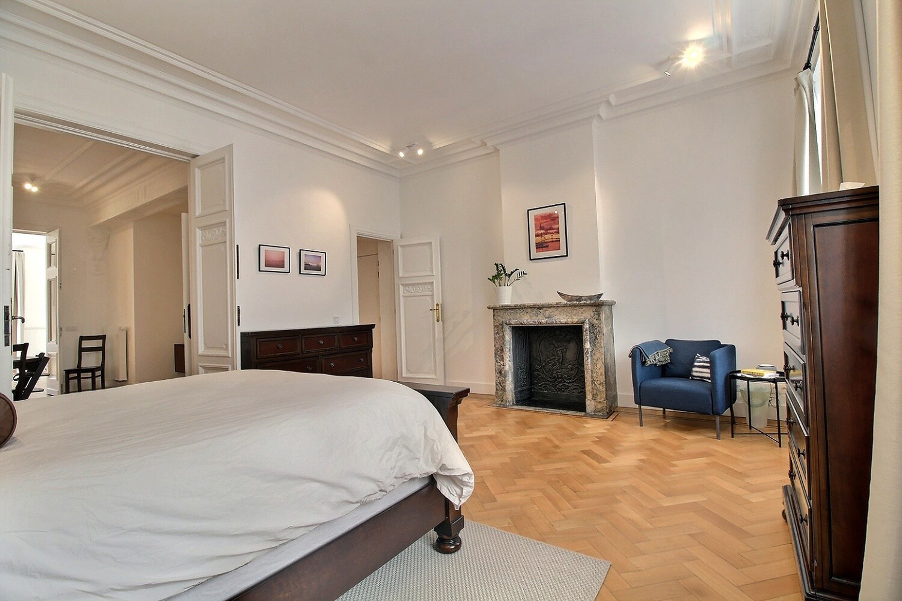 Located in a former mansion built in 1927 by architect Albert De Rudder, completely refurbished in 2021, close to Place Stéphanie, By the Way presents this splendid souplex apartment, completely renovated, of +/- 266m2 (according to EPC). It is located on the ground floor/-1 in a very well-maintained 4-floors building with elevator. Composition : ground floor : closet and separate guest WC, spacious living and dining room with access to the terrace and garden, fully equipped kitchen, two bedrooms, one with access to the garden, dressing room and private shower room, separate bathroom with WC. On the lower floor is the master bedroom with dressing room and en-suite shower room (bath, shower and WC). It gives access to a small outside courtyard. Large laundry room and cellar. Large garage with access from the apartment. Alarm system. EPC : E-. Charges : 250€/month (provision for common areas). Water, heating and electricity are individual charges. Available now.