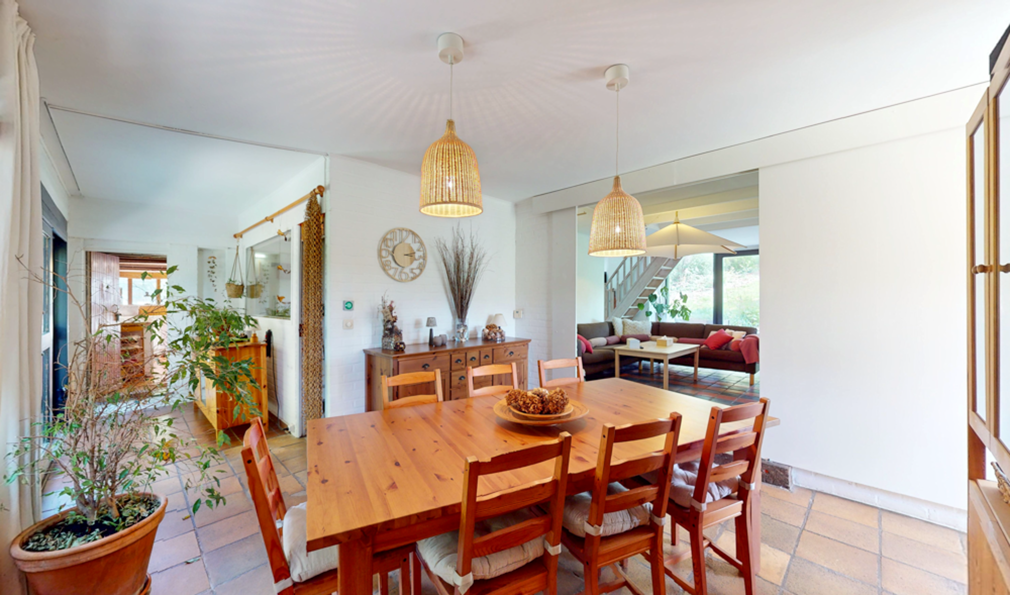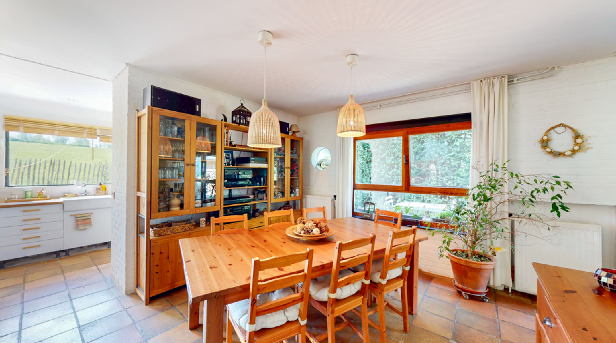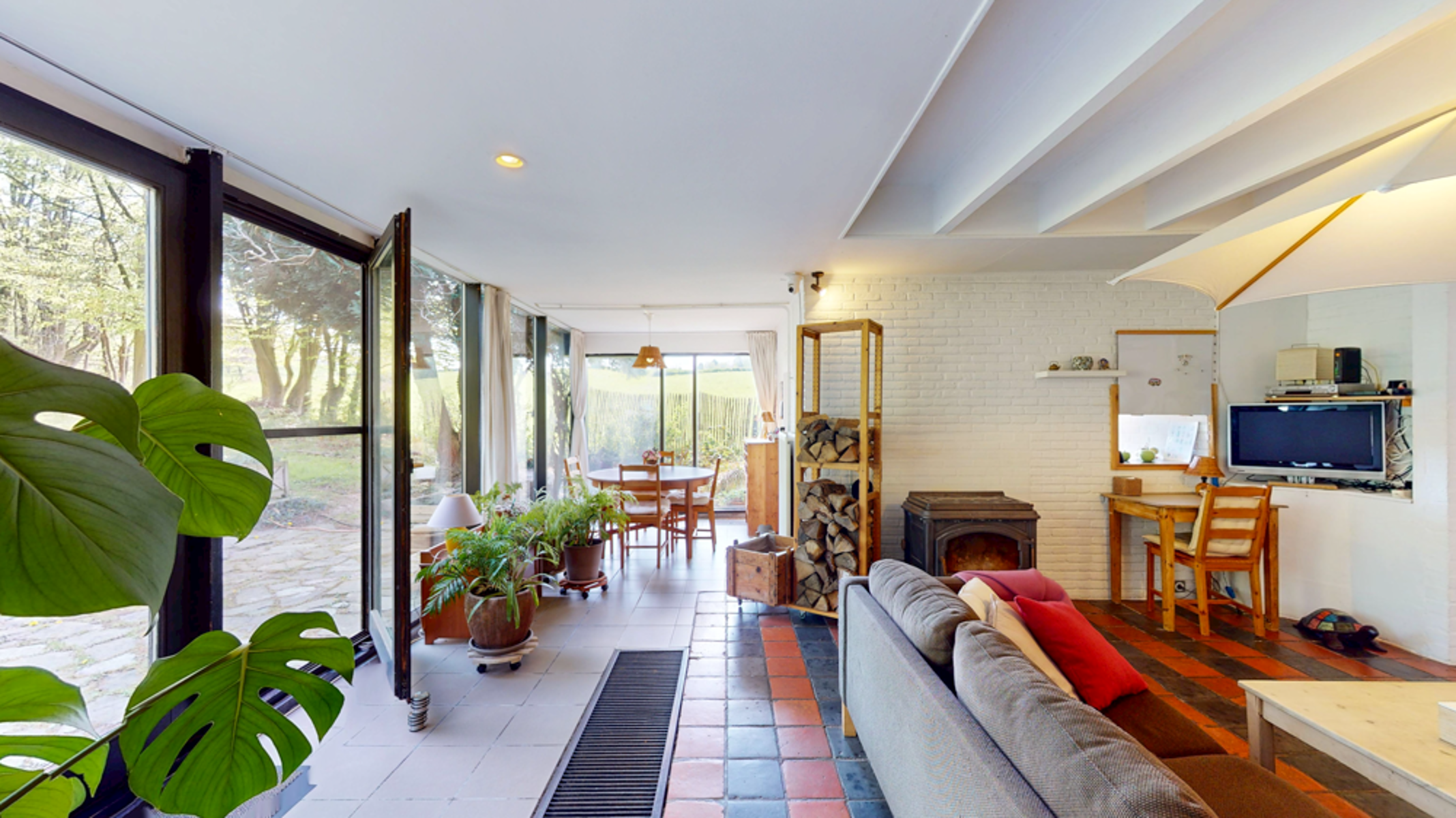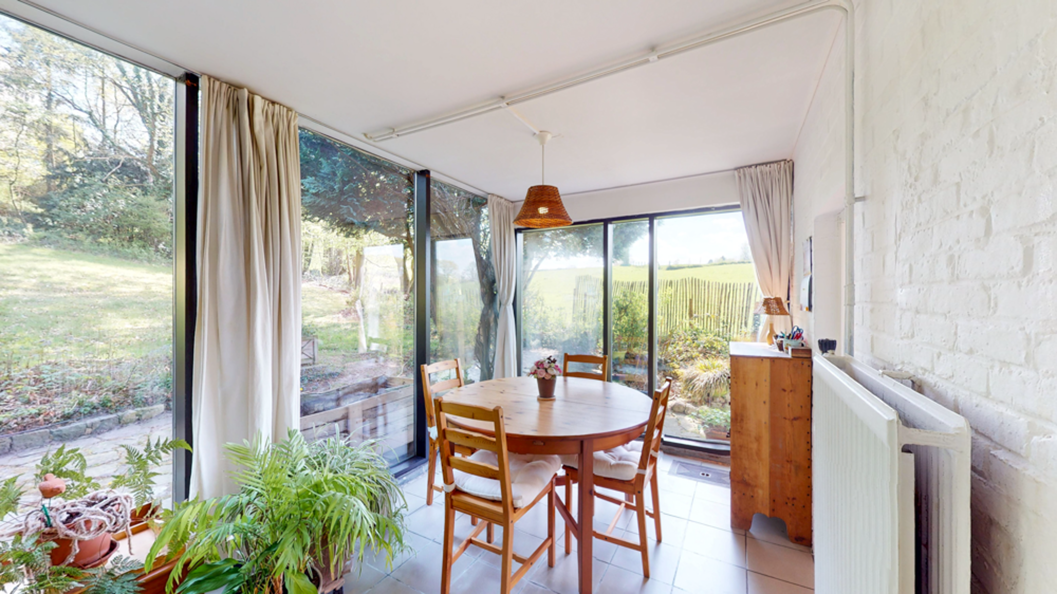 Nestled at the end of a lane and surrounded by nature, this three-bedroom, two-bathroom house is composed as follows: the entrance hall leads to the living room, comprising a sitting room with a wood-burning stove and a breakfast area. A bright kitchen with uninterrupted views over the fields leads to a large dining room, which can also be accessed from the living room.