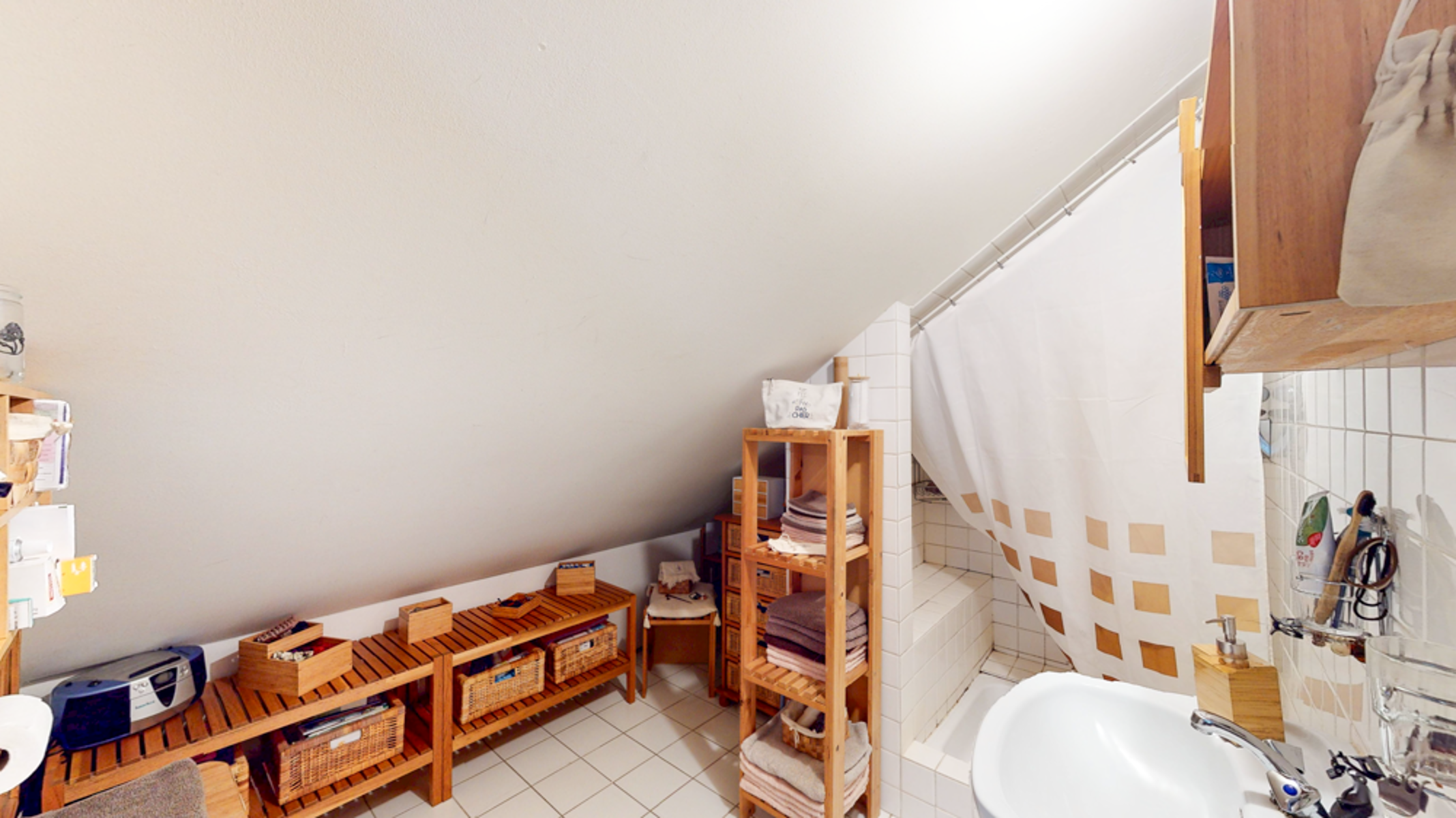 On the other side of the entrance hall are two bedrooms (9 m² and 13 m²), a bathroom with shower, bath and washbasin and a separate toilet.