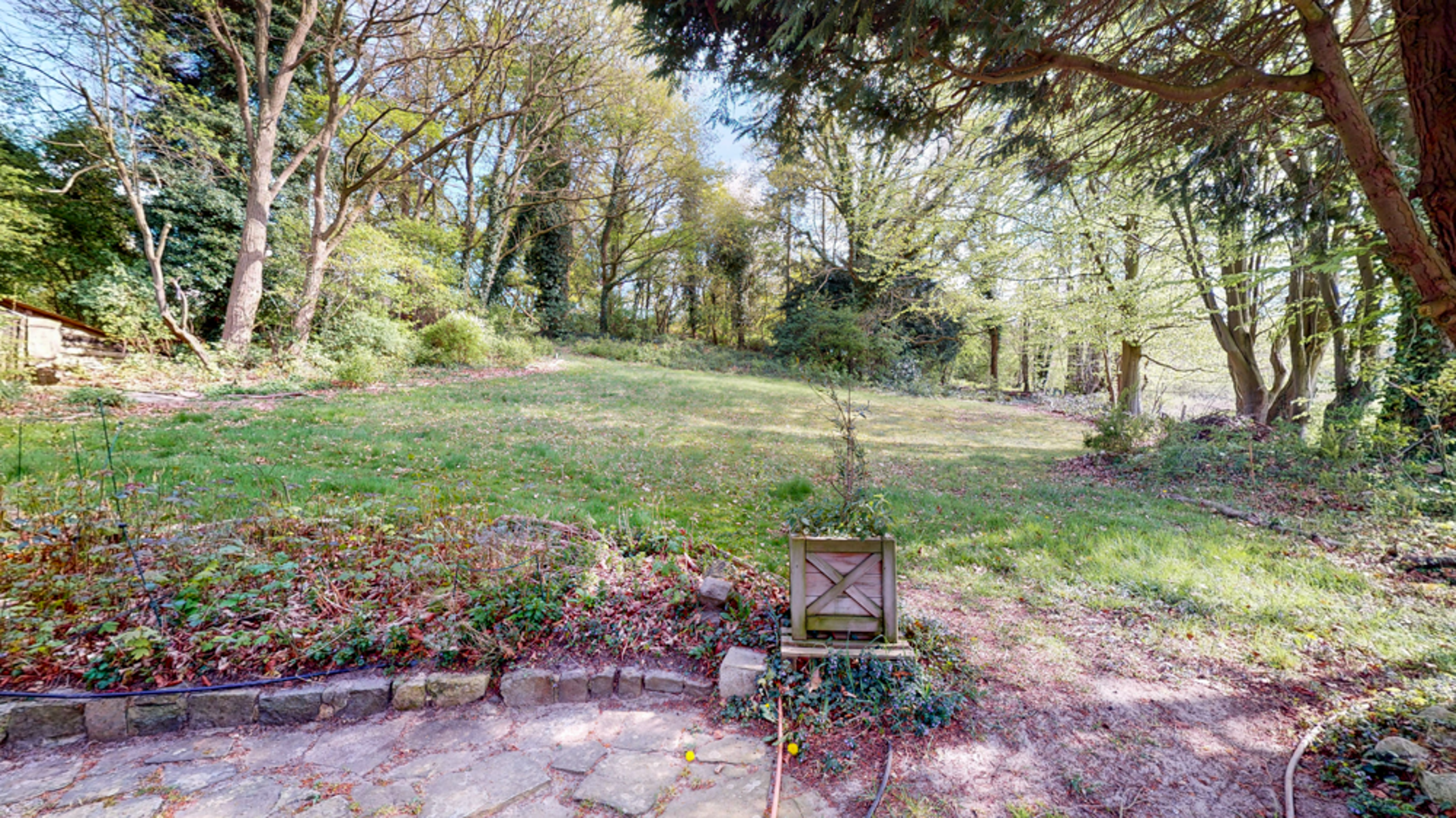 A south-east-facing garden borders the surrounding fields. There is a shed in the garden for storing equipment.