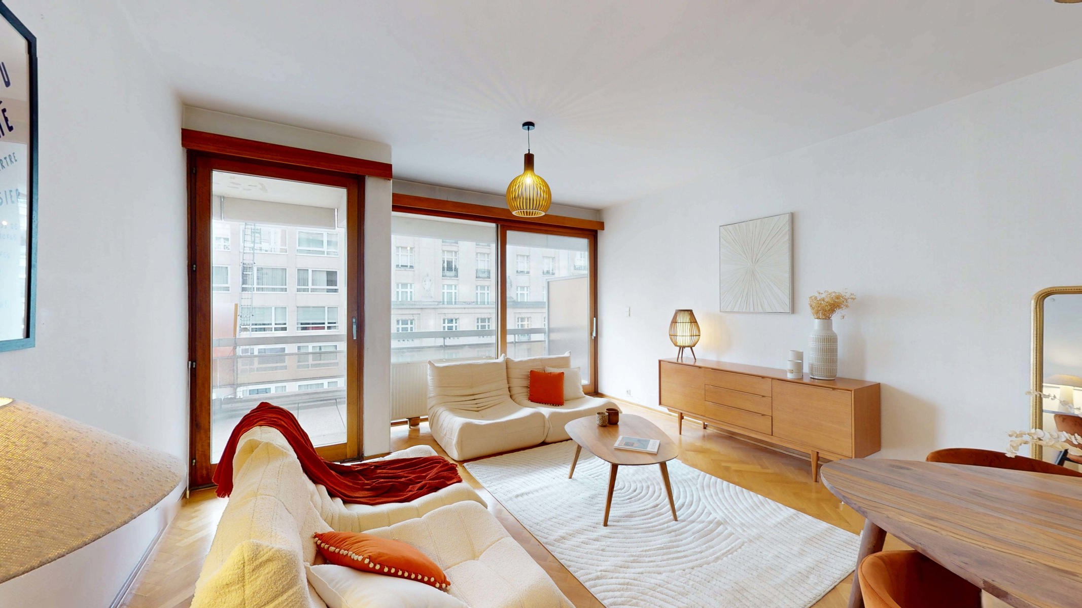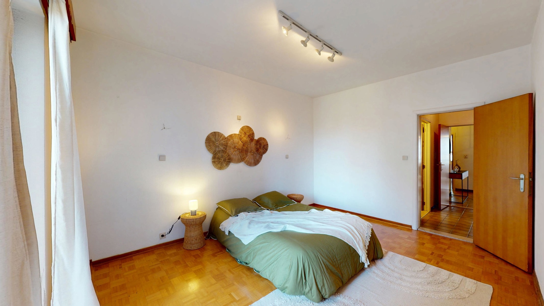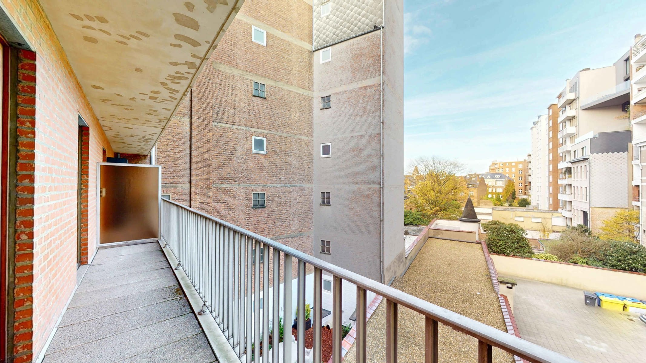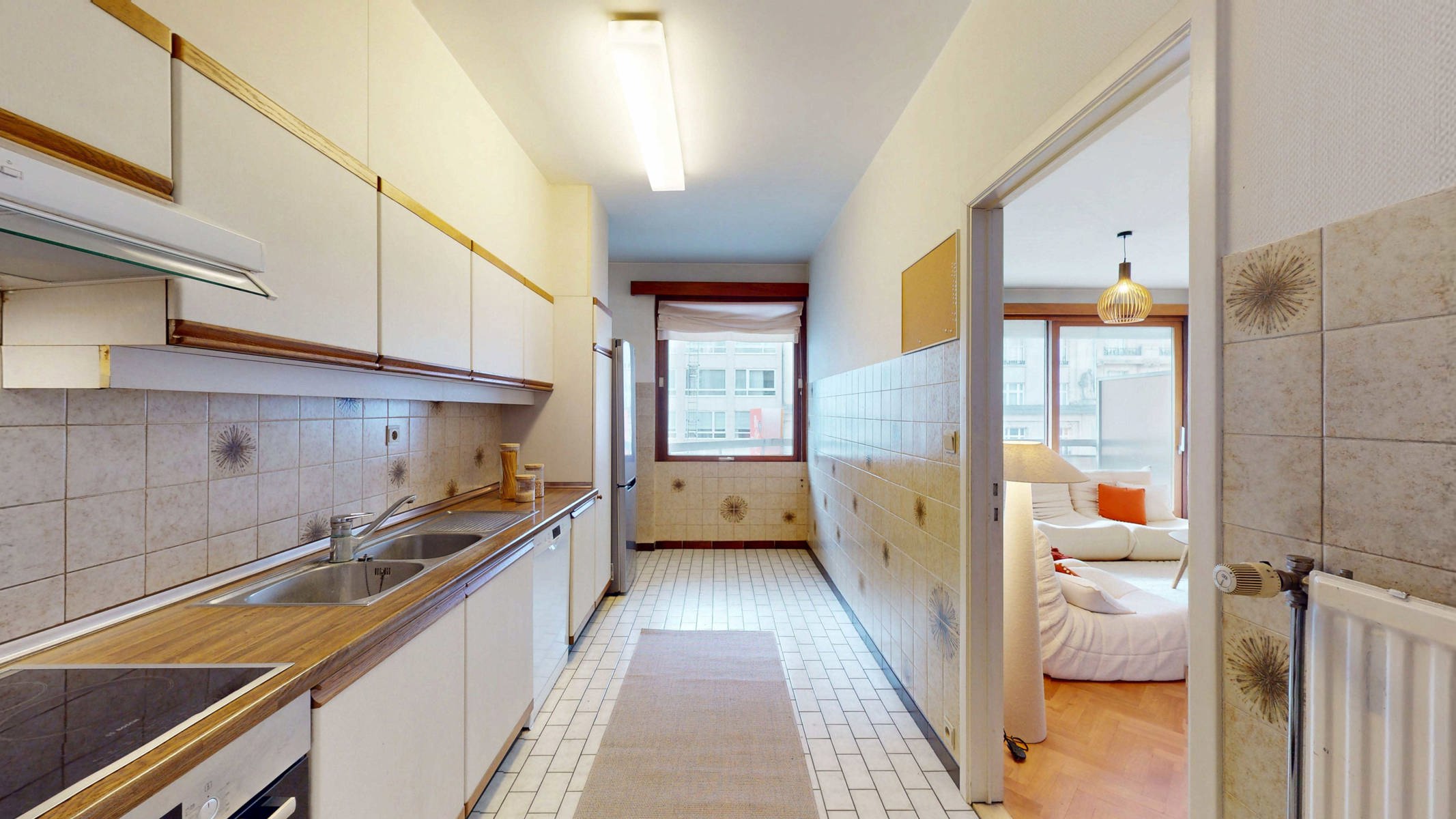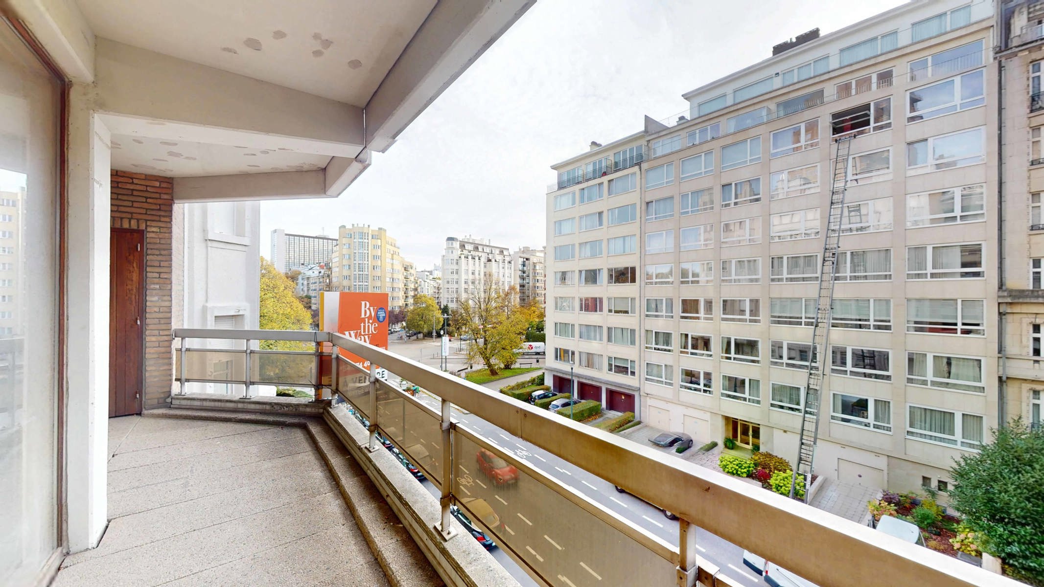 IXELLES – Étangs d’Ixelles district, between the gardens of the Abbey of La Cambre and the Bois de la Cambre, By the Way presents a flat on the 4th floor (right) with a lift providing direct private access, in a small co-ownership of 16 flats over 8 storeys. This dual-aspect flat of approx. 106 m² gross (according to EPC) is set in a cul-de-sac and enjoys, at the front, an open, unobstructed view with very little overlooking and, at the rear, a quiet inner courtyard. The property, in need of renovation, is laid out as follows: entrance hall with cloakroom, guest WC, bright living room with direct access to a front terrace facing south-west, spacious adjoining kitchen, first night hall with dressing area, shower room and first bedroom opening onto a rear balcony. Second night hall with dressing area, second bedroom and bathroom. Numerous bespoke storage units and a cellar of approx. 3 m² complete the offer. Service charges: approx. €350/month, including cleaning of the common areas, rubbish collection, water and electricity for the common parts, managing agent’s fees, lift, as well as advance payments for private heating and hot water consumption. Technical details: EPC rating C- (valid until 06/11/2035), wooden double-glazed windows, communal Ferroli gas boiler (2005), electrical installation not compliant, reinforced security door, entry phone / video phone, solid wood flooring and extensive built-in storage.