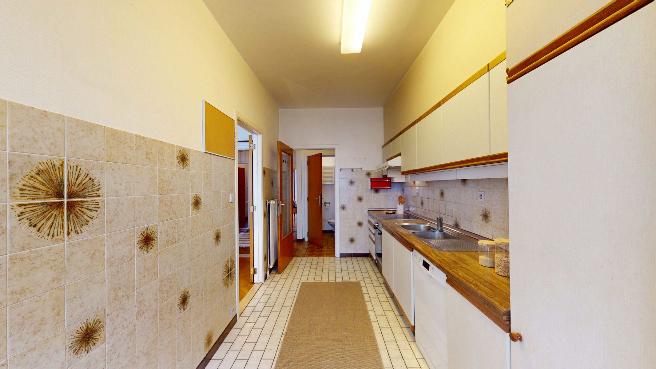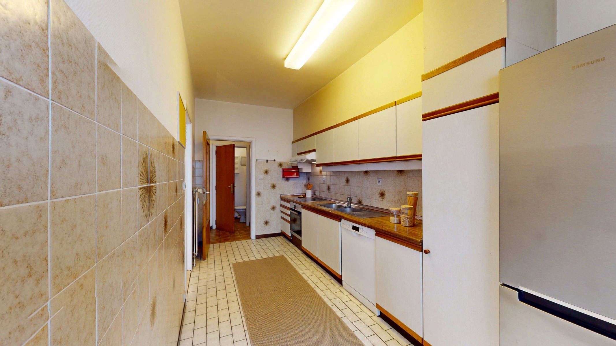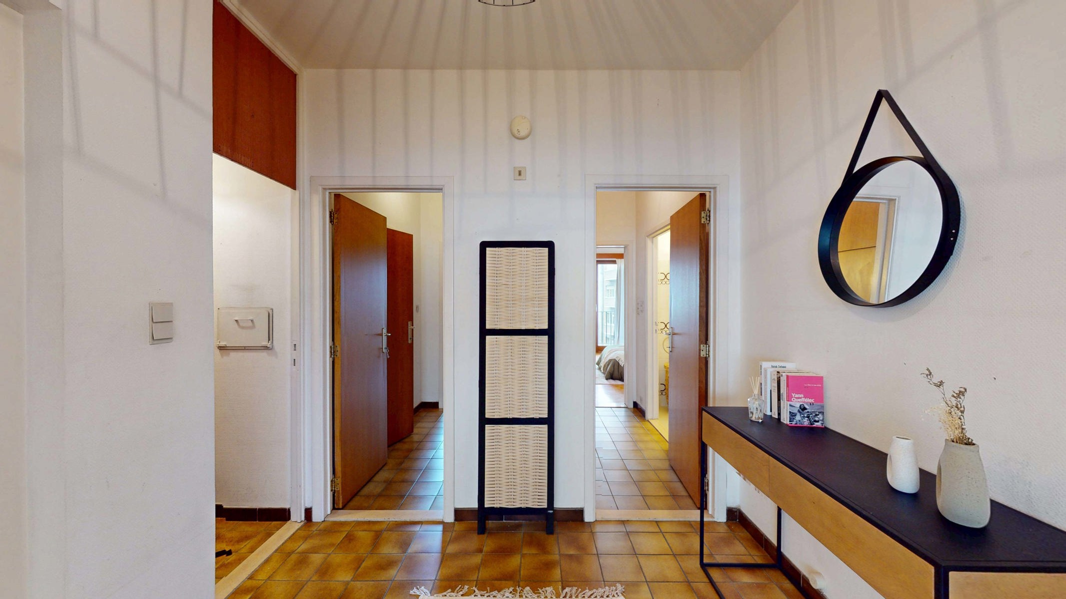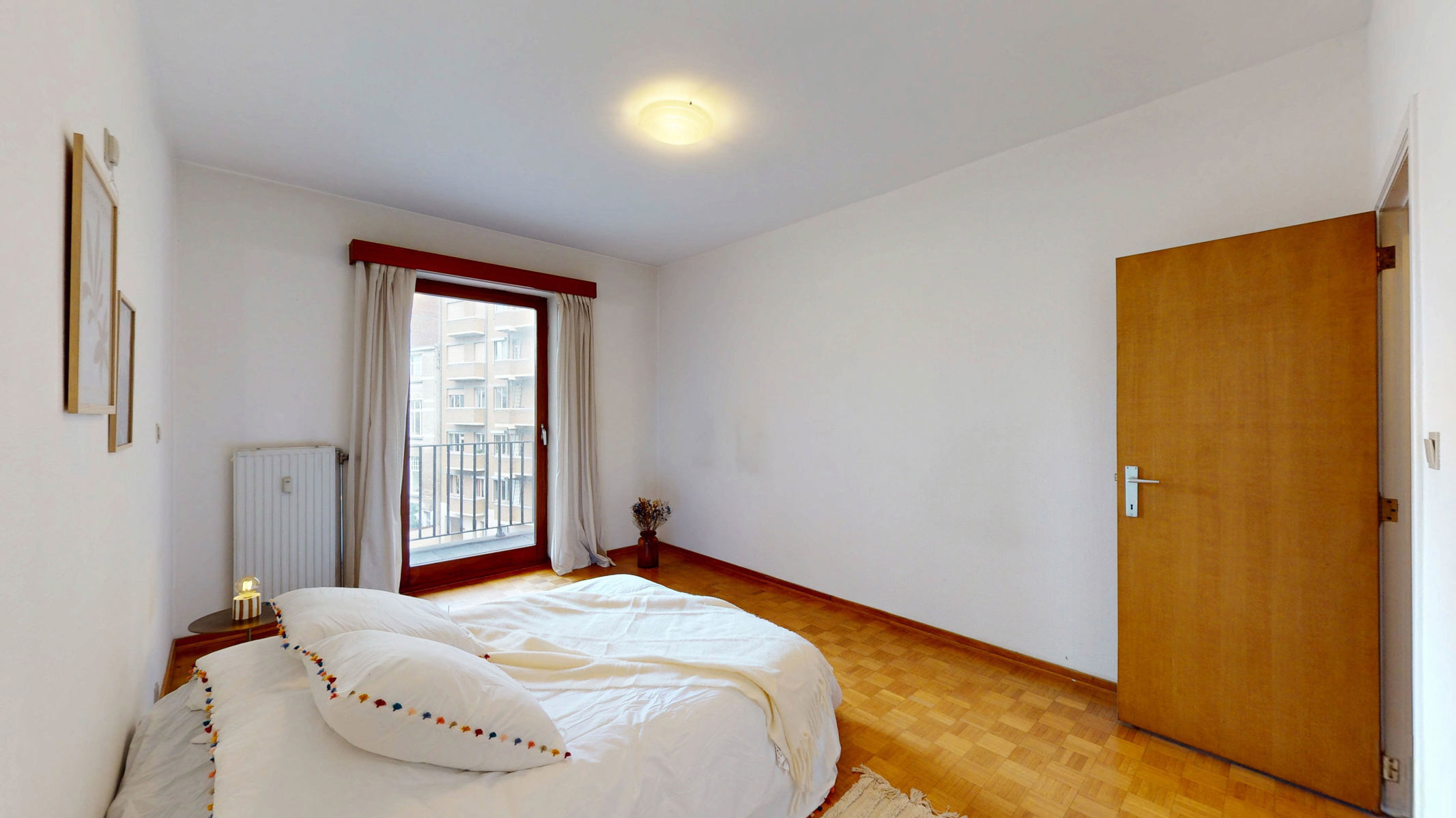 IXELLES – Étangs d’Ixelles district, between the gardens of the Abbey of La Cambre and the Bois de la Cambre, By the Way presents a flat on the 4th floor (right) with a lift providing direct private access, in a small co-ownership of 16 flats over 8 storeys. This dual-aspect flat of approx. 106 m² gross (according to EPC) is set in a cul-de-sac and enjoys, at the front, an open, unobstructed view with very little overlooking and, at the rear, a quiet inner courtyard. The property, in need of renovation, is laid out as follows: entrance hall with cloakroom, guest WC, bright living room with direct access to a front terrace facing south-west, spacious adjoining kitchen, first night hall with dressing area, shower room and first bedroom opening onto a rear balcony. Second night hall with dressing area, second bedroom and bathroom. Numerous bespoke storage units and a cellar of approx. 3 m² complete the offer. Service charges: approx. €350/month, including cleaning of the common areas, rubbish collection, water and electricity for the common parts, managing agent’s fees, lift, as well as advance payments for private heating and hot water consumption. Technical details: EPC rating C- (valid until 06/11/2035), wooden double-glazed windows, communal Ferroli gas boiler (2005), electrical installation not compliant, reinforced security door, entry phone / video phone, solid wood flooring and extensive built-in storage.