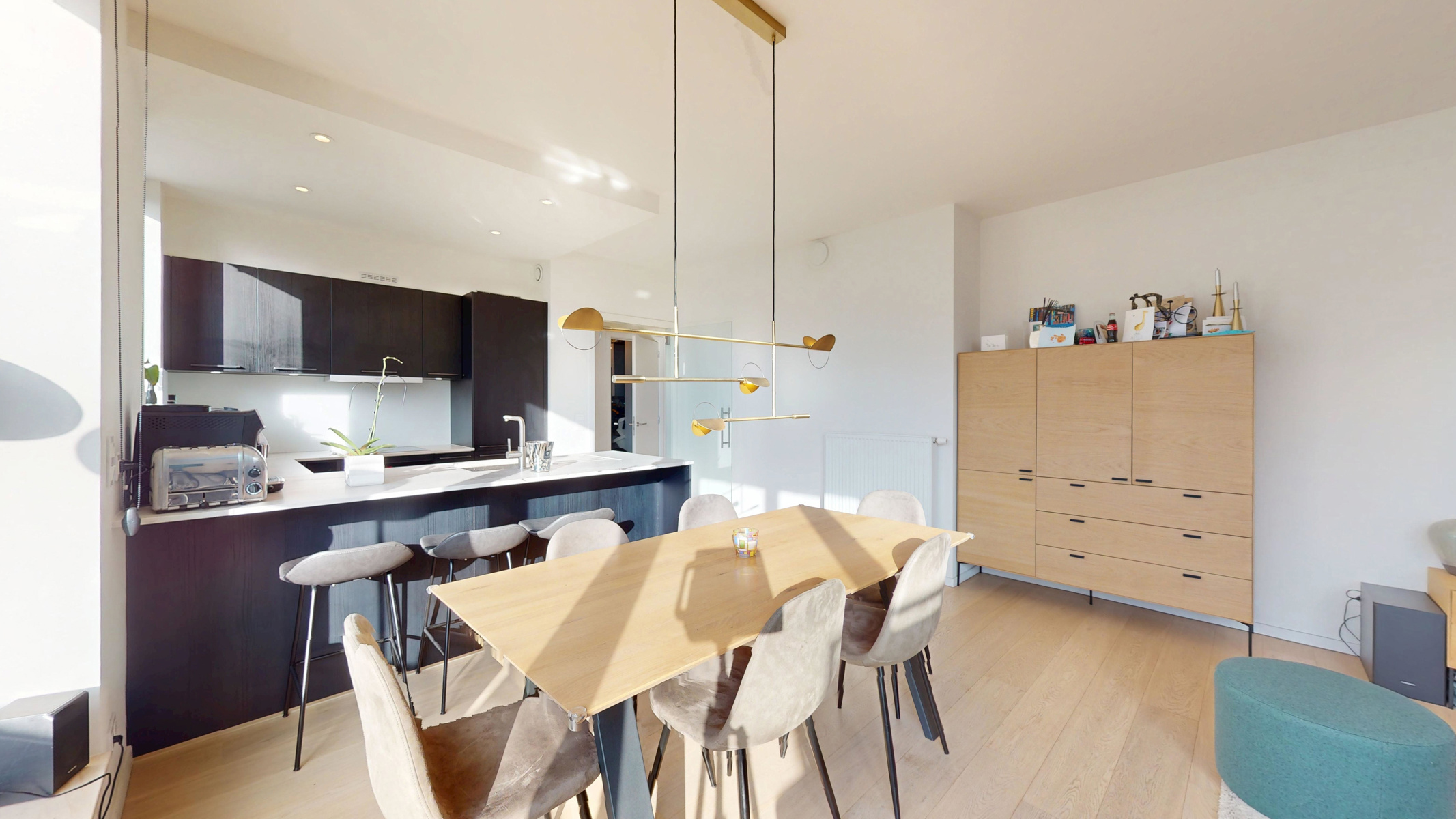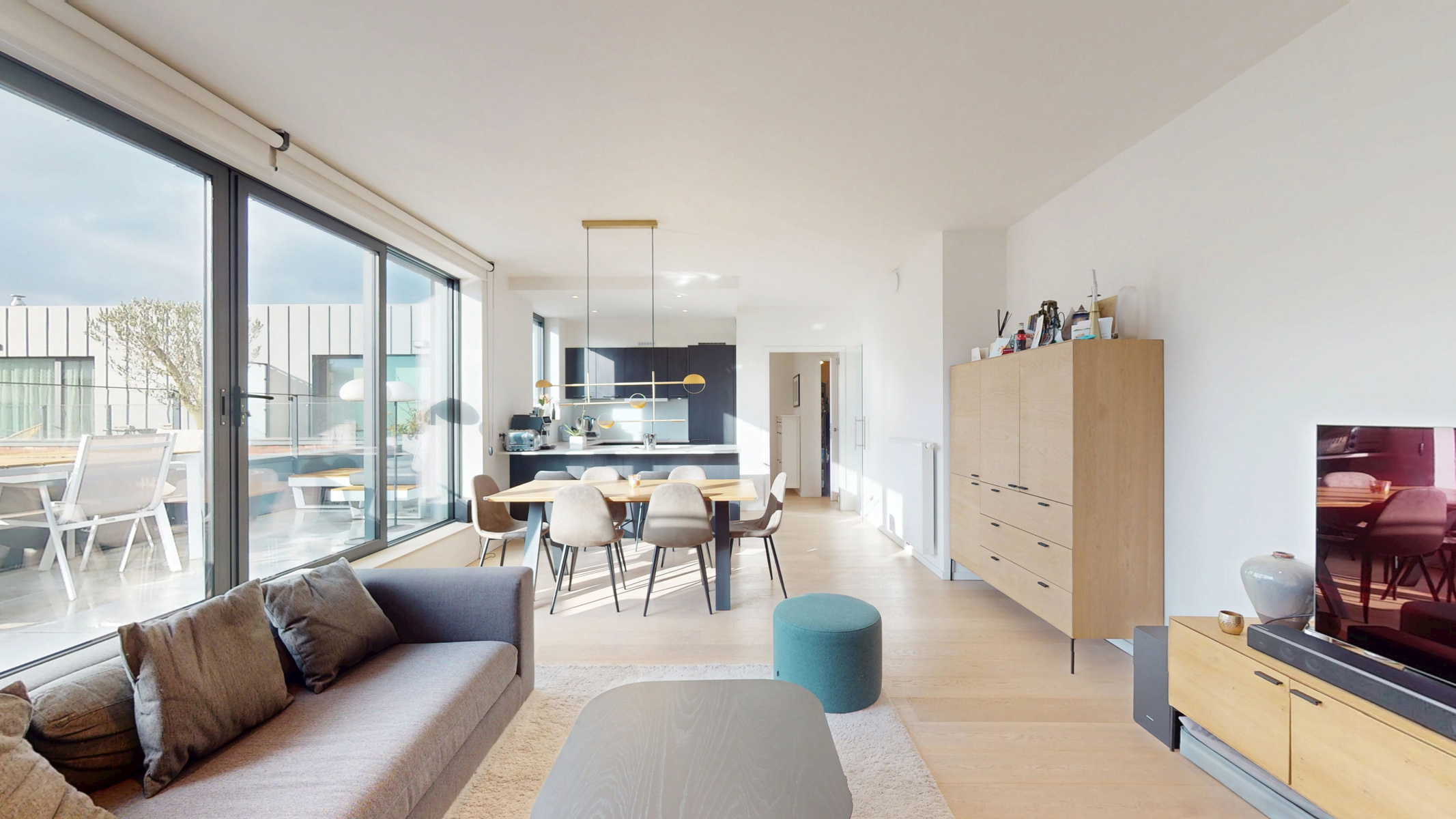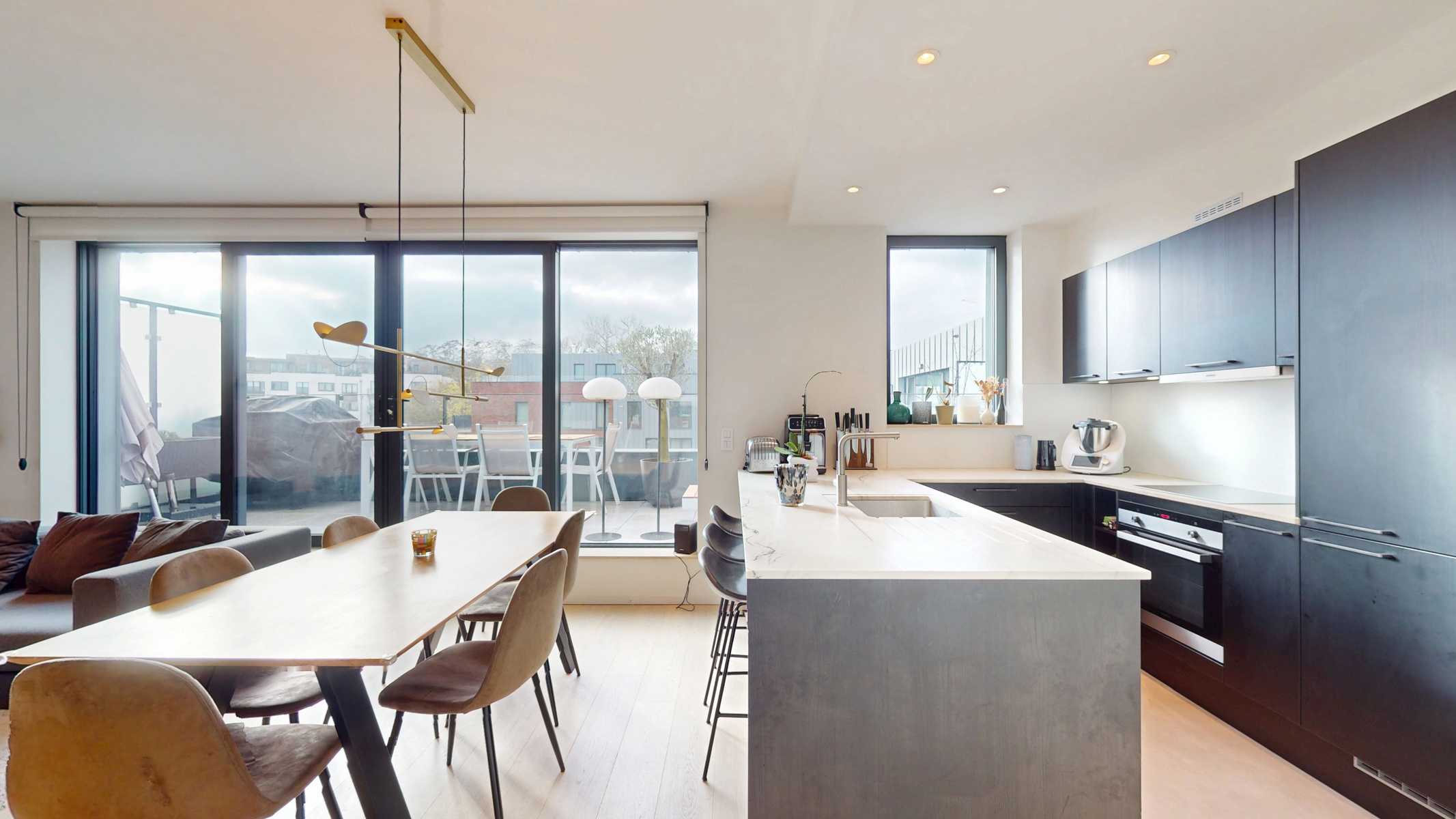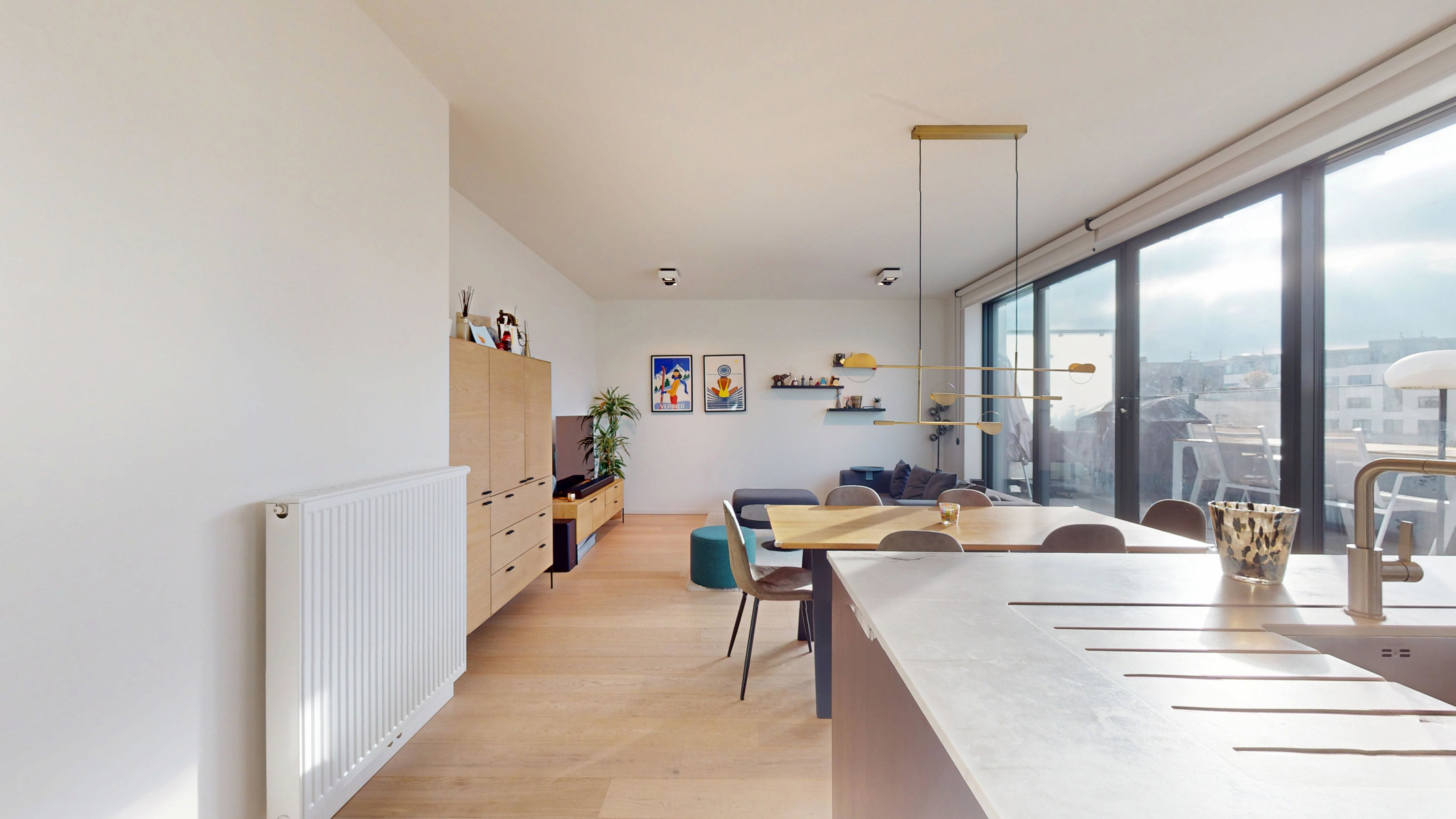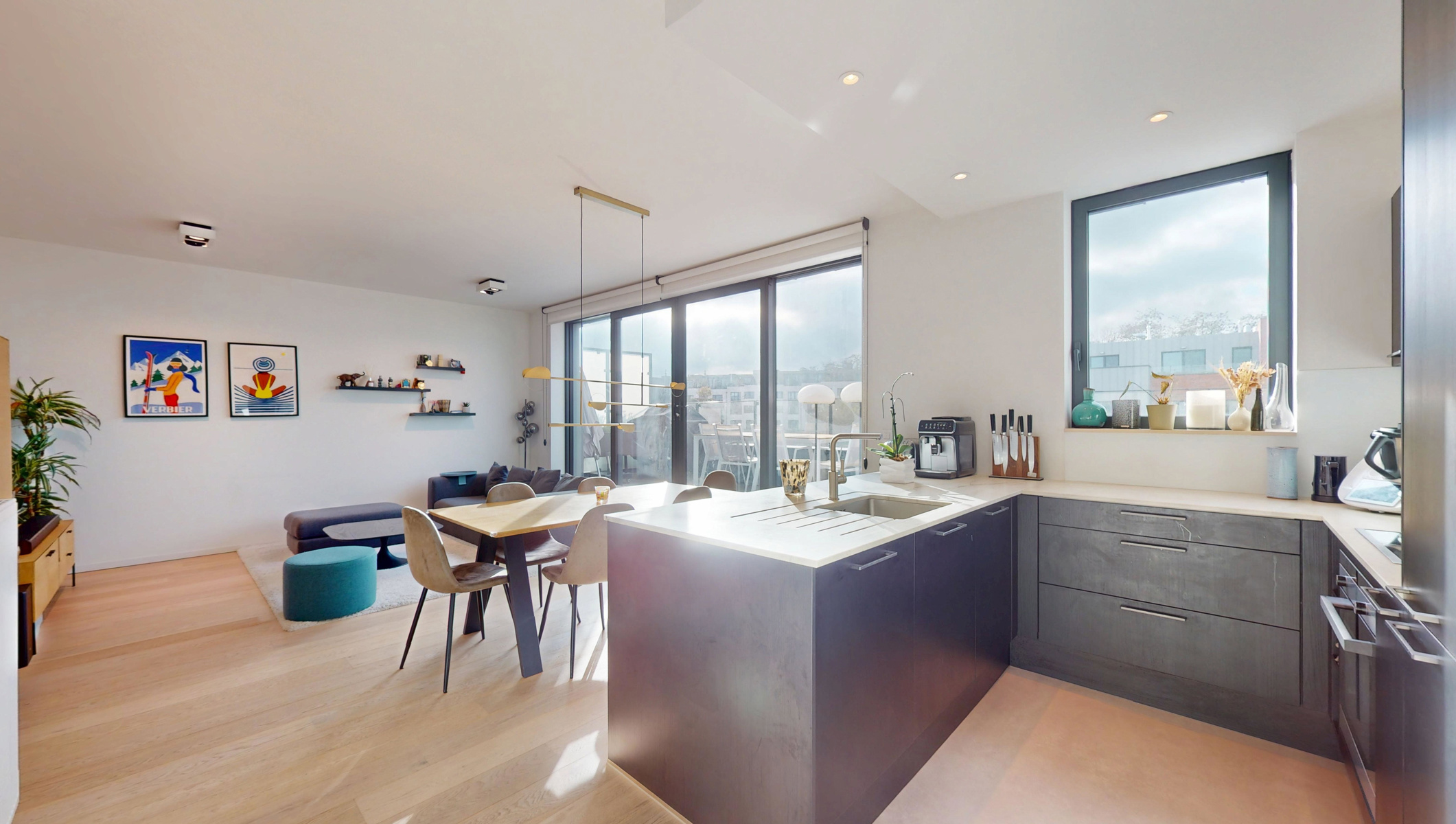 Located near Calvoet station in Uccle, with its transport links and shops, By The Way offers this bright PENTHOUSE apartment of approximately 98 m² gross (according to PEB). Located on the 4th floor with lift in a new, rapidly developing green neighbourhood. Accessible from the alleyway via its private entrance, this top floor apartment with high-end finishes is surrounded by two private terraces and is composed as follows: an entrance hall, living room of +/- 34m² including a fully equipped open-plan kitchen, a hallway leading to a master bedroom of +/-14.50m² with en-suite bathroom, a second bedroom of +/- 11m² with en-suite shower room, the hallway also gives access to a laundry room and a separate WC. This building has a secure bicycle storage room. Indoor parking space is compulsory and available at an additional cost (€30,000). MISCELLANEOUS: PEB A-, electricity compliant, dual-flow CMV, individual gas boiler. Individual water/electricity meters, triple-glazed windows, thermal and sound insulation. Common charges (insurance, maintenance, property management, reserve fund) of approximately €225.61/month.