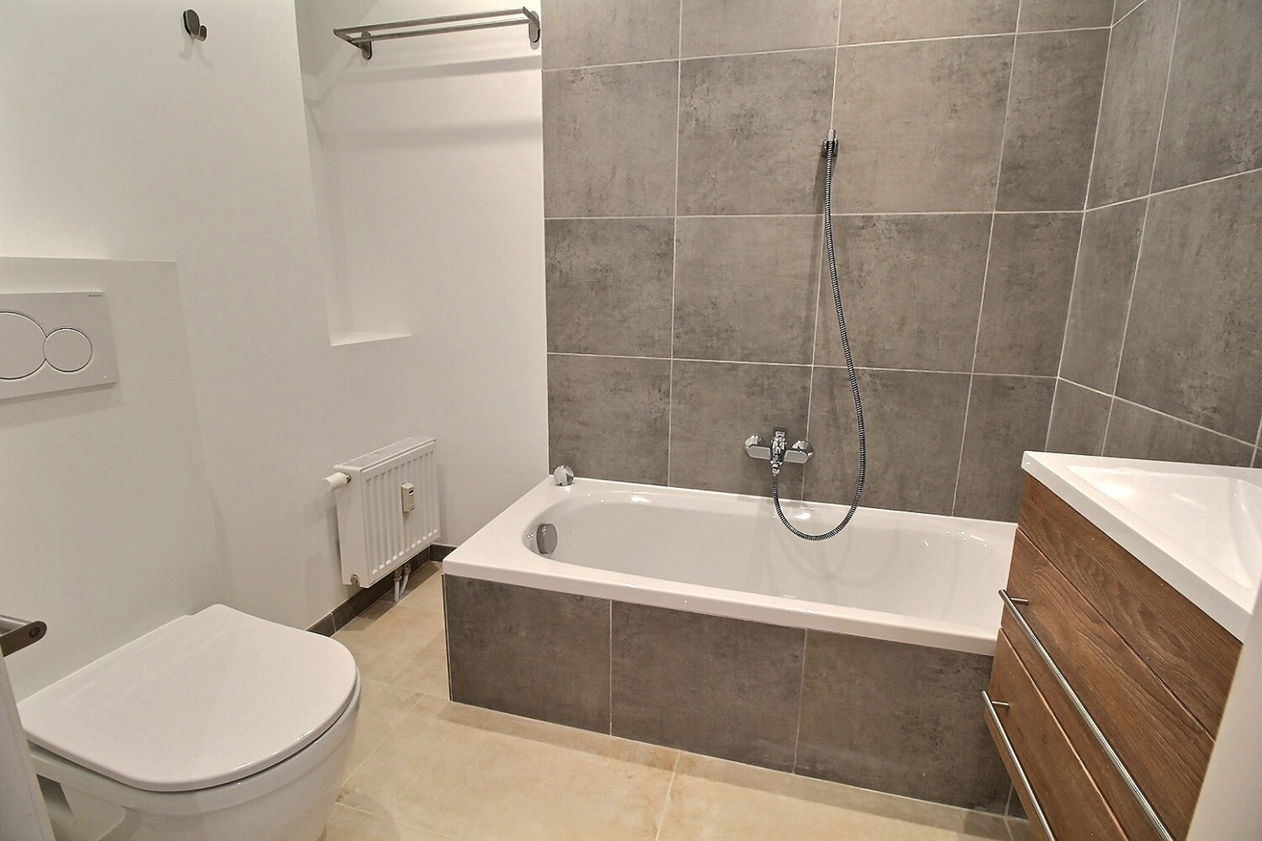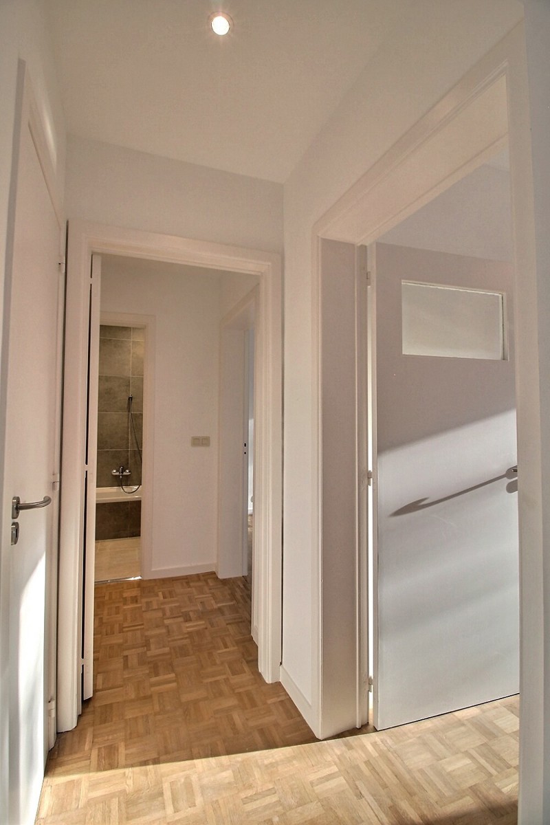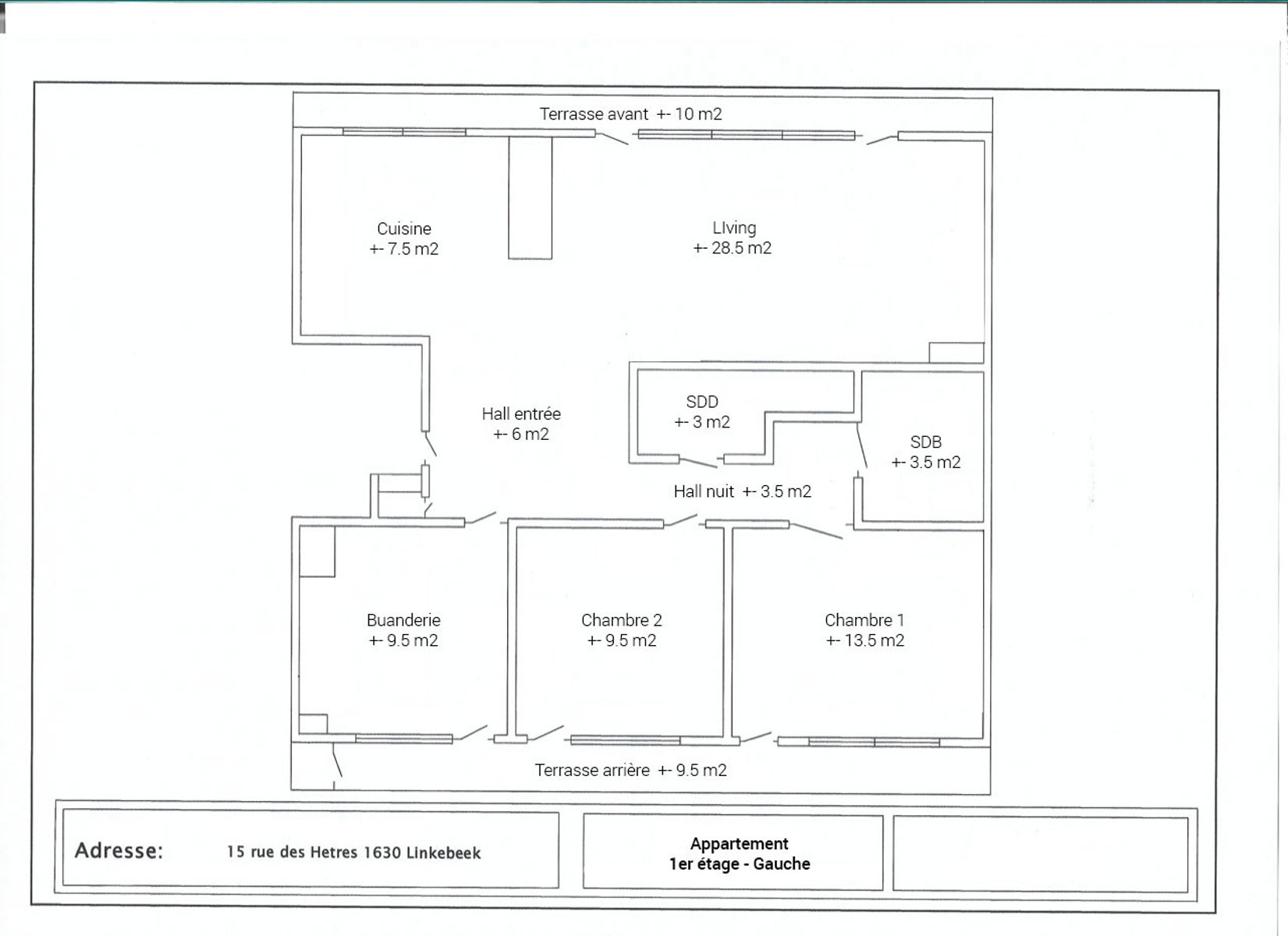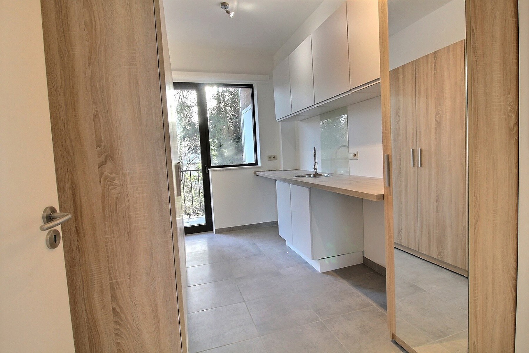 Located in a quiet dead-end street just 850 m from Linkebeek station and town centre, By The Way presents this apartment of approx. 95 m² net surface, featuring 2 bedrooms and 2 bathrooms, situated on the first floor with an elevator in a peaceful 7-unit condominium. The apartment, offering excellent energy performance (EPC A), underwent a complete renovation in 2024. Layout: spacious entrance hall opening onto a 36 m² living room with open-plan kitchen, front terrace running along the entire width of the living area, and a large laundry room/dressing. The night hall leads to a master bedroom of approx. 13 m² with ensuite bathroom and private toilet, and a second bedroom of approx. 10 m² with ensuite shower room and private toilet. Rear terrace running along the full length of the apartment. Charges: provision of €250 including common charges, private heating consumption and hot water. A private cellar is included in the price. Option: closed garage box with automatic sectional door and the possibility to park in front, for €110. Technical features: collective gas condensing boiler with electronic heat allocators, double-flow ventilation system, aluminium double-glazed windows, solid wood flooring, security door, fitted kitchen with oven, dishwasher, ceramic hob and fridge with freezer compartment.