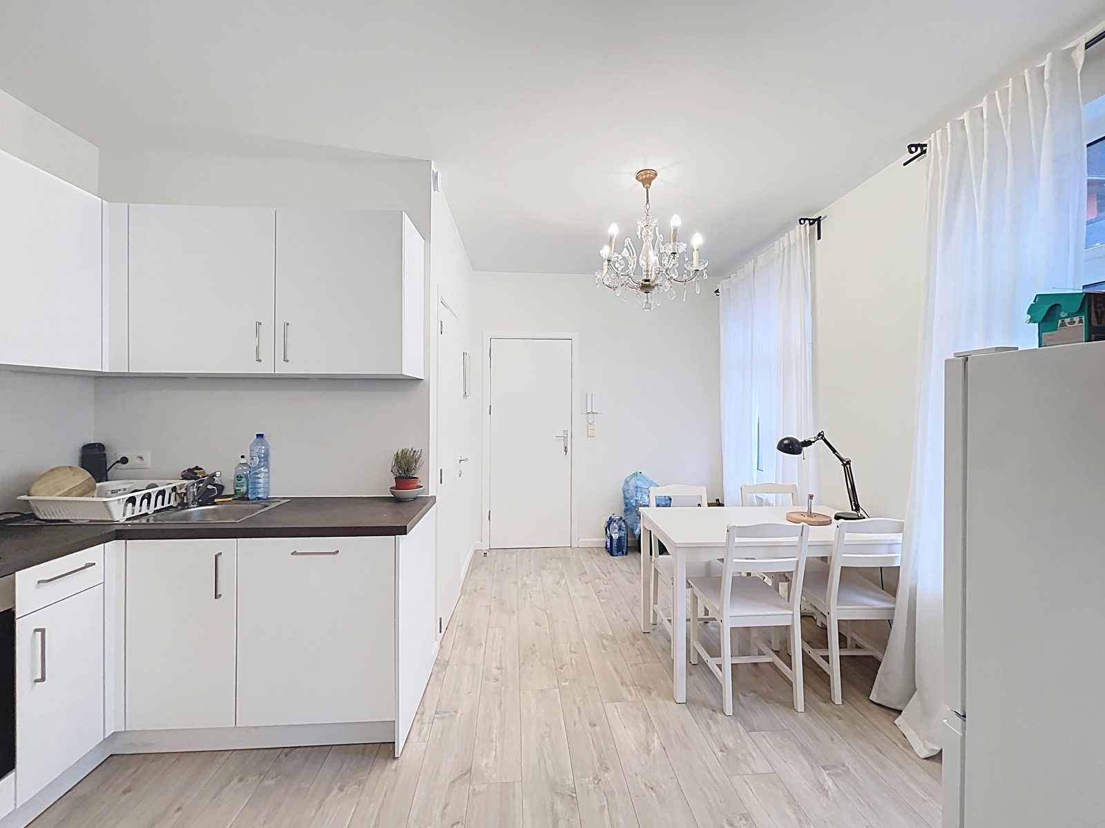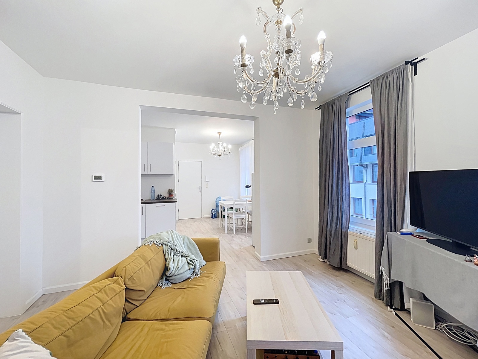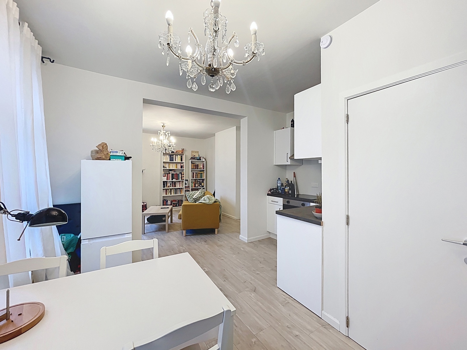 Located in the heart of the Marolles district, just a few steps from Place du Jeu de Balle, By the Way offers this charming unfurnished apartment of approximately 54 m² (according to the EPC), fully renovated, on the 2nd floor of a 3-storey building without an elevator. Layout : living room, dining room, open-plan fully equipped kitchen, large bedroom, and a shower room with WC. Currently rented. Electrical installation compliant. EPC : E. Individual gas boiler. Facade currently under renovation. New co-ownership being created.