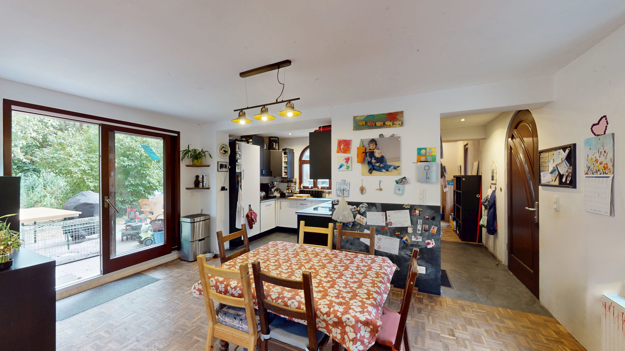 The house is laid out as follows: the entrance hall leads directly to the large living room, which opens onto the fitted kitchen and comprises a lounge area and a dining room. A cloakroom and a separate toilet complete this level. On the first floor, the hallway leads to the bathroom (shower, bath, double sinks and WC), the first bedroom (11m²) and the second bedroom (22m²) at the end of the corridor. A second separate toilet completes this floor. On the second floor, a large storage space could be converted into a third and fourth bedroom.
