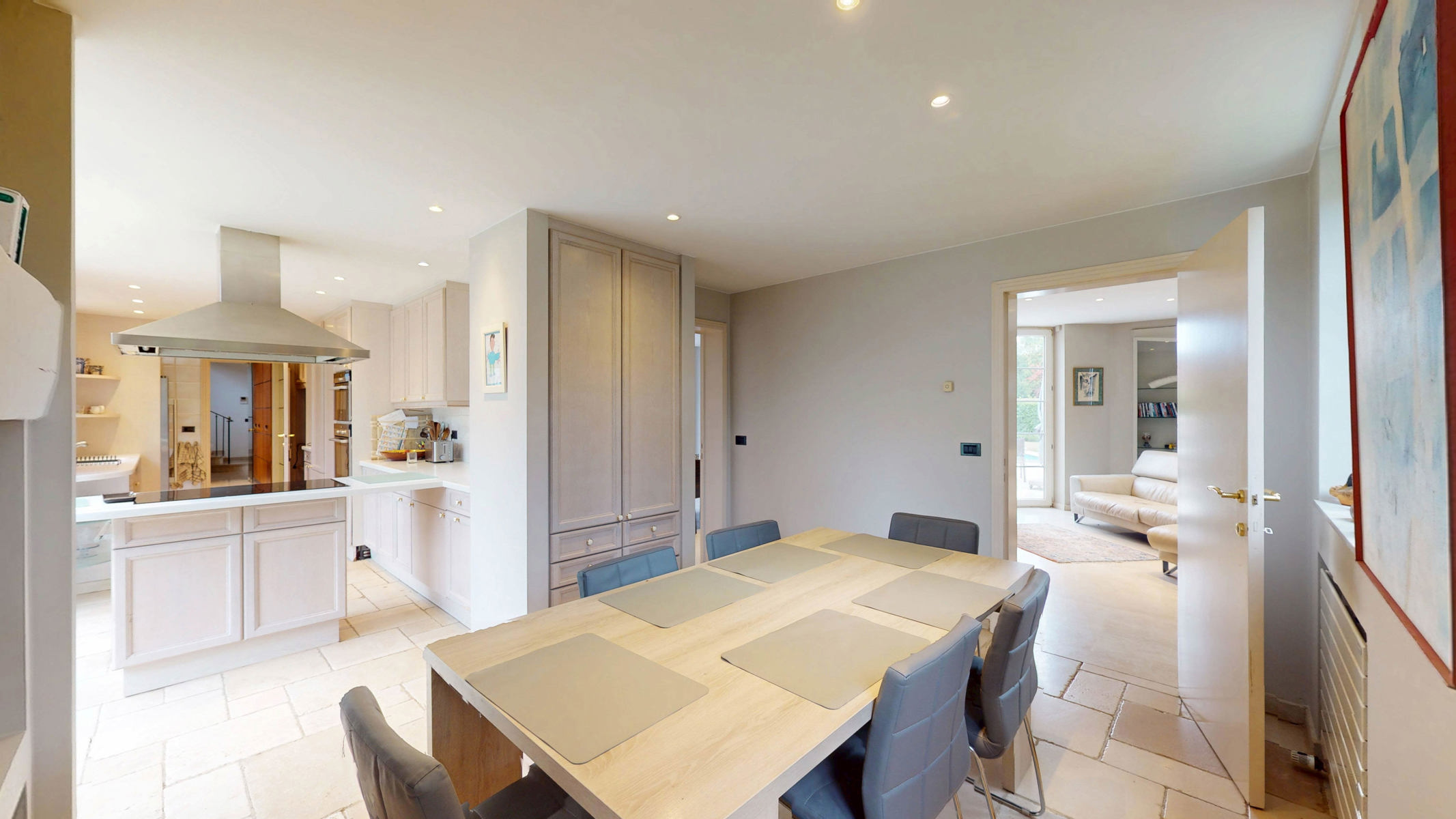 Op de benedenverdieping: ruime inkomhal van ±26 m² met vestiairehoek, toilet en apart wastafeltje, woon- en eetkamer van ±60 m² met open haard die uitkomt op het terras van ±120 m² en de tuin van ± 1900 m² met zwembad, tv-kamer van ±30 m², keuken met eethoek van ±36 m², grote garage voor twee auto’s ± 37 m², 6 parkeerplaatsen buiten.